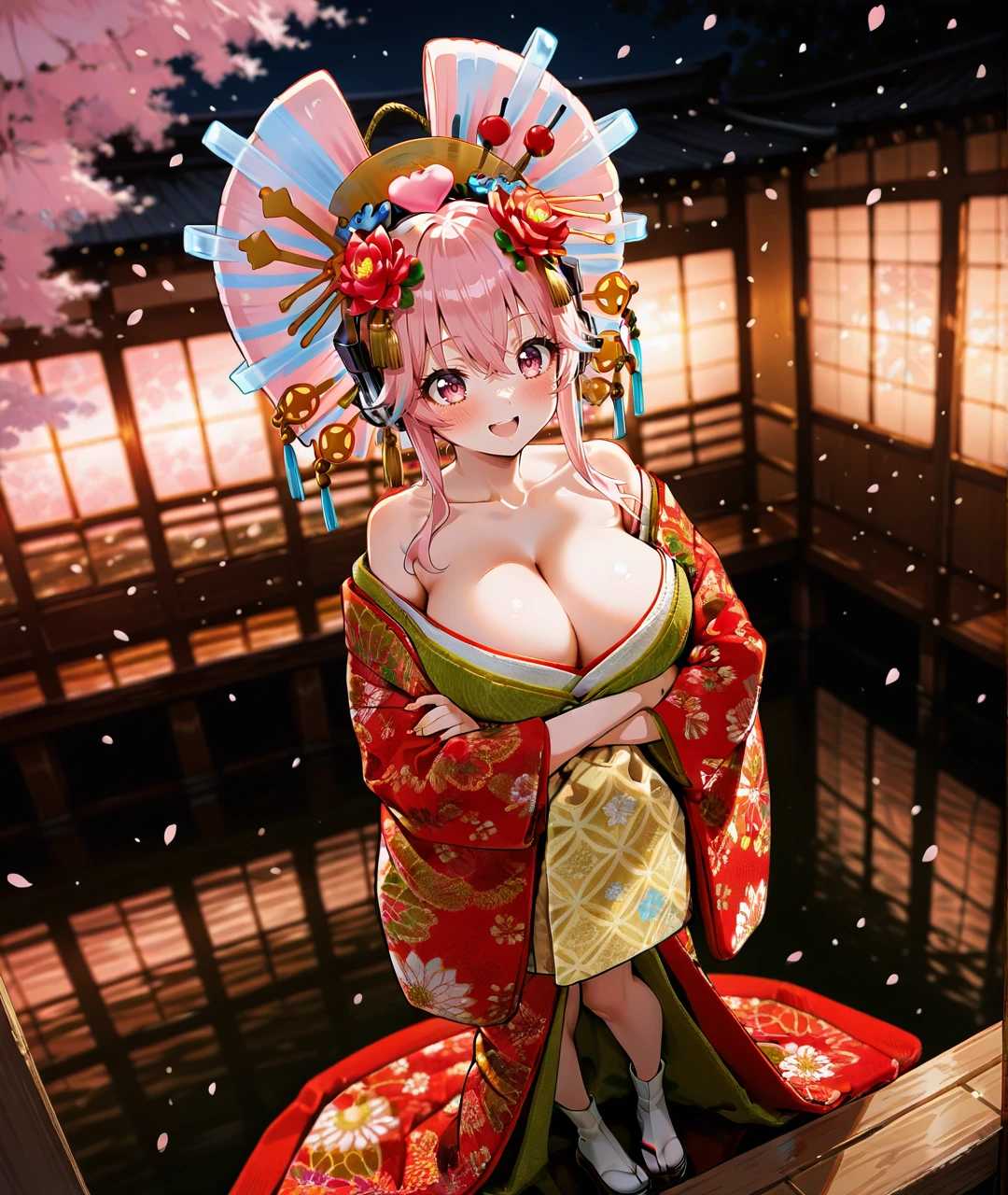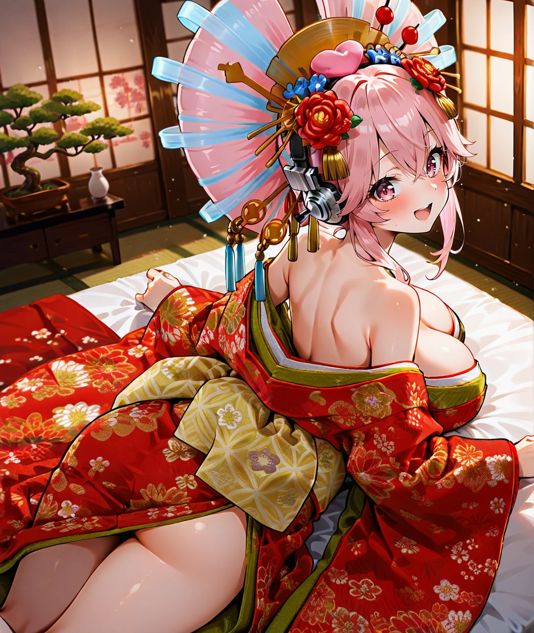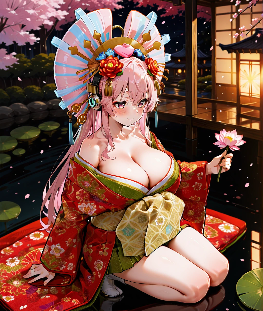 Tags: SSJDBase, pink eyes, two-tone hair, pink hair, blue hair, long hair, headphones, tassel, hair up, hair ornament, hair flower, Kanzashi, bare shoulders, collarbone, large breasts, cleavage, off shoulder, japanese clothes, flower pattern, furisode, two-tone kimono, red kimono, green kimono, wide sleeves, golden obi, bare legs, tabi,