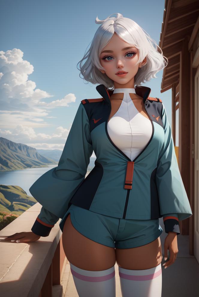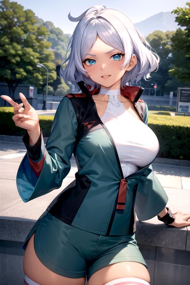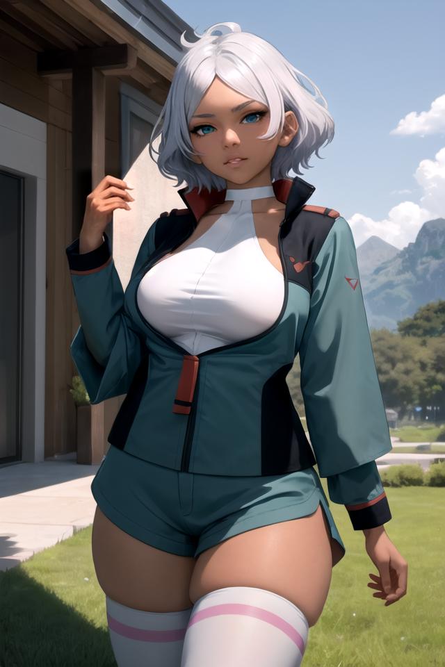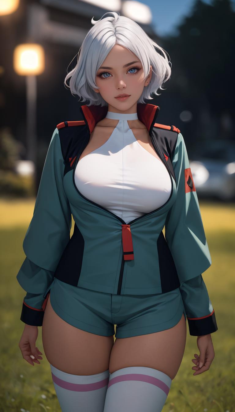 green_jacket_ownwaifu,www.ownwaifu.com,green jacket,short hair,dark skin,thighhighs,breasts,dark-skinned female,jacket,white legwear,blue eyes,shorts,large breasts,white hair,long sleeves,silver hair,thighs,