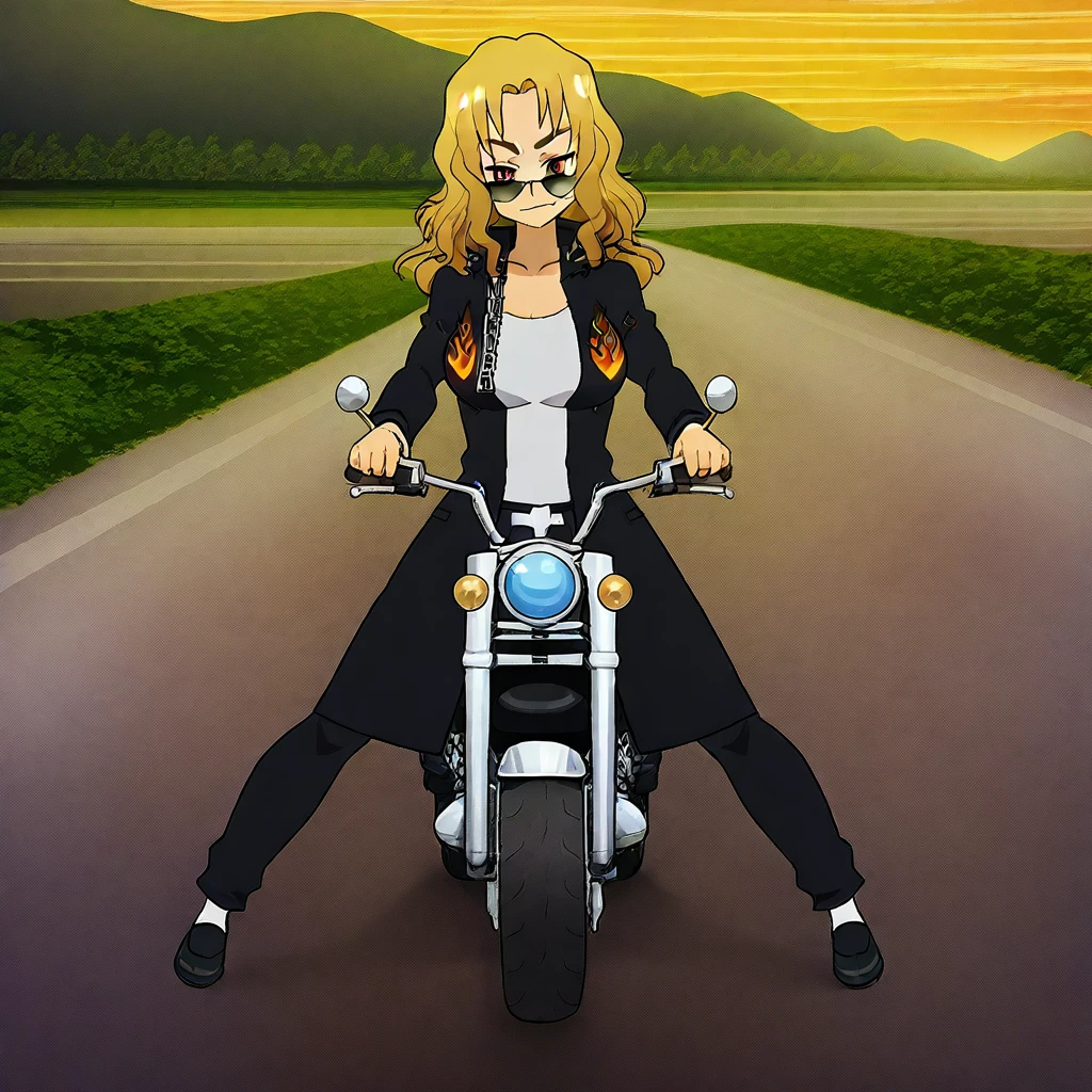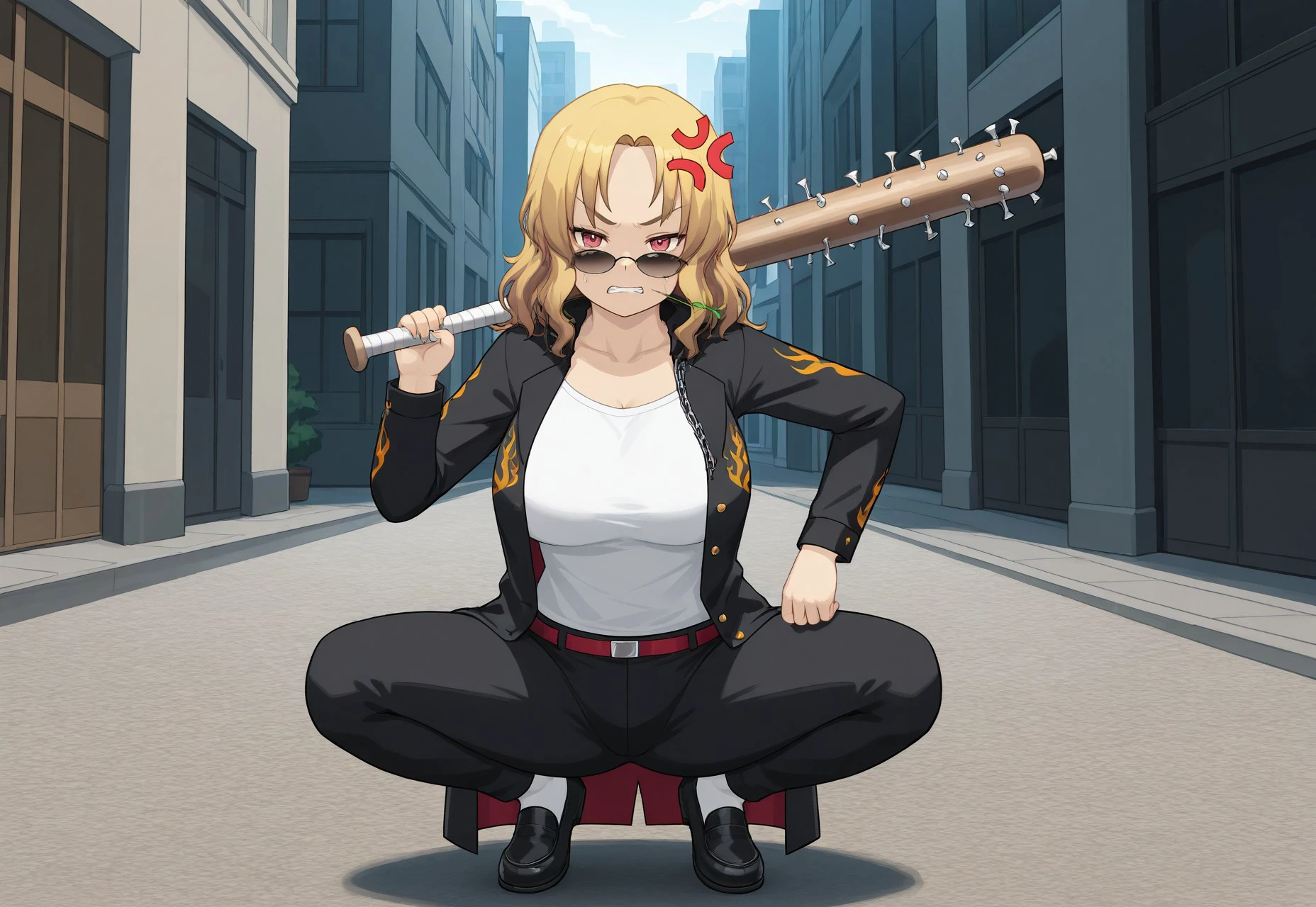 Clothing: white T-shirt, japanese school uniform, loafers, coat, flame print, chains, sunglasses