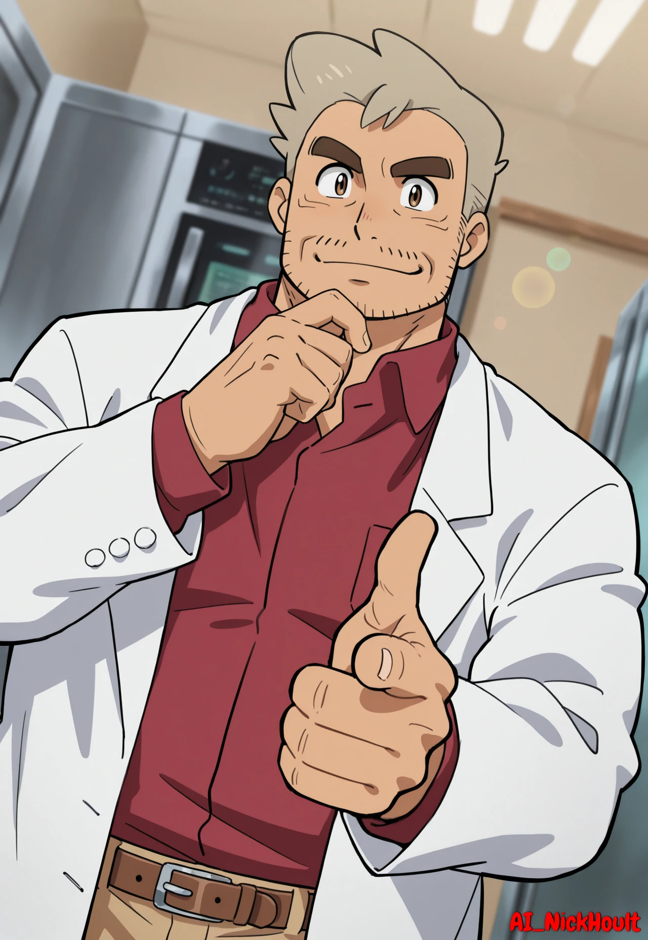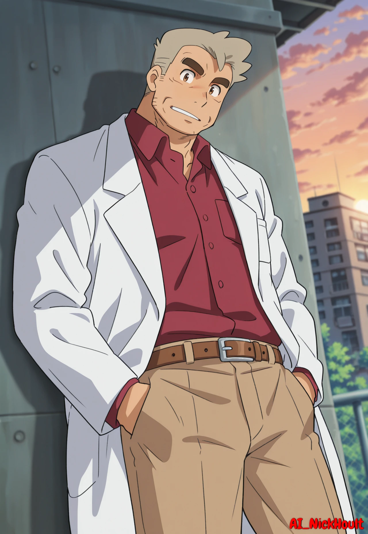 white lab coat, dark red shirt, beige trousers, brown shoes, brown belt,