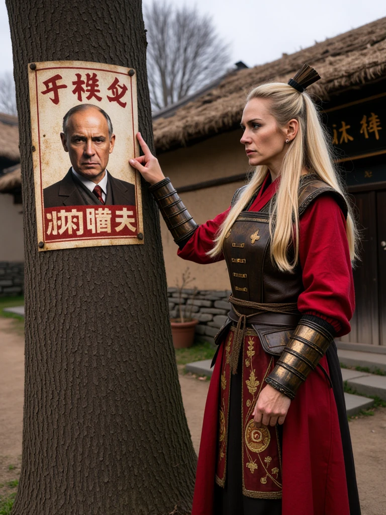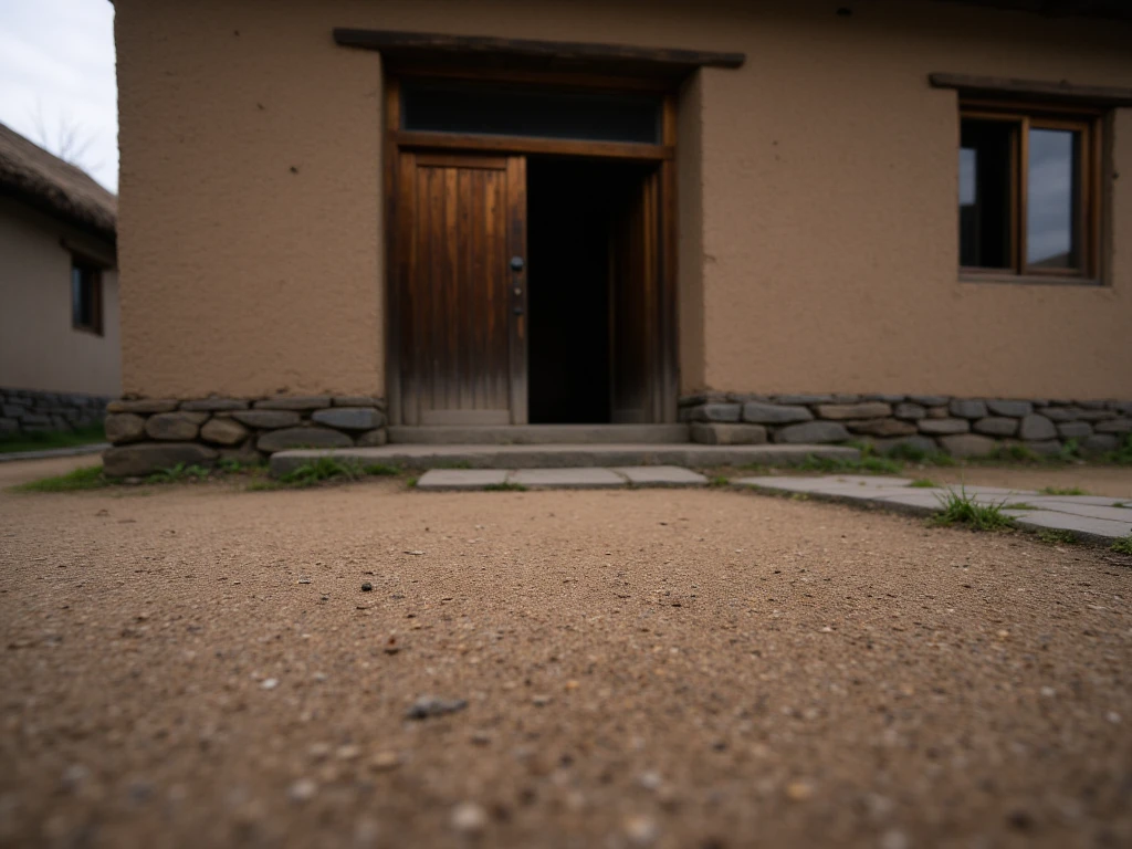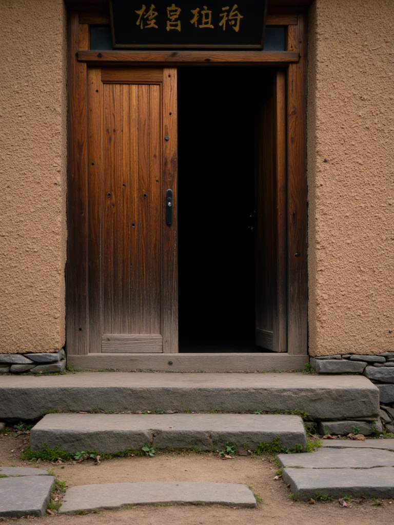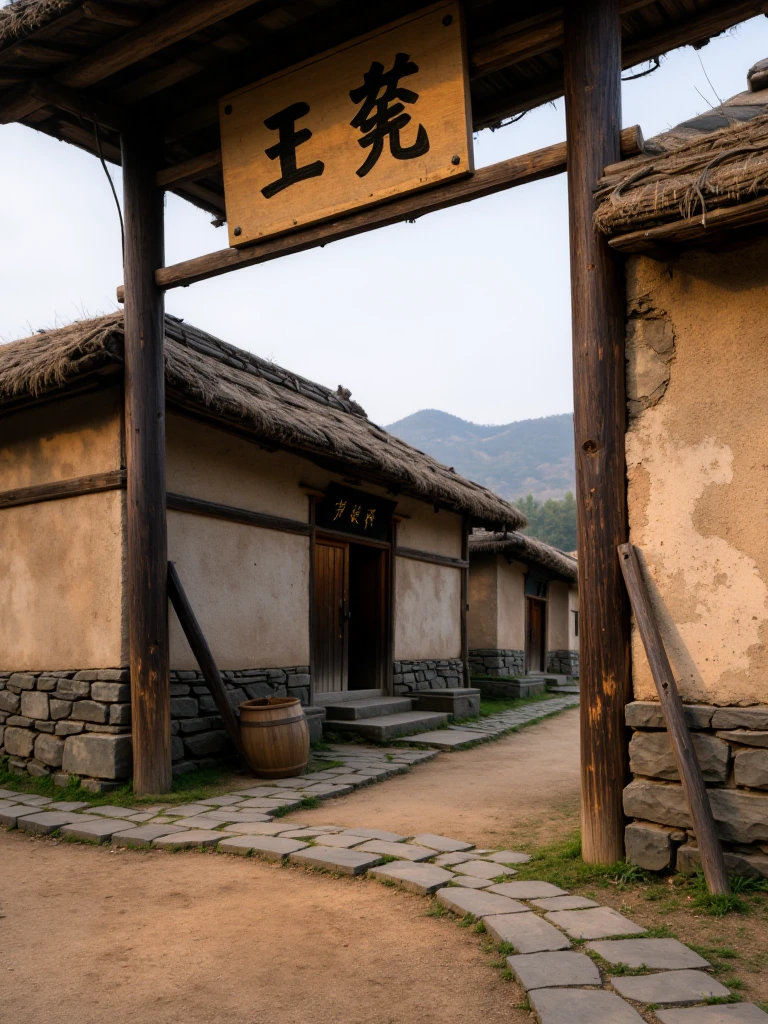 Rural Asian Village, traditional East Asian countryside settlement with a tranquil, timeless atmosphere and simple agrarian lifestyle. A gently curving dirt road runs through the center of the village, bordered by irregular flagstones and small patches of green grass. On both sides stand modest houses built from mud-plastered walls over stacked stone foundations, with thick, slightly overhanging thatched straw roofs. The doors are solid wood, dark and weathered, with small rectangular windows set into the clay walls. A prominent wooden entrance arch made of heavy, dark timber beams marks the village gateway, topped with a straw roof and a hanging wooden signboard bearing Chinese characters. Tall, leafless trees with leaning trunks and fine branching silhouettes frame the houses. In the background, low rolling hills fade into soft atmospheric haze. Lighting is diffused daylight under an overcast sky, cool bluish ambient tones balanced by warm earthy browns and muted straw colors, creating a calm, grounded, rural realism focused on natural materials and understated detail.