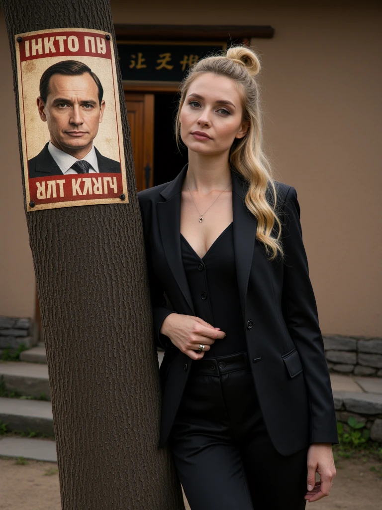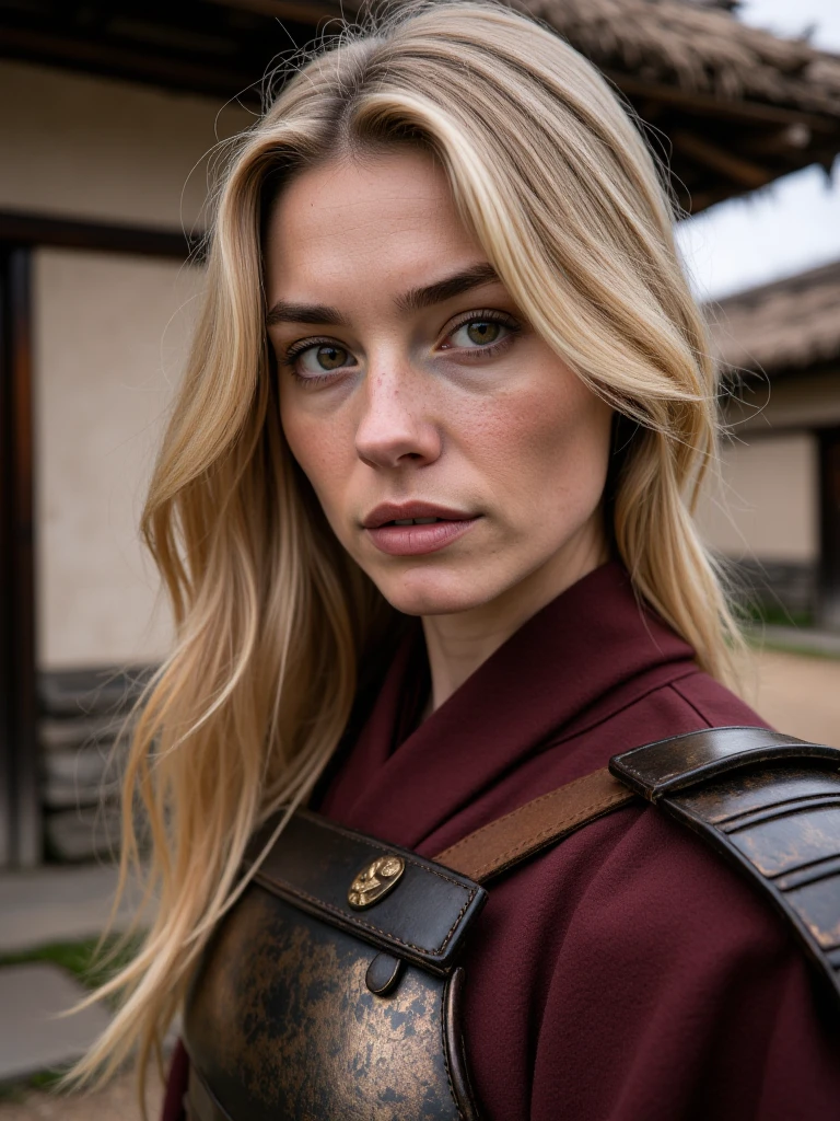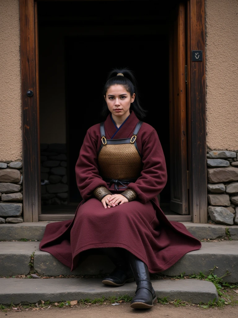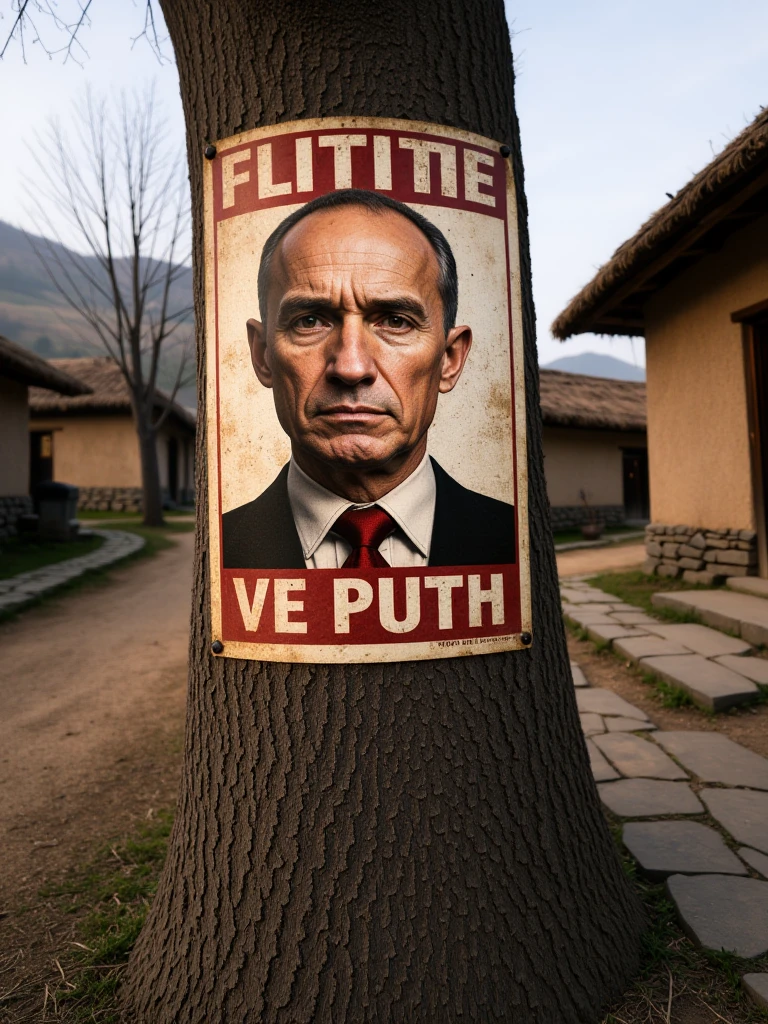 Rural Asian Village, traditional East Asian countryside settlement with a tranquil, timeless atmosphere and simple agrarian lifestyle. A gently curving dirt road runs through the center of the village, bordered by irregular flagstones and small patches of green grass. On both sides stand modest houses built from mud-plastered walls over stacked stone foundations, with thick, slightly overhanging thatched straw roofs. The doors are solid wood, dark and weathered, with small rectangular windows set into the clay walls. A prominent wooden entrance arch made of heavy, dark timber beams marks the village gateway, topped with a straw roof and a hanging wooden signboard bearing Chinese characters. Tall, leafless trees with leaning trunks and fine branching silhouettes frame the houses. In the background, low rolling hills fade into soft atmospheric haze. Lighting is diffused daylight under an overcast sky, cool bluish ambient tones balanced by warm earthy browns and muted straw colors, creating a calm, grounded, rural realism focused on natural materials and understated detail.