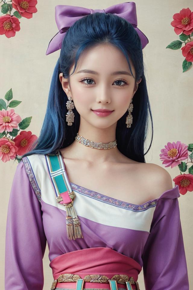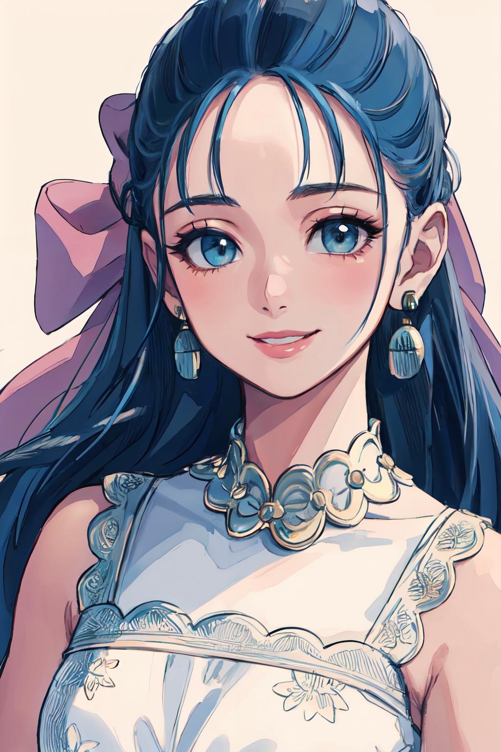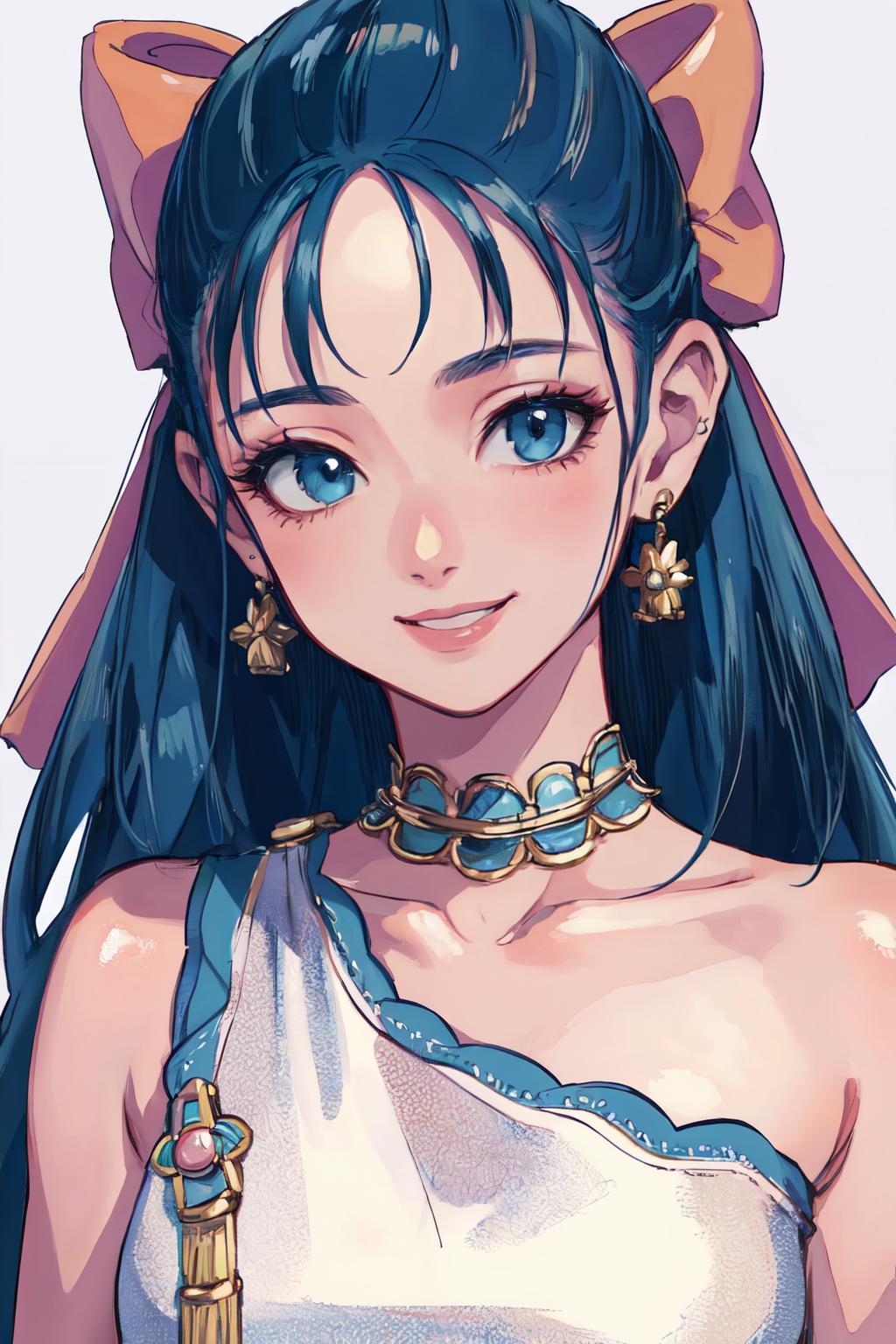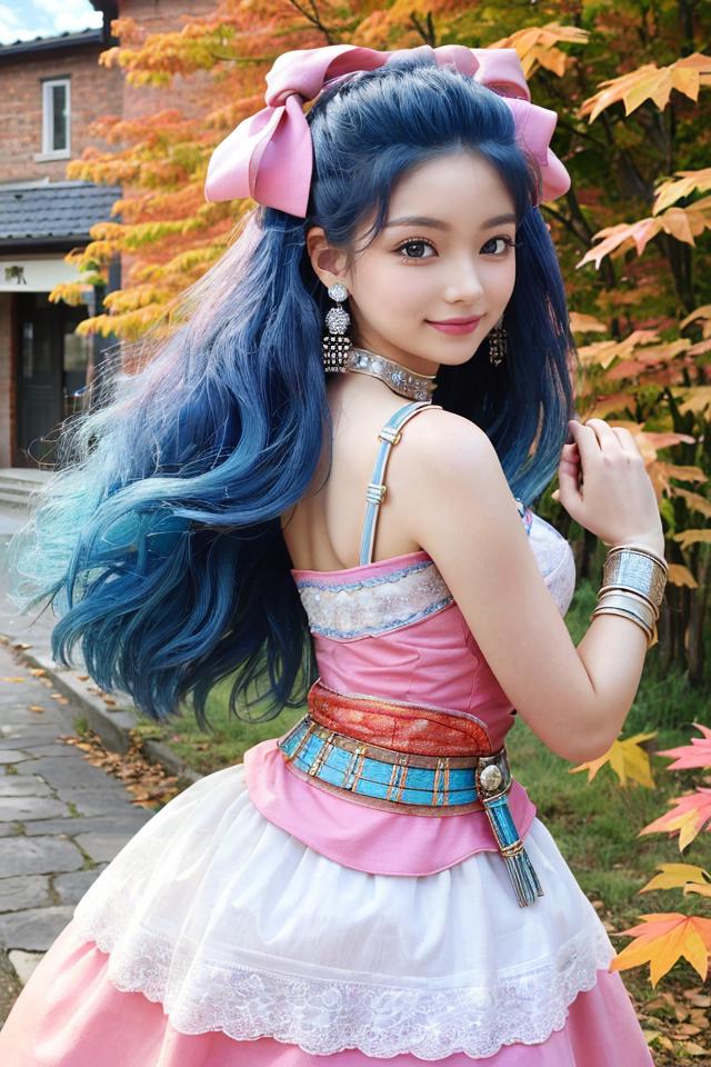 Add "hair bow, bracelet, choker, earrings, long dress, sash" for her typical look.