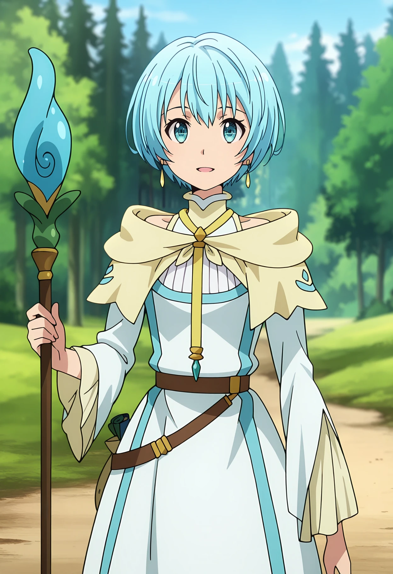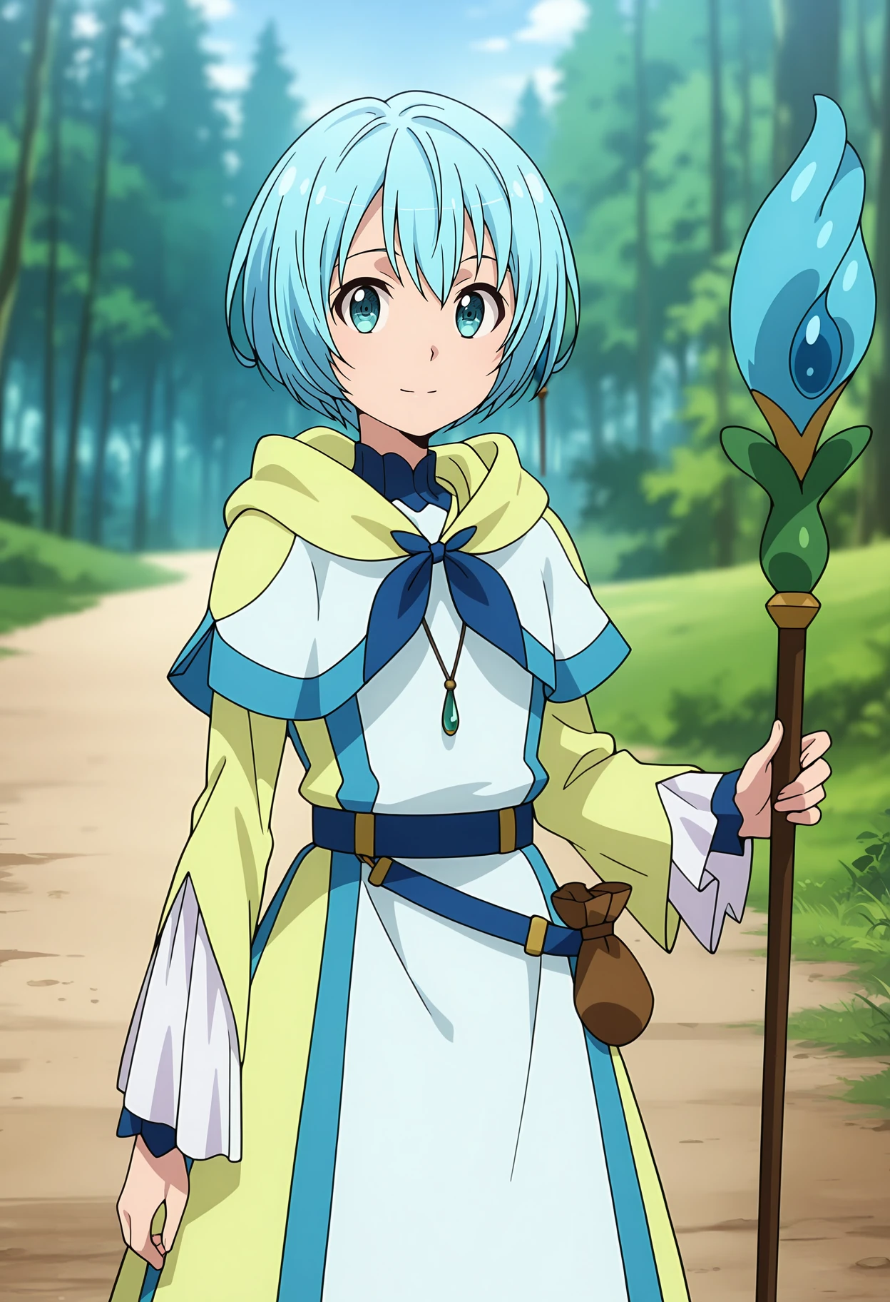 pendant, multicolored capelet, blue ribbon, multicolored dress, hood down, blue belt, belt pouch