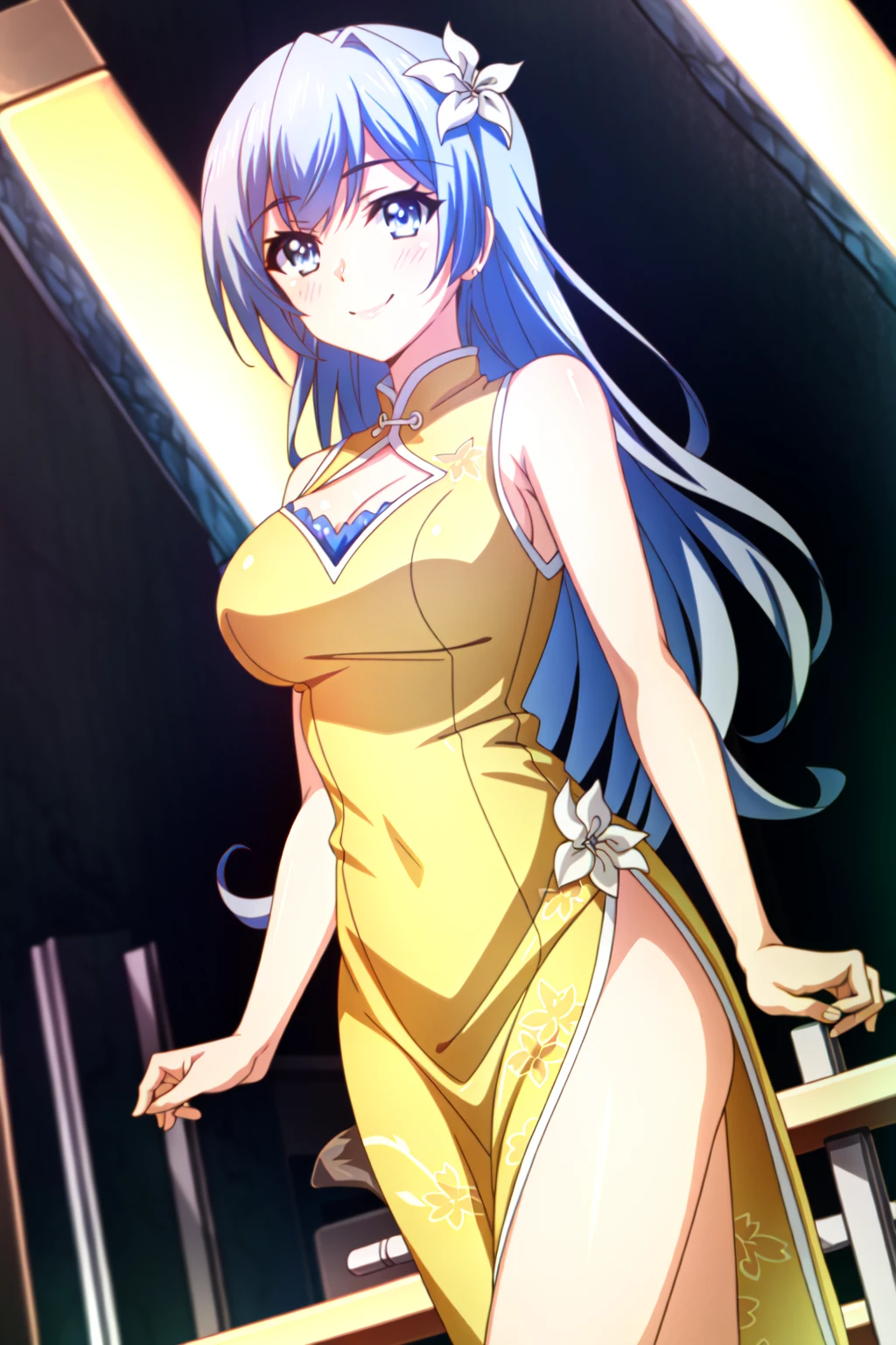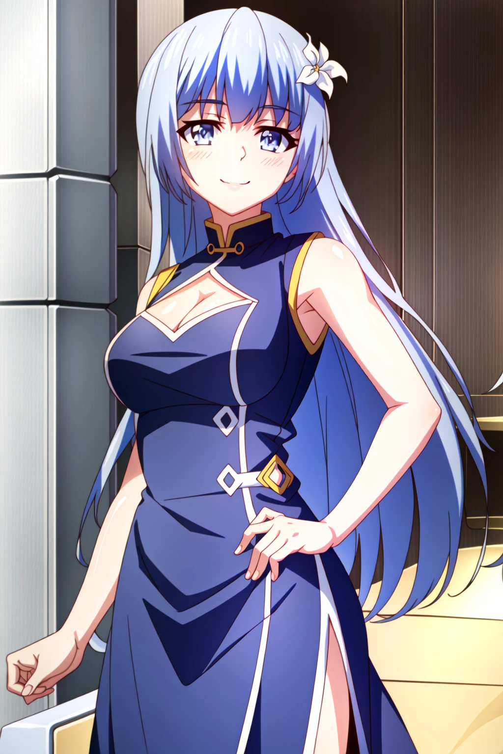 Miku Izayoi, 1girl, solo, gloves, hair ornament, blue hair, long hair, dress, crescent, blue eyes, aoki reika, white gloves, flower, choker, crescent hair ornament, jewelry