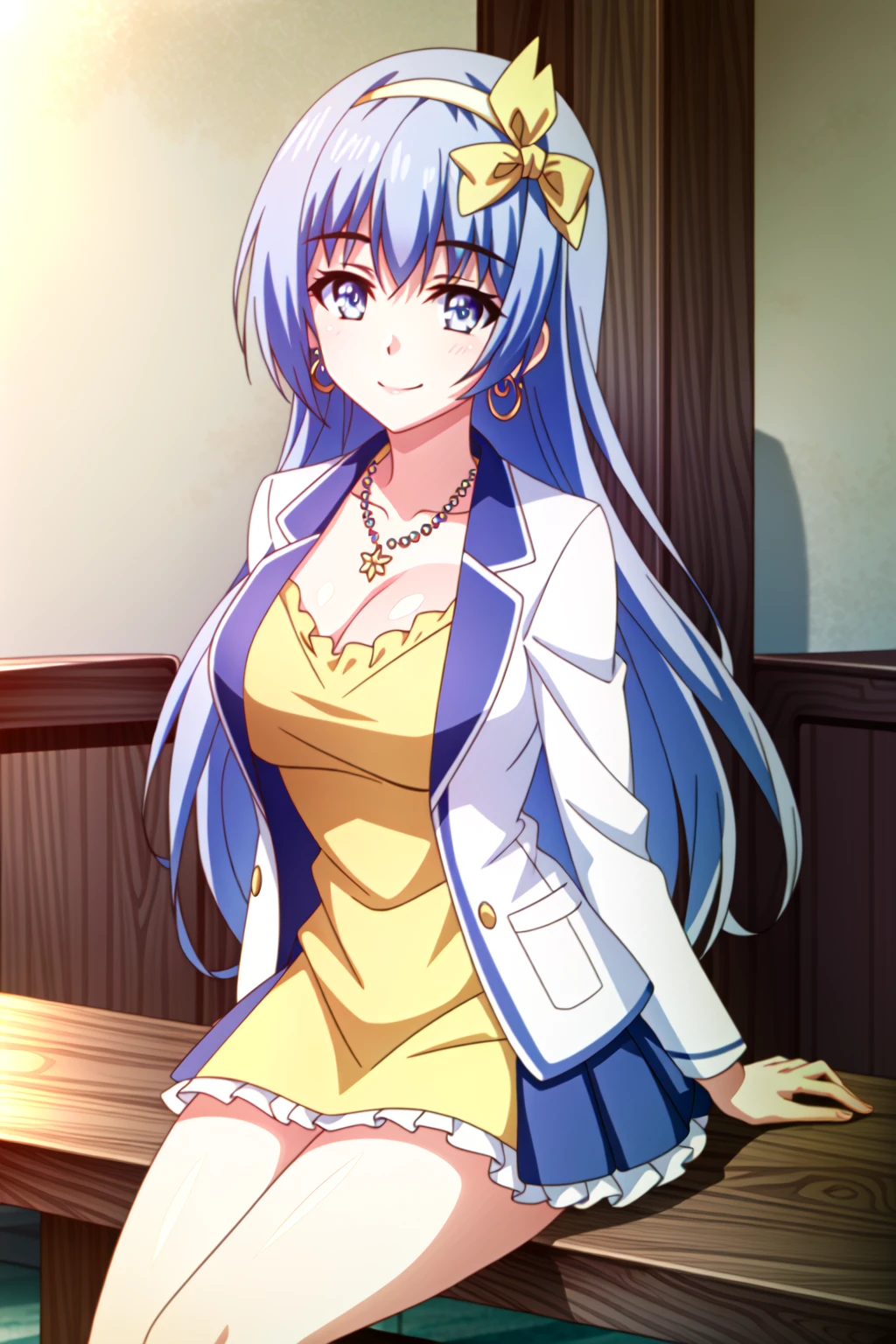 Miku Izayoi, 1girl, jewelry, solo, long hair, breasts, cleavage, earrings, smile, necklace, dress, bow, hairband, black bow, looking at viewer, large breasts, indoors, pink dress, black hairband, collarbone, jacket, very long hair, blurry, purple hair, bangs, hair bow, chair, blue eyes, day, white jacket