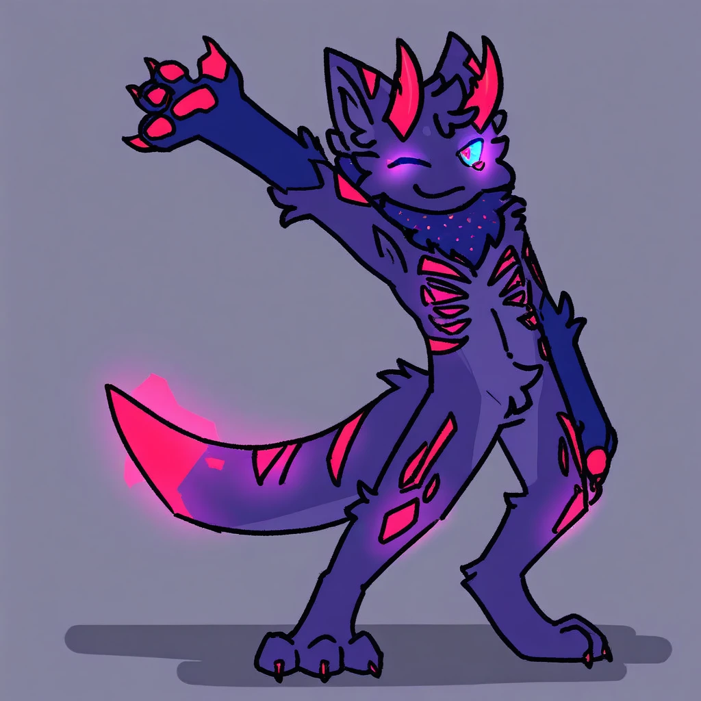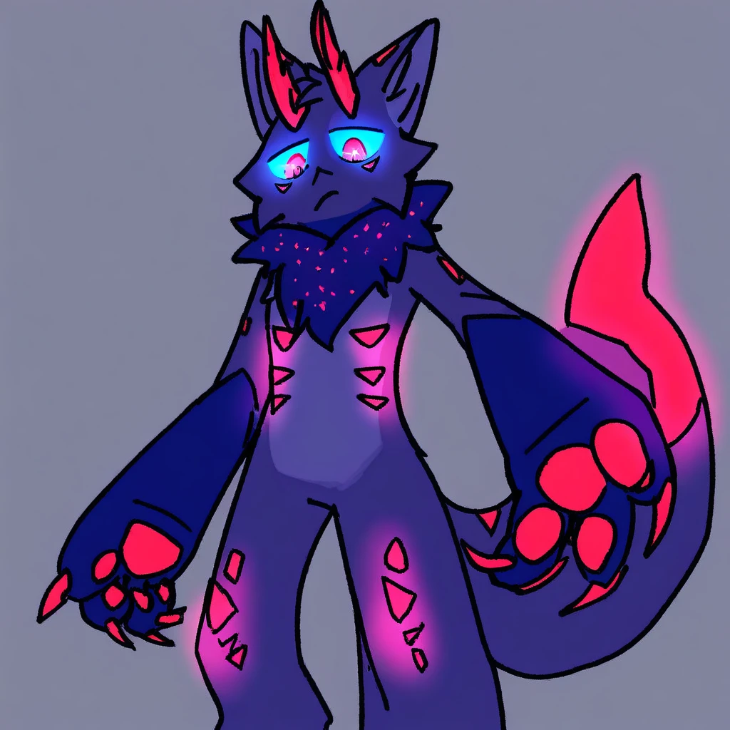 purple skin, purple fur, red details, red markings, cyan sclera, red eyes, glowing eyes, horns, animal ears, furry, anthro, markings under eyes, fur collar, glowing fur collar, animal tail, glowing tail tip, claws, chest markings