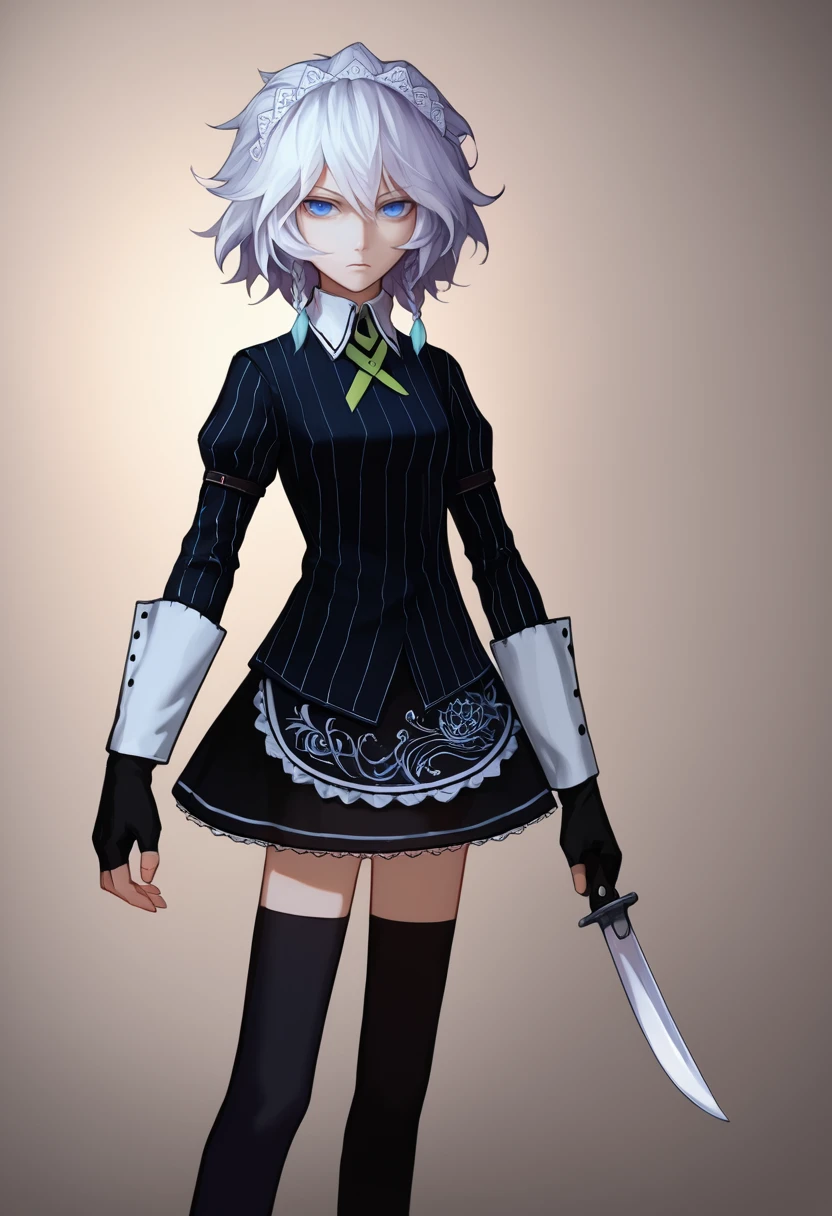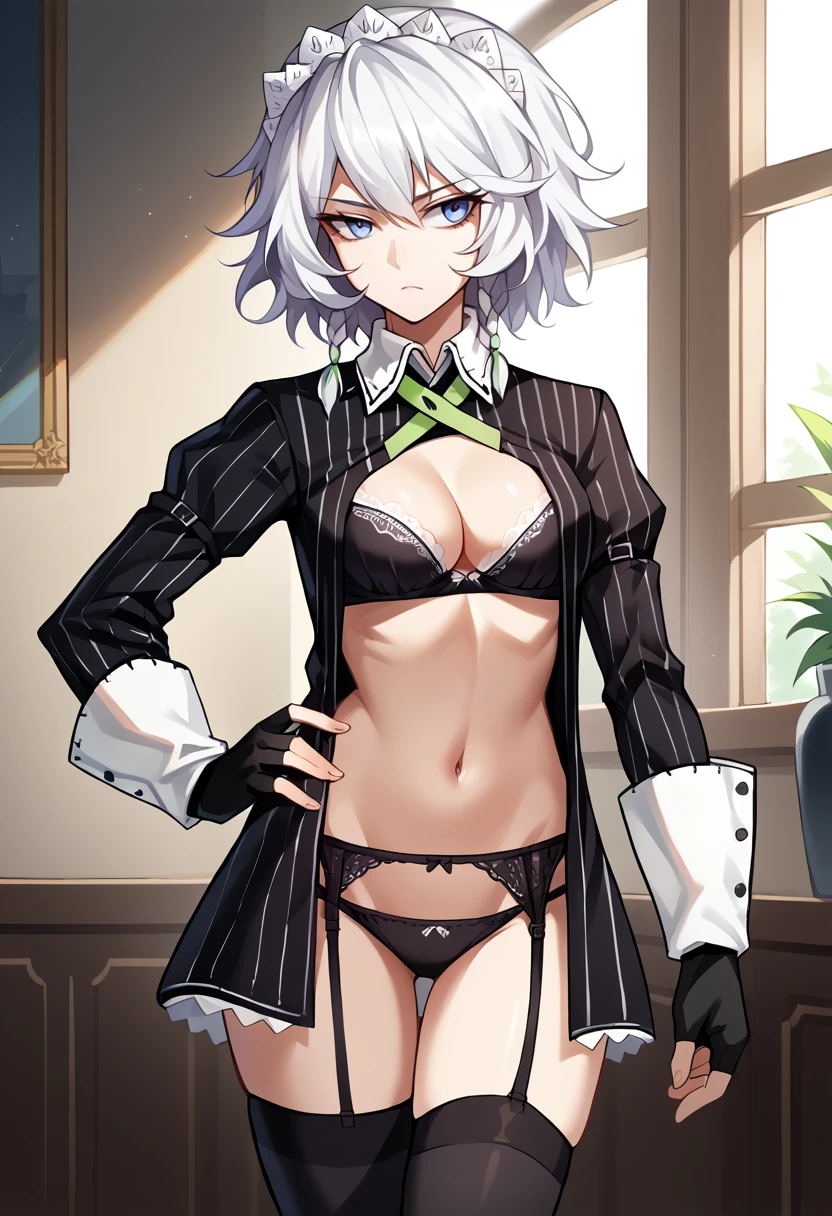 Default Outfit: maid headdress, striped clothes, black shirt, striped shirt, collared shirt, long sleeves, black gloves, fingerless gloves, black skirt, black thighhighs