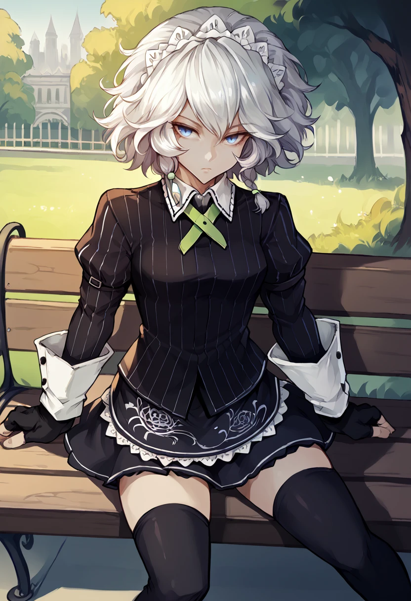 maid headdress, striped clothes, black shirt, striped shirt, collared shirt, long sleeves, black gloves, fingerless gloves, black skirt, black thighhighs