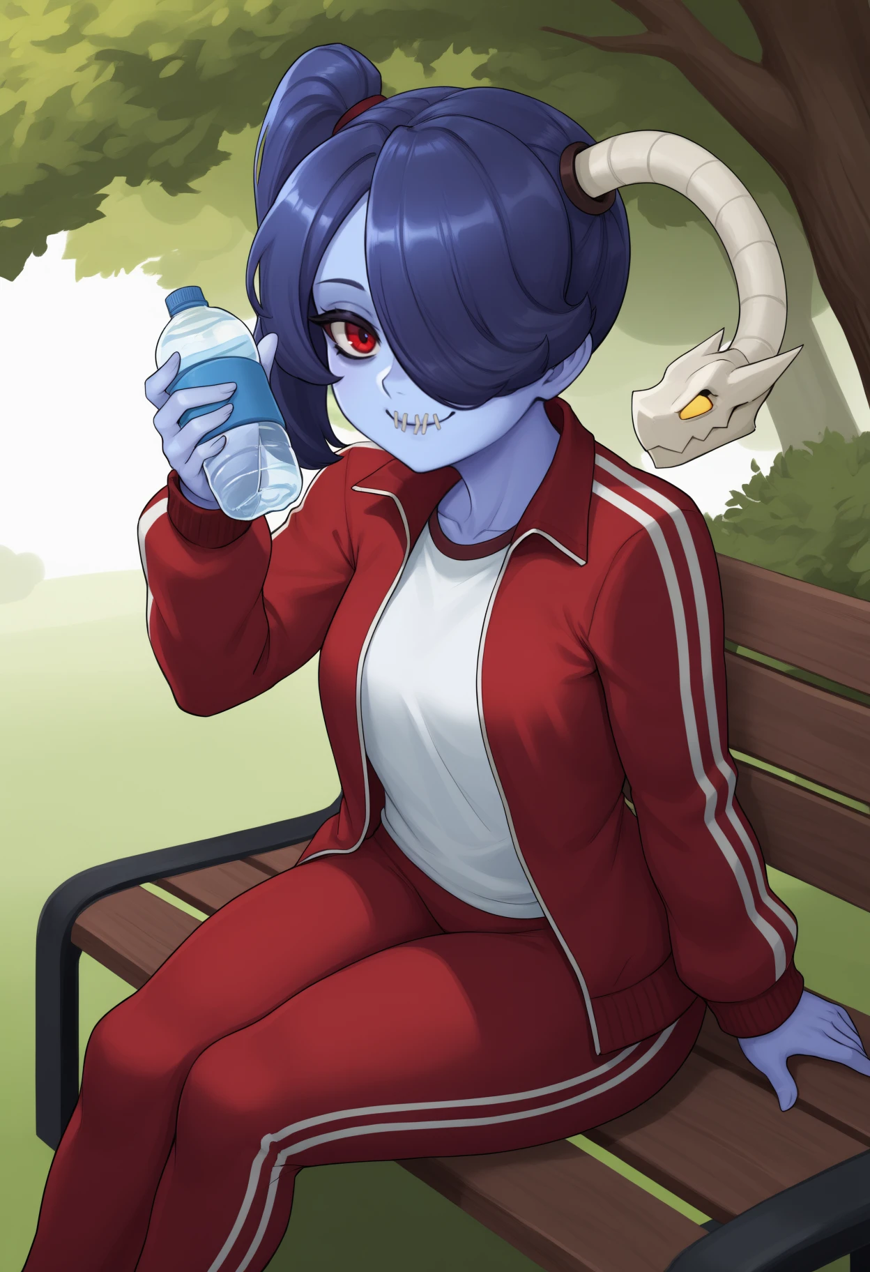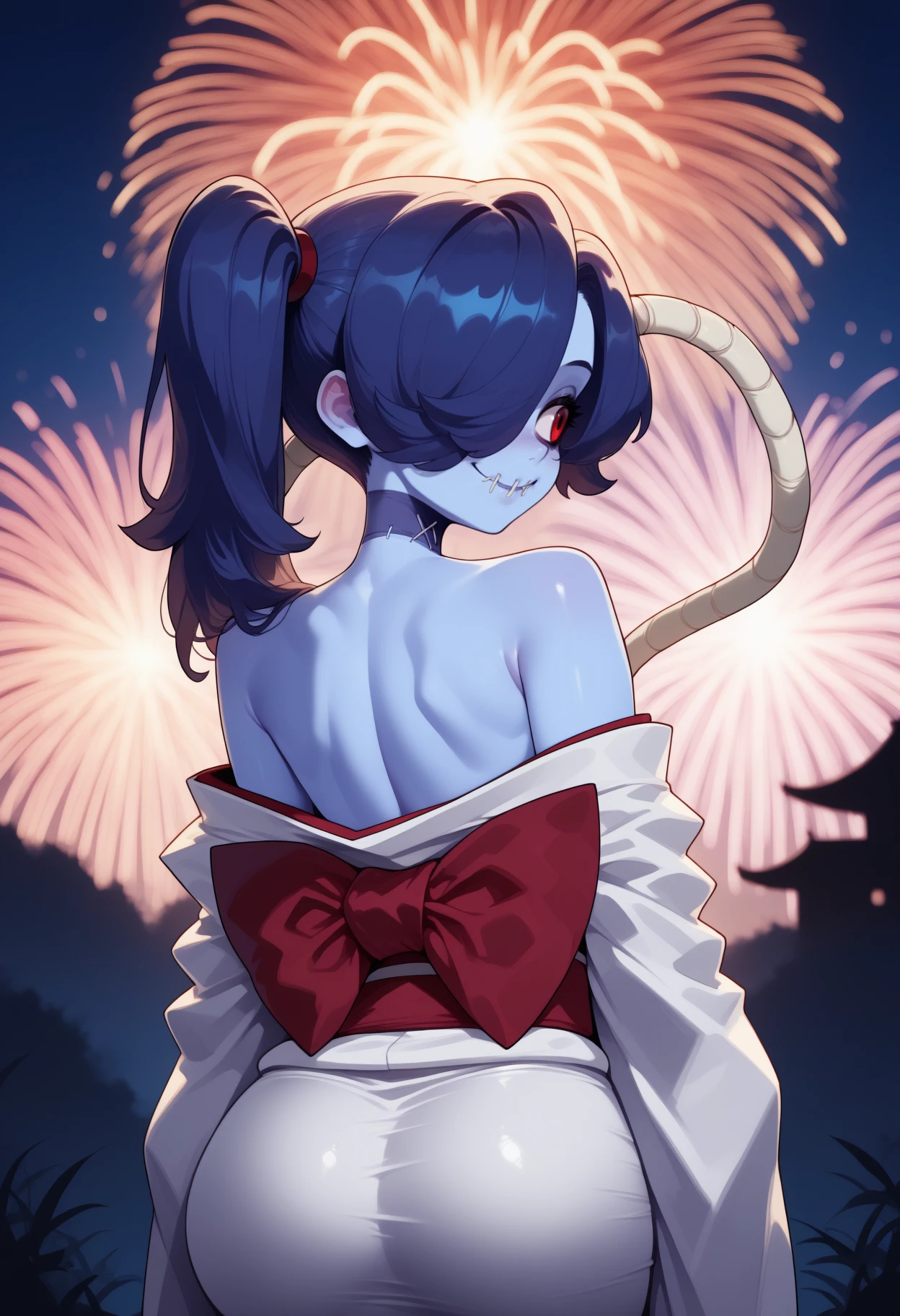 zombie, blue skin, stitched mouth, long hair, blue hair, hair over one eye, side ponytail, object through head, red eyes