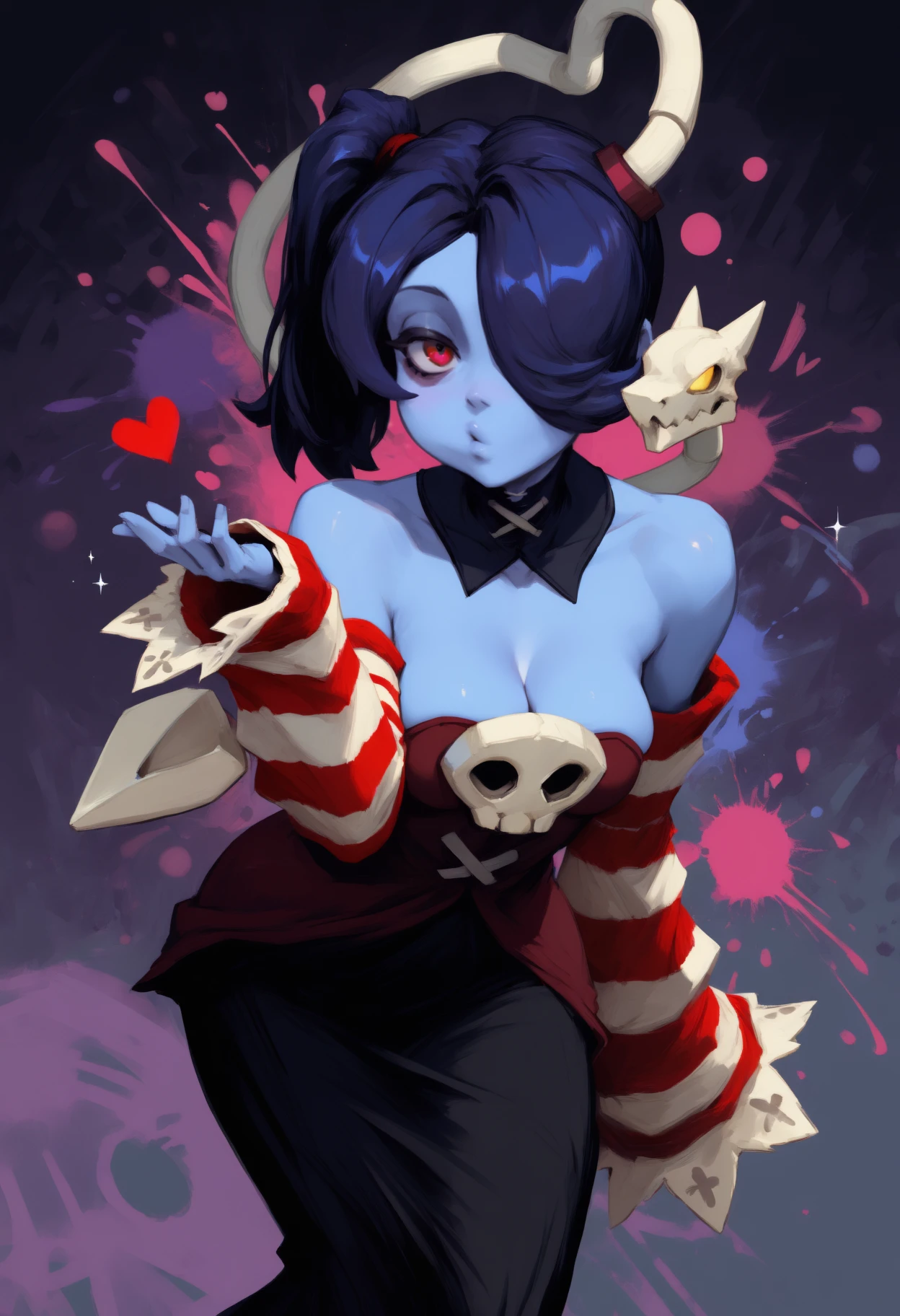Default Outfit: detached collar, red dress, strapless dress, skull, striped sleeves, red sleeves, white sleeves, detached sleeves, sleeves past wrists, long skirt, black skirt, bare shoulders