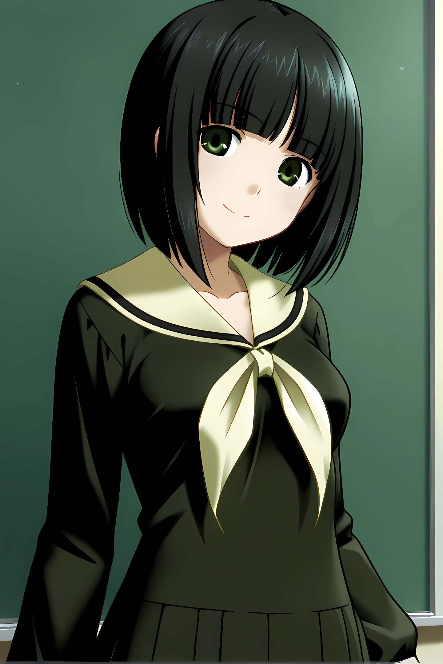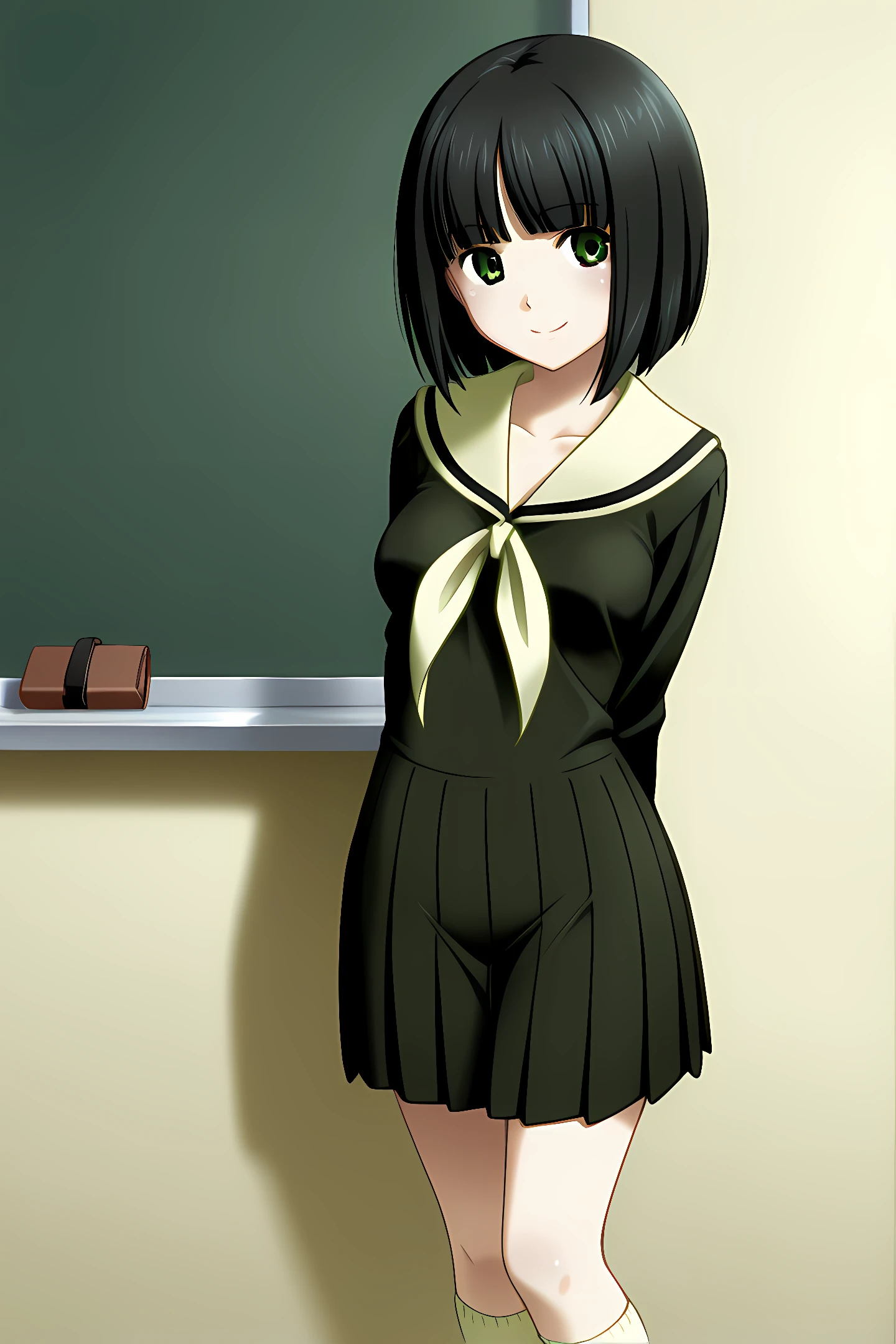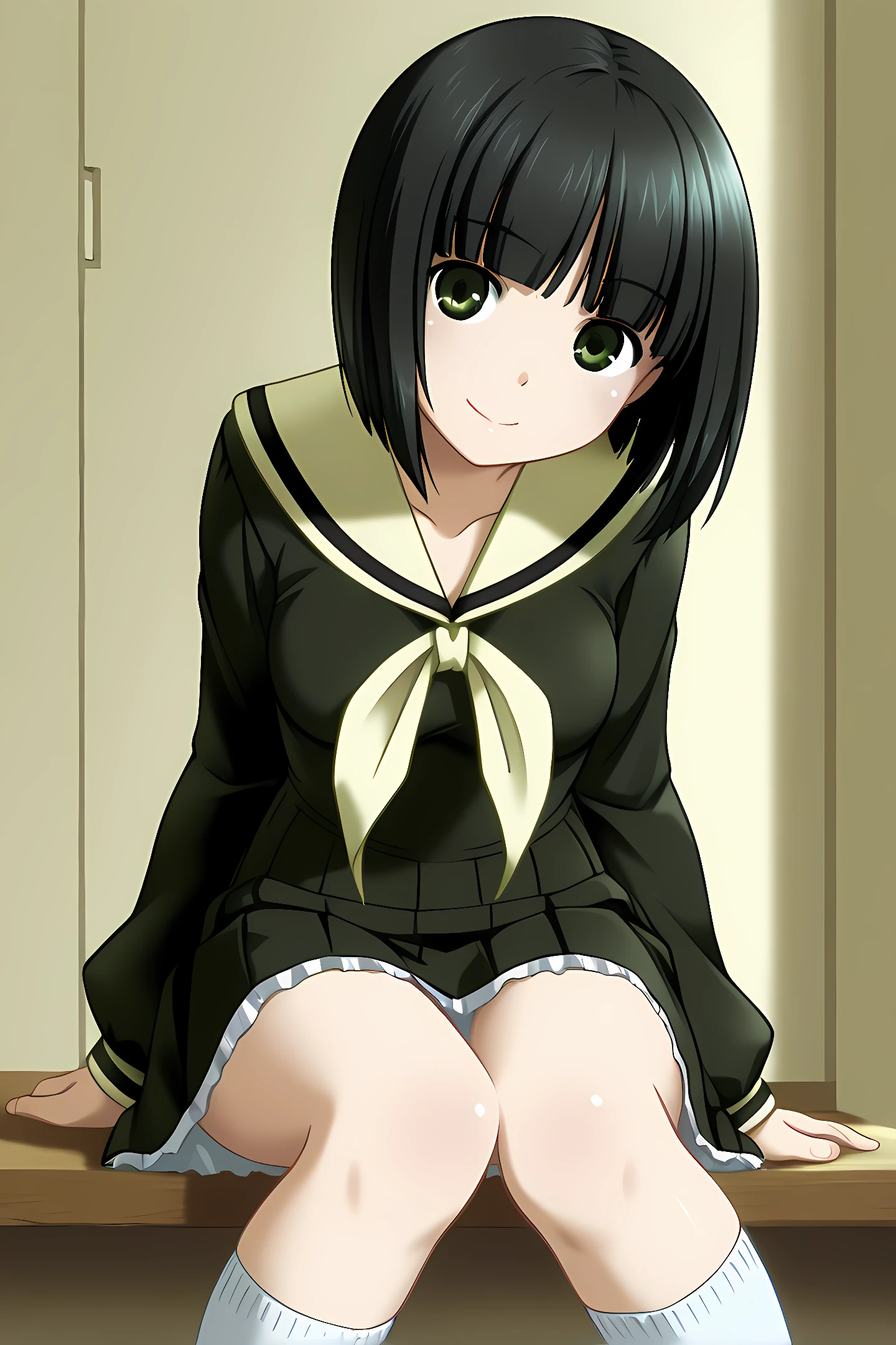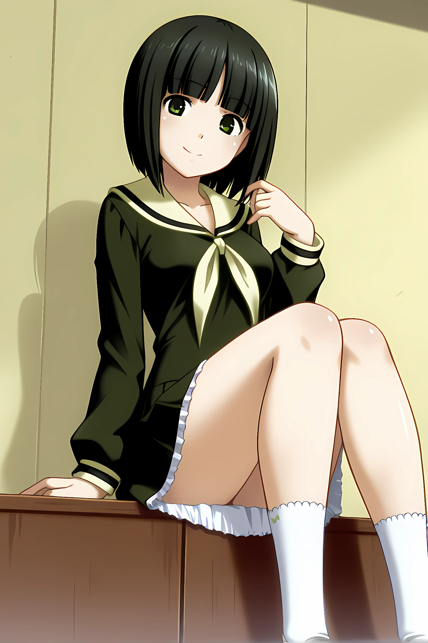 nijonariko, bob cut, black hair, green eyes, short hair, medium breasts, 1girl, lillian girls' academy school uniform, serafuku, skirt, white socks,