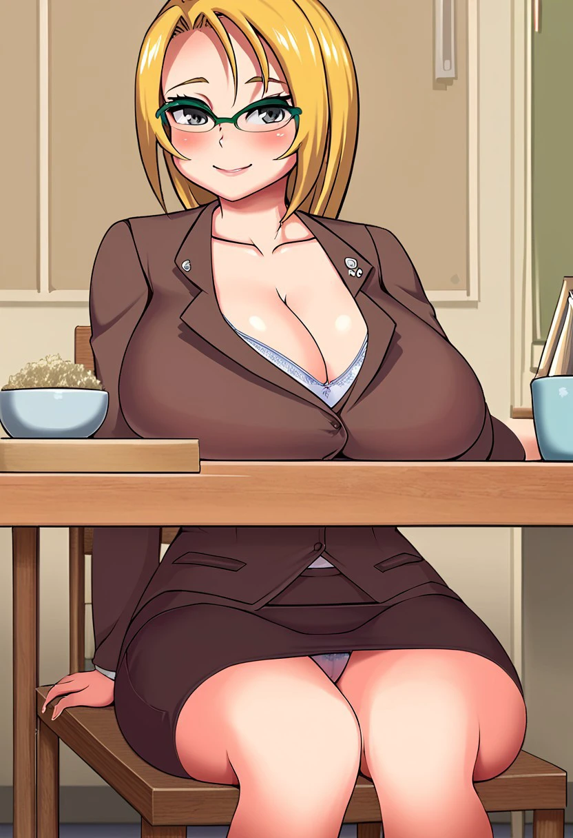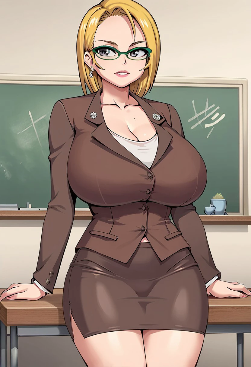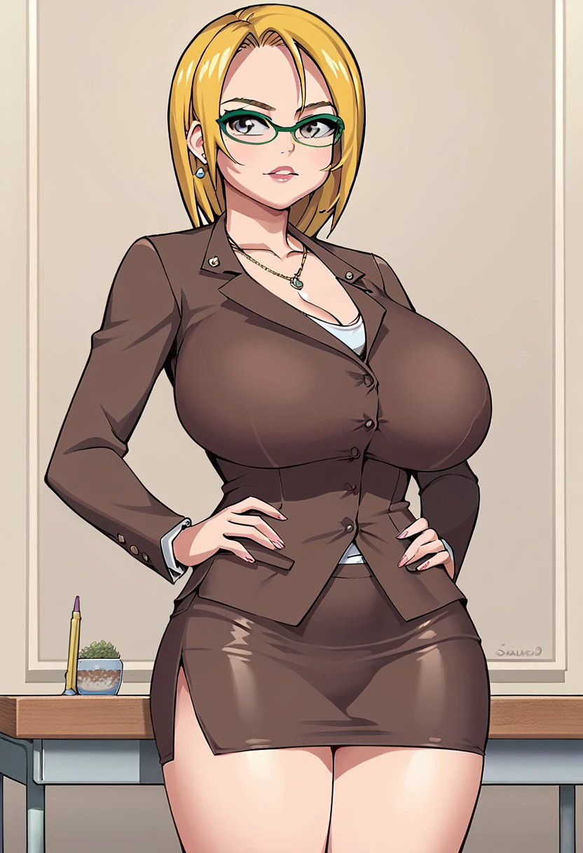 pencil skirt, brown teacher clothes, heels, green glasses