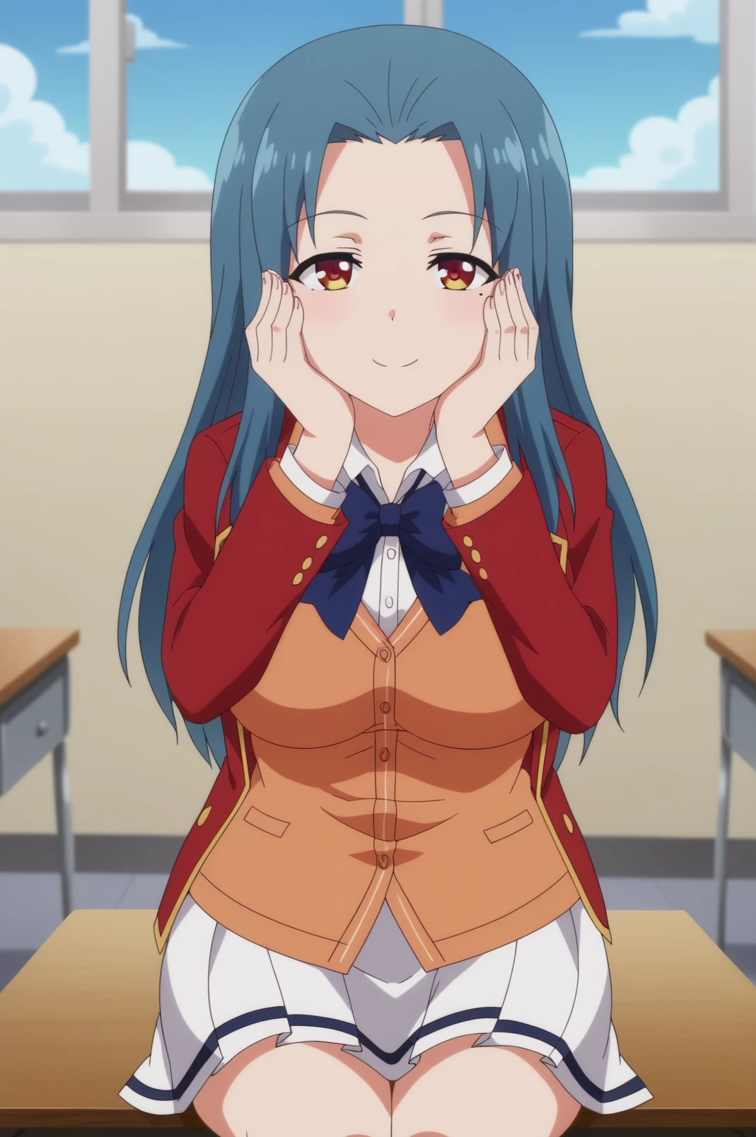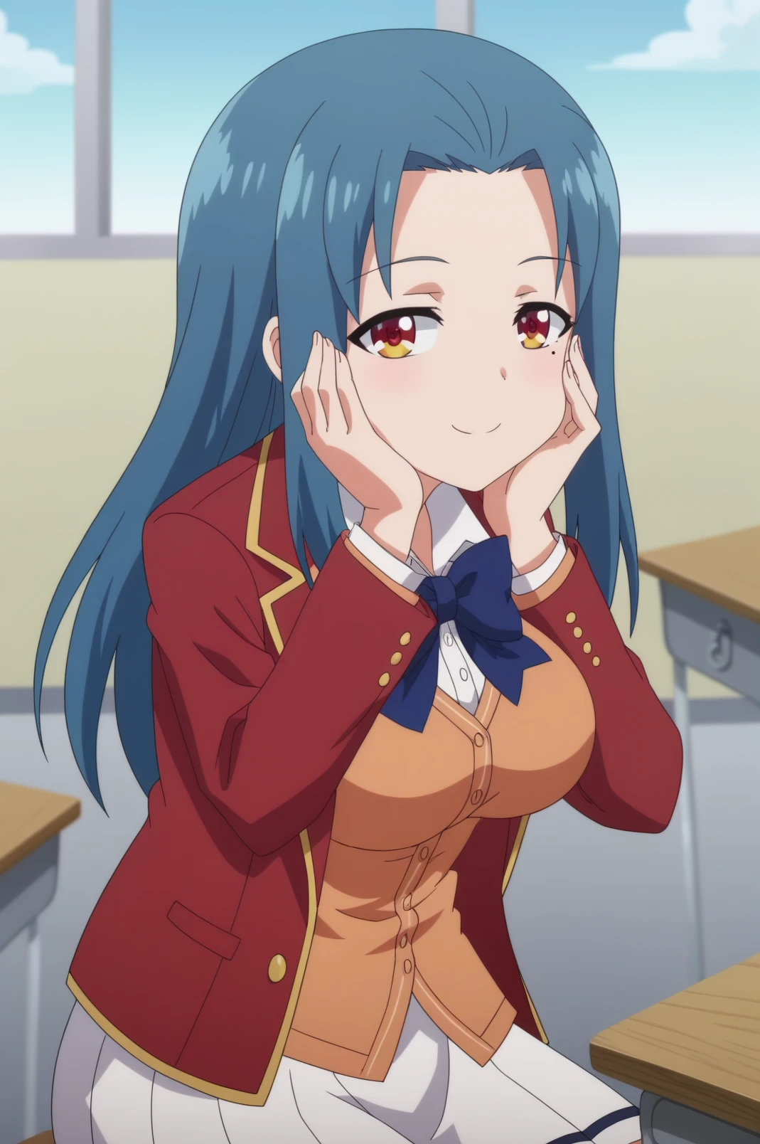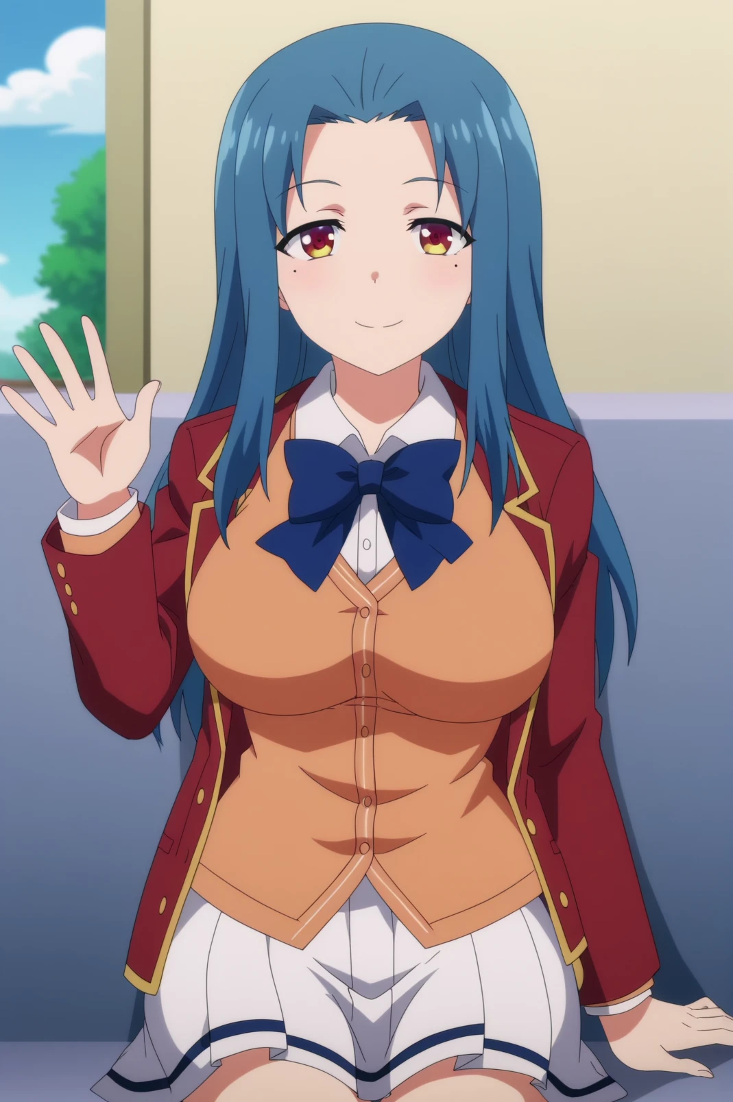 haruka hasebe,long hair,mole,mole under eye,school uniform,bow,skirt,sitting,breasts