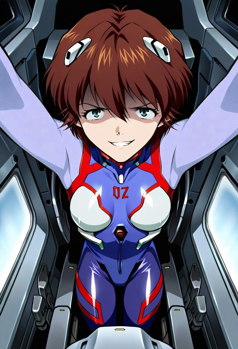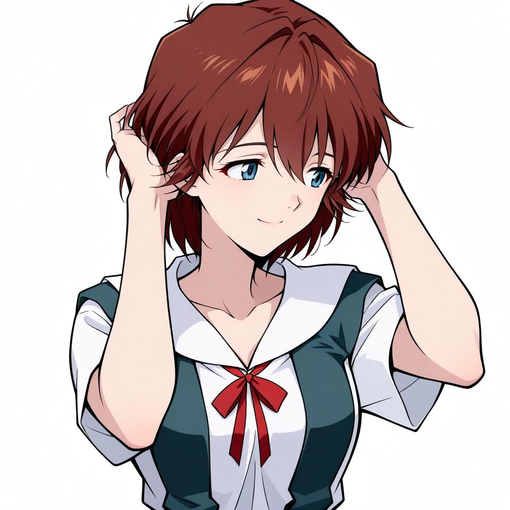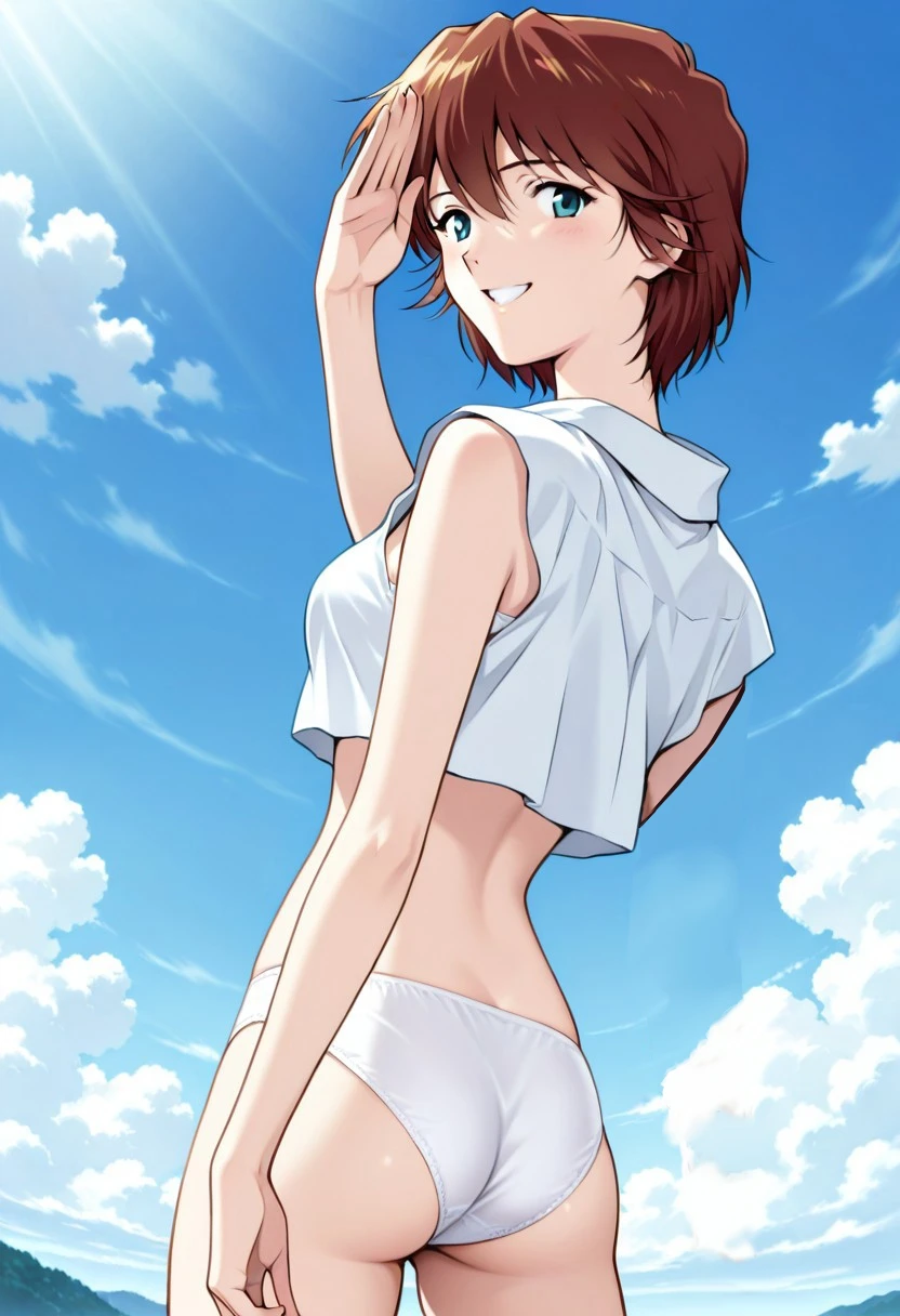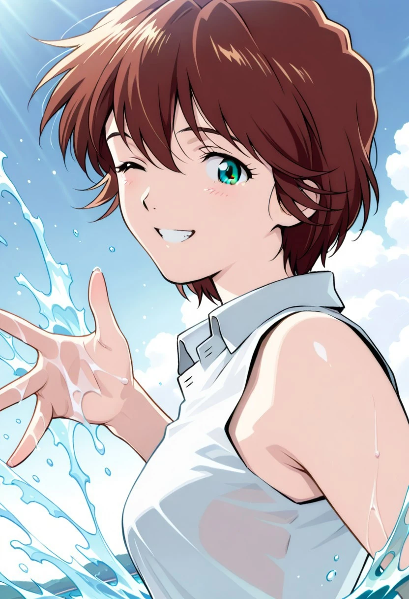 KirishimaManaILXL, 1girl, solo, brown hair, green eyes, short hair, small breasts,