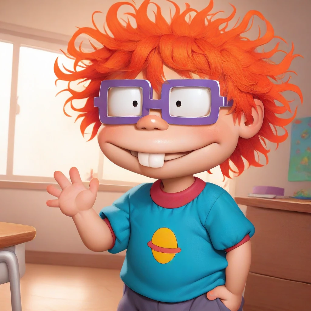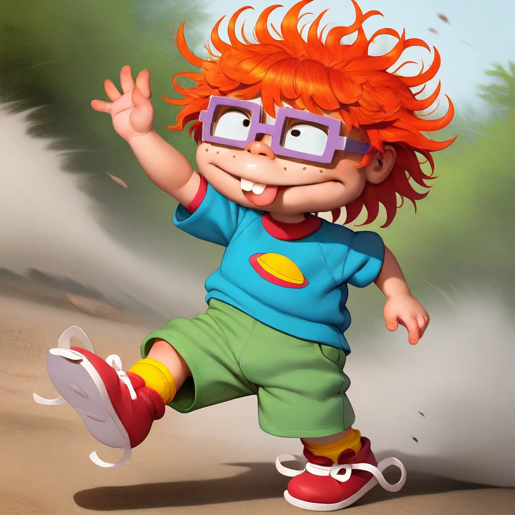 Chuckie Finster, child,solo,1boy, Rugratschuckie, Chuckie Finster hair style, Orange hair, messy hair, freckle, buck teeth, Purple-framed Glasses, green short pants, untie shoes, eyewear,freckles, yellow socks,red footwear