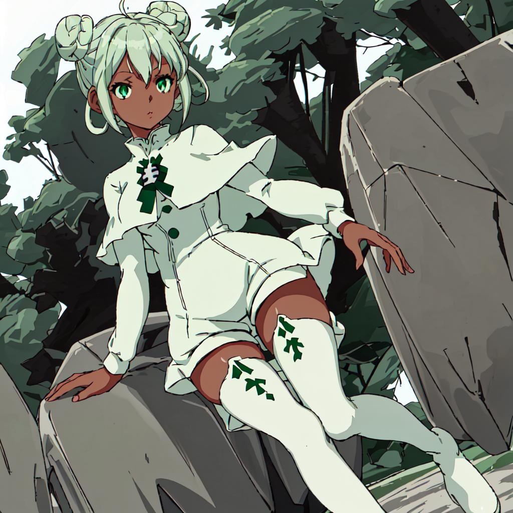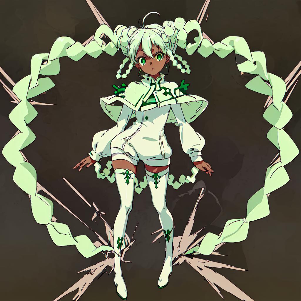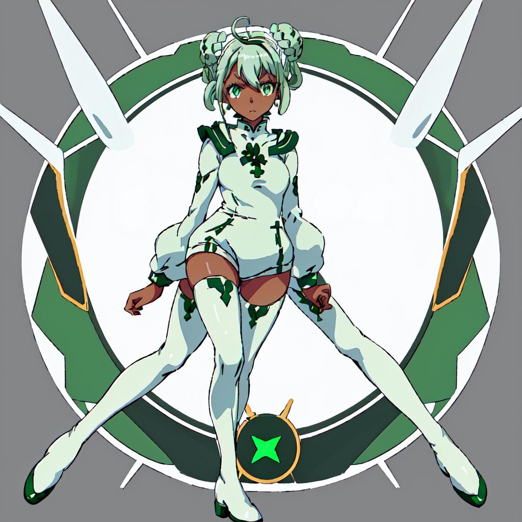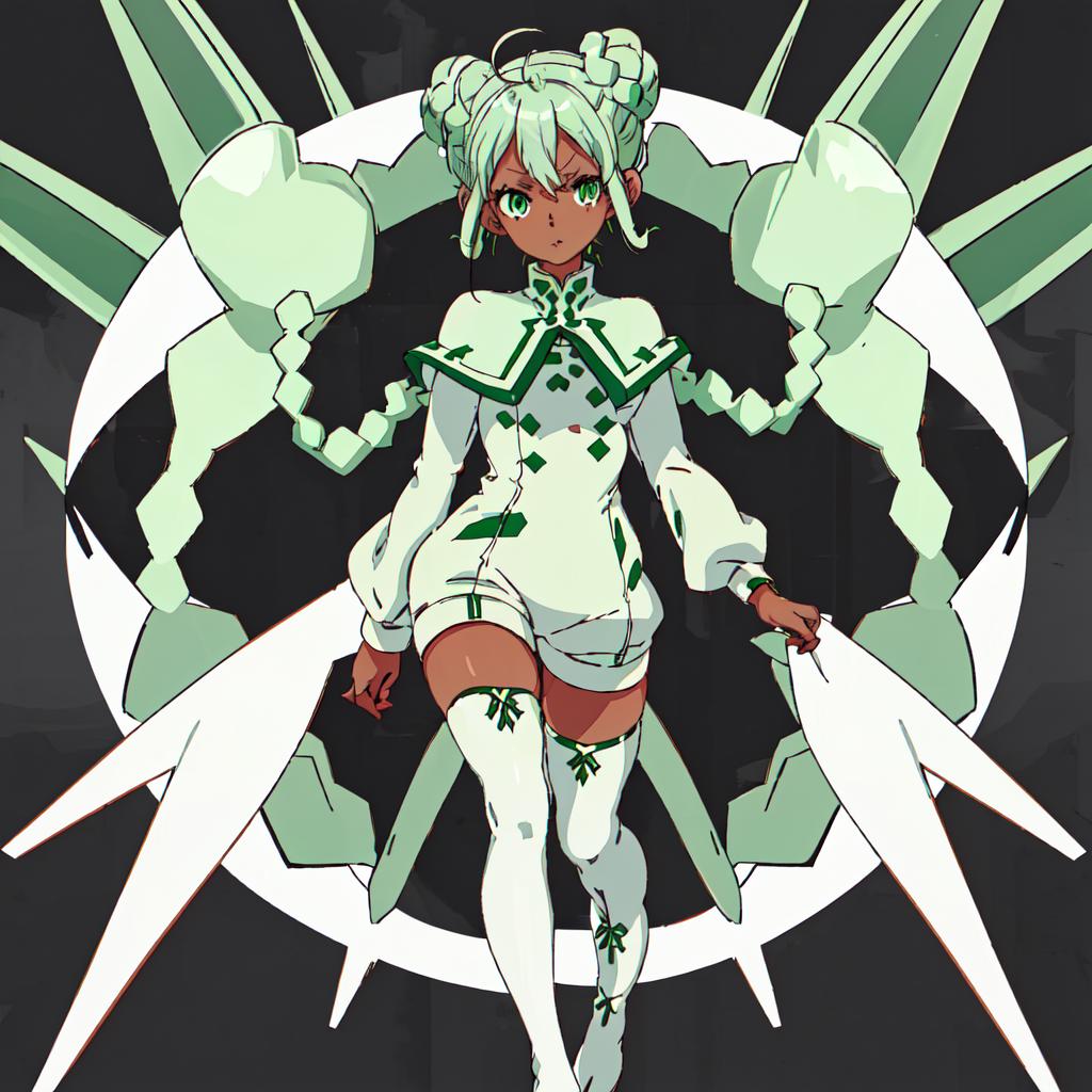Raraiya Monday : Gundam_Reconguista_in_G, short hair,1girl, solo,blue eyes, long sleeves,boots, green hair, white thighhighs, dark-skinned female, zettai ryouiki, double bun, buttons, thigh boots, short dress, white footwear, hair rings, white capelet, short jumpsuit