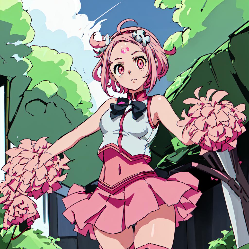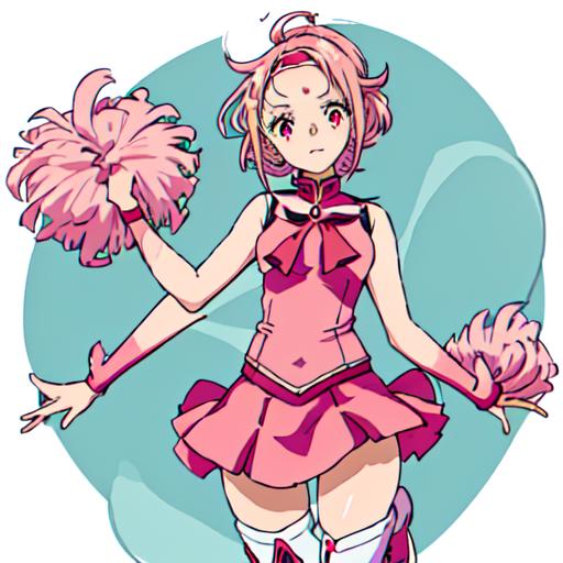 Special Girl 1 : Gundam_Reconguista_in_G, 1girl, solo, short hair, white bow,pink hair, sleeveless, pink eyes, knee boots, cheerleader,red One-piece dress