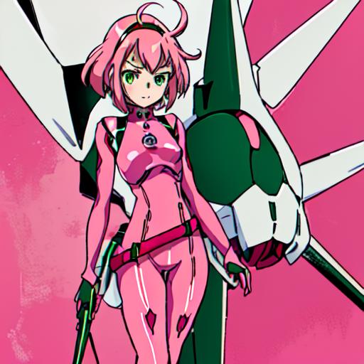 Special Girl 2 : Gundam_Reconguista_in_G, 1girl, solo, short hair, thighhighs, gloves, green eyes, pink hair, boots, belt, bodysuit, thigh boots, pink bodysuit