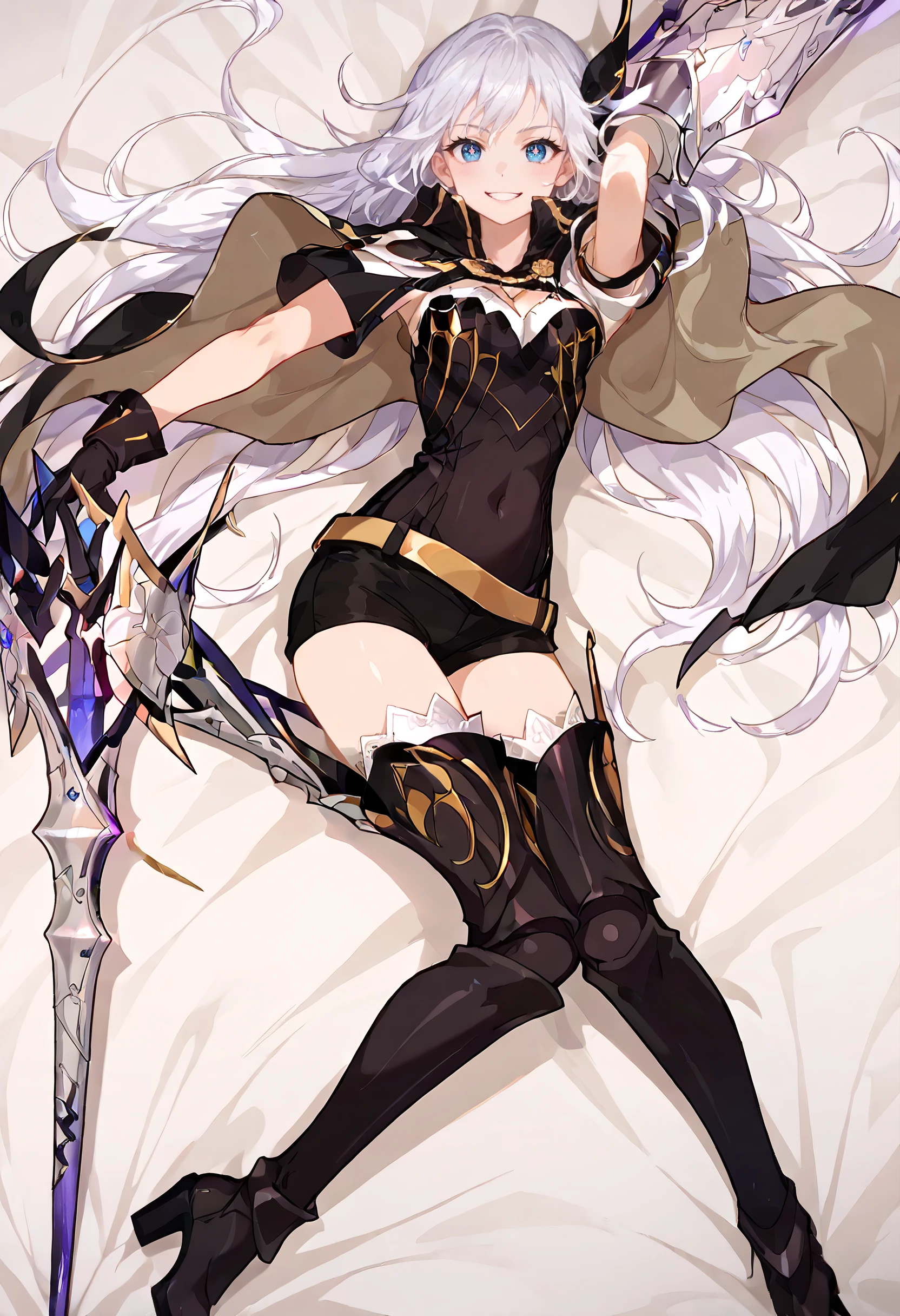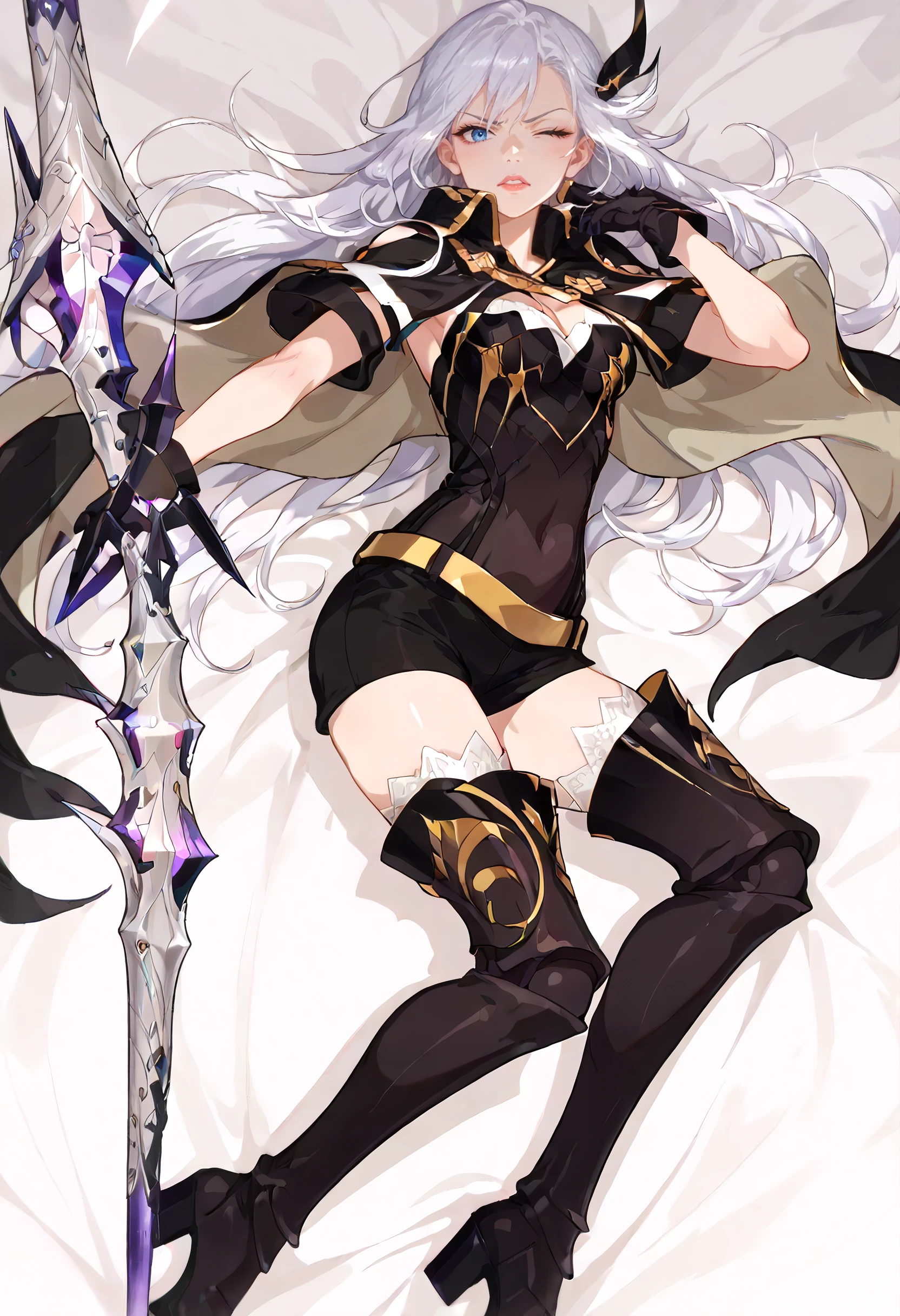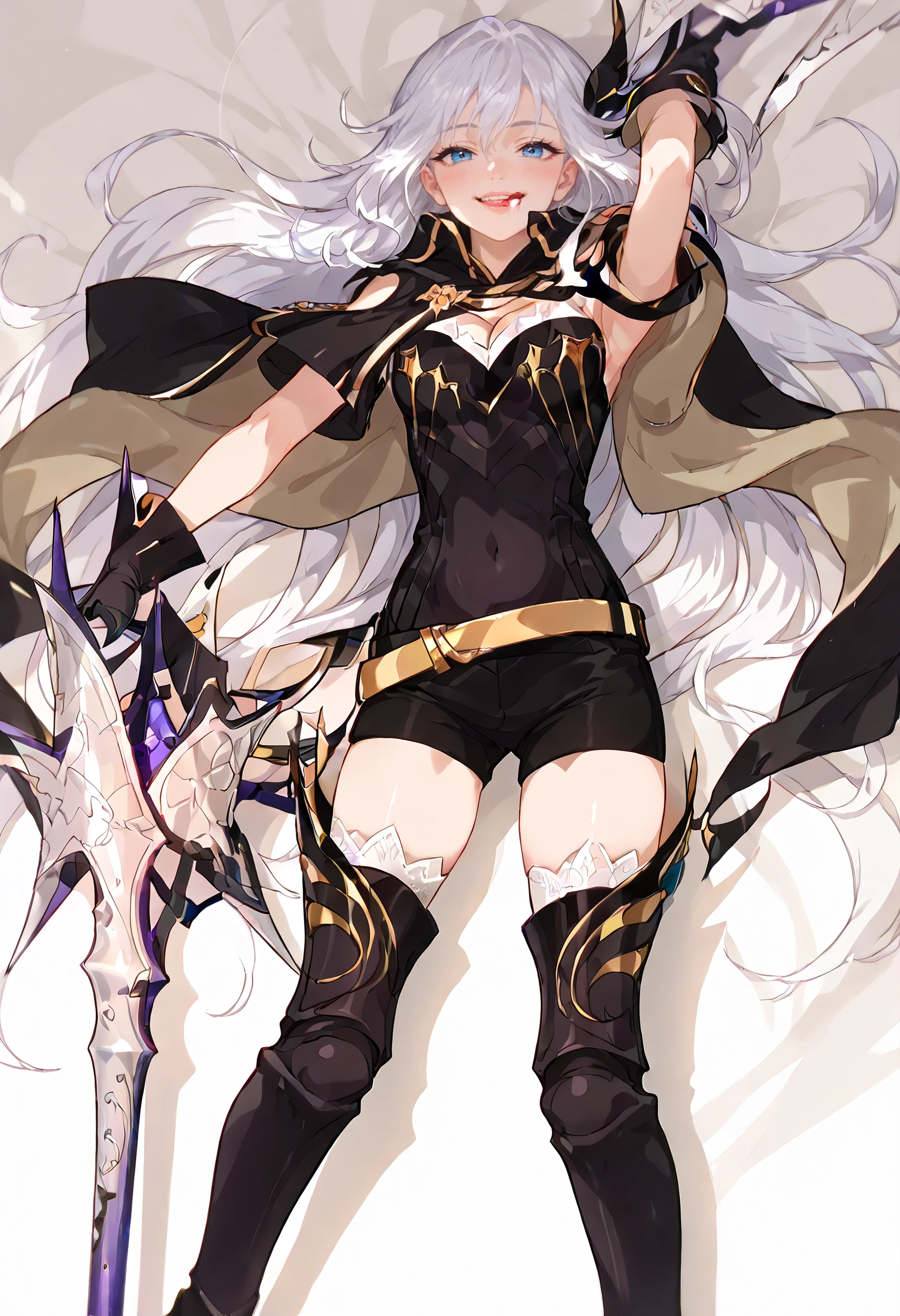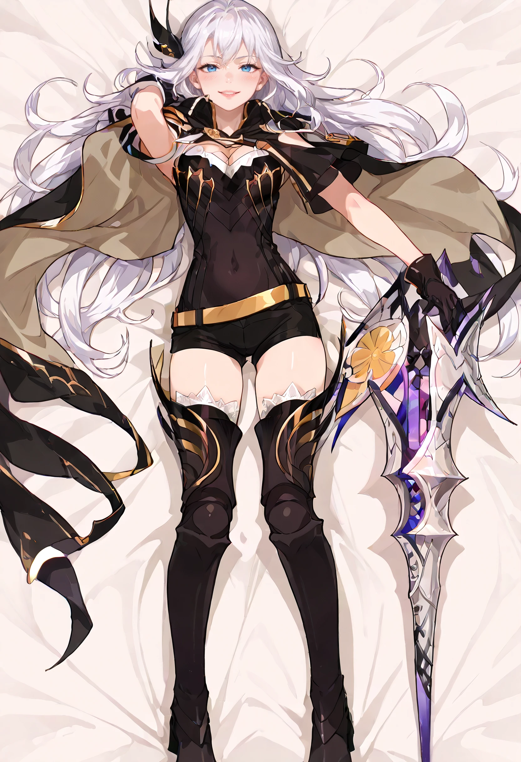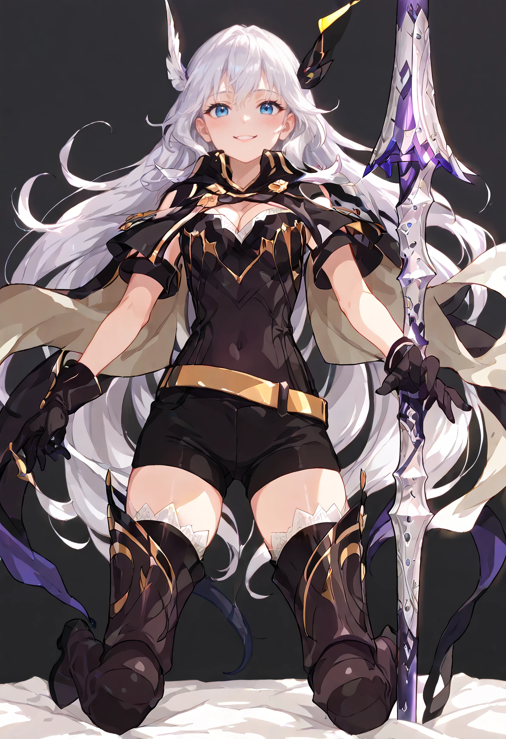 CeciliaOutfit, weapon, polearm, gloves, holding weapon, hair ornament, cape, cleavage, thighhighs, lance, armor, boots, black thighhighs, black gloves, thigh boots, armored boots, belt, huge weapon, covered navel, shorts, black footwear, high heel boots,