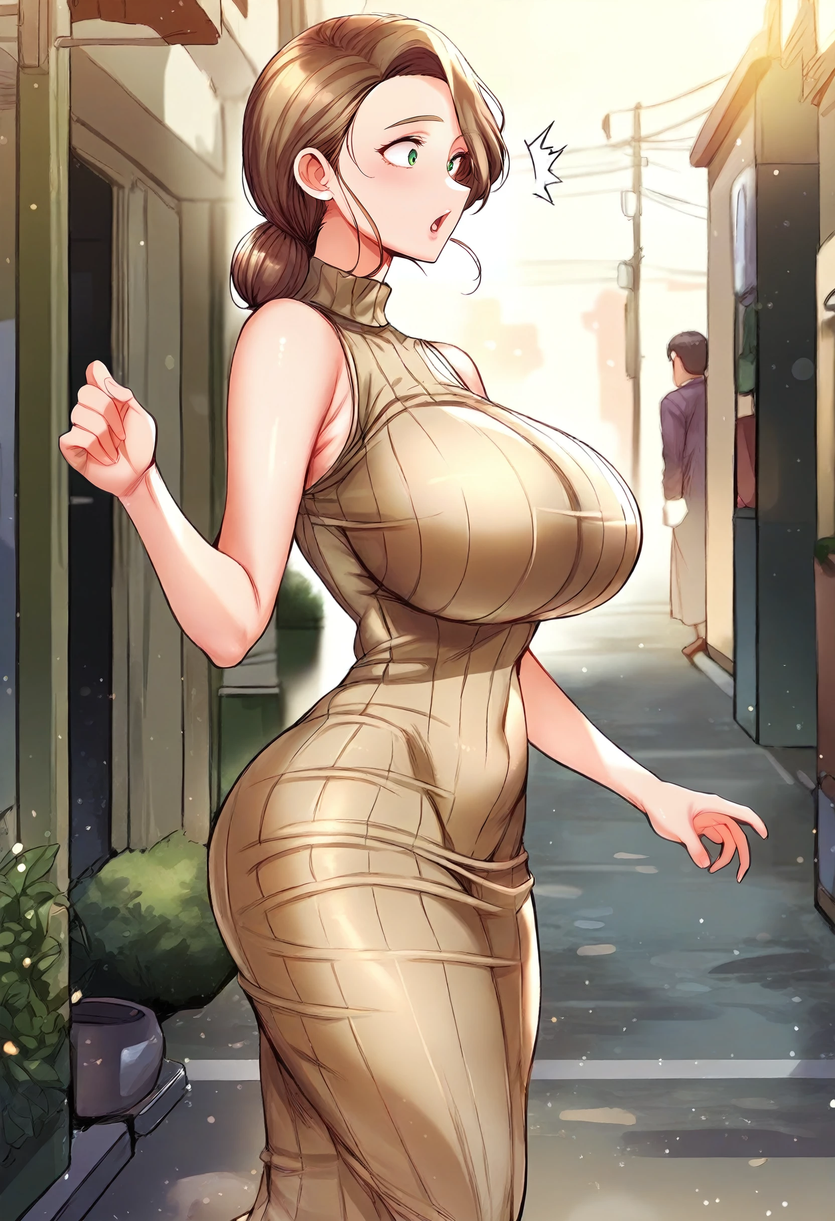 mature female, brown hair, green eyes, long hair, single hair bun