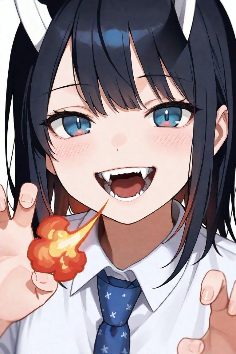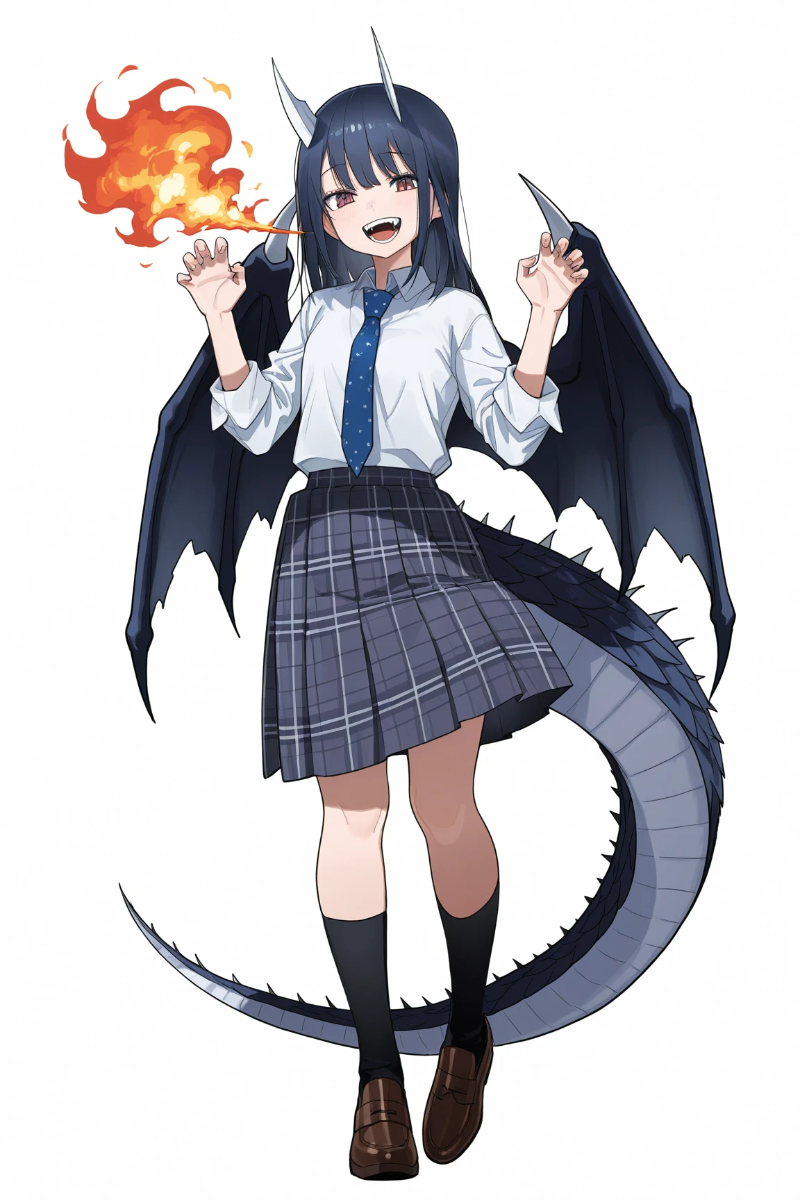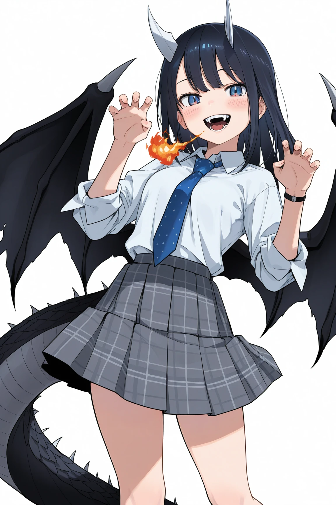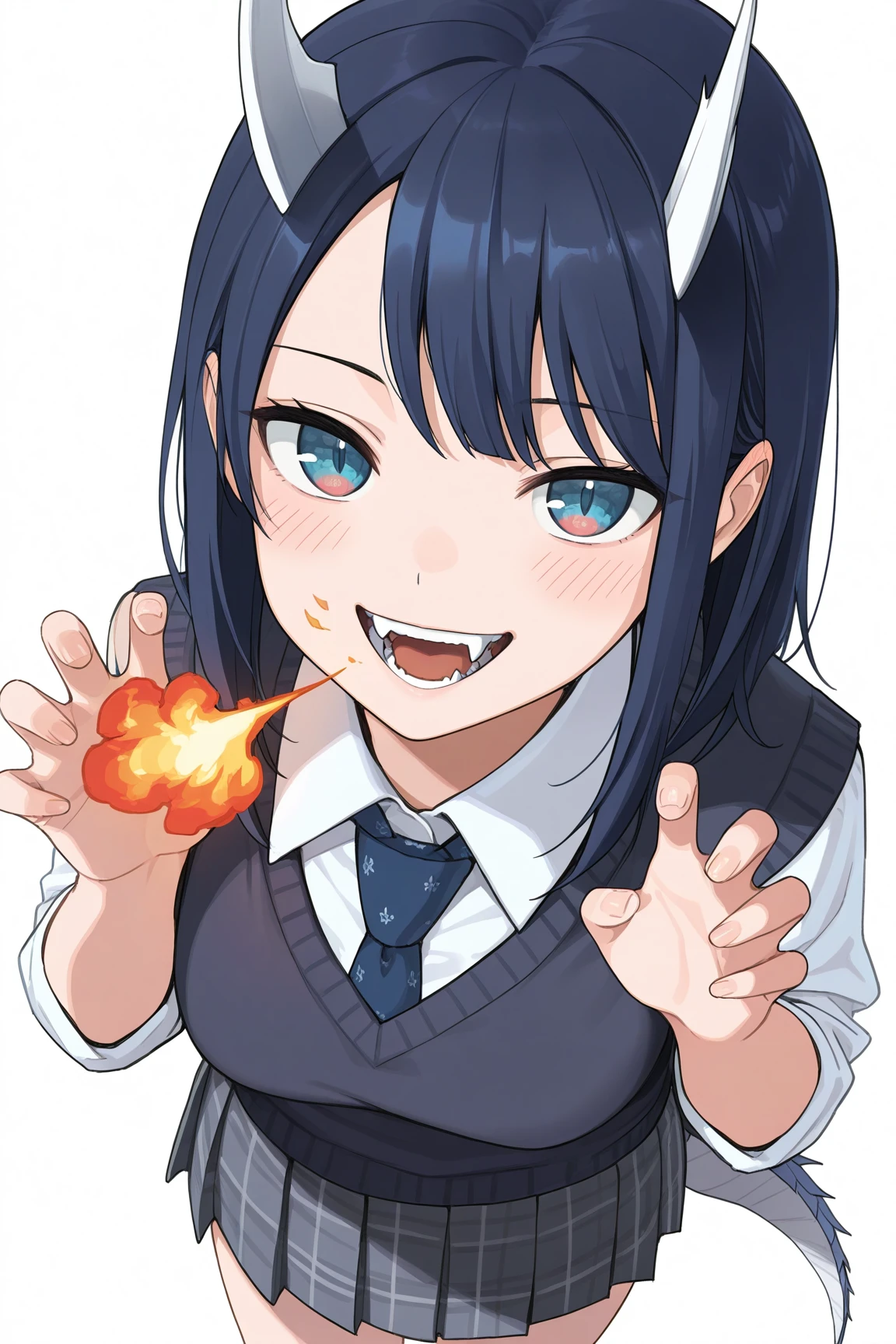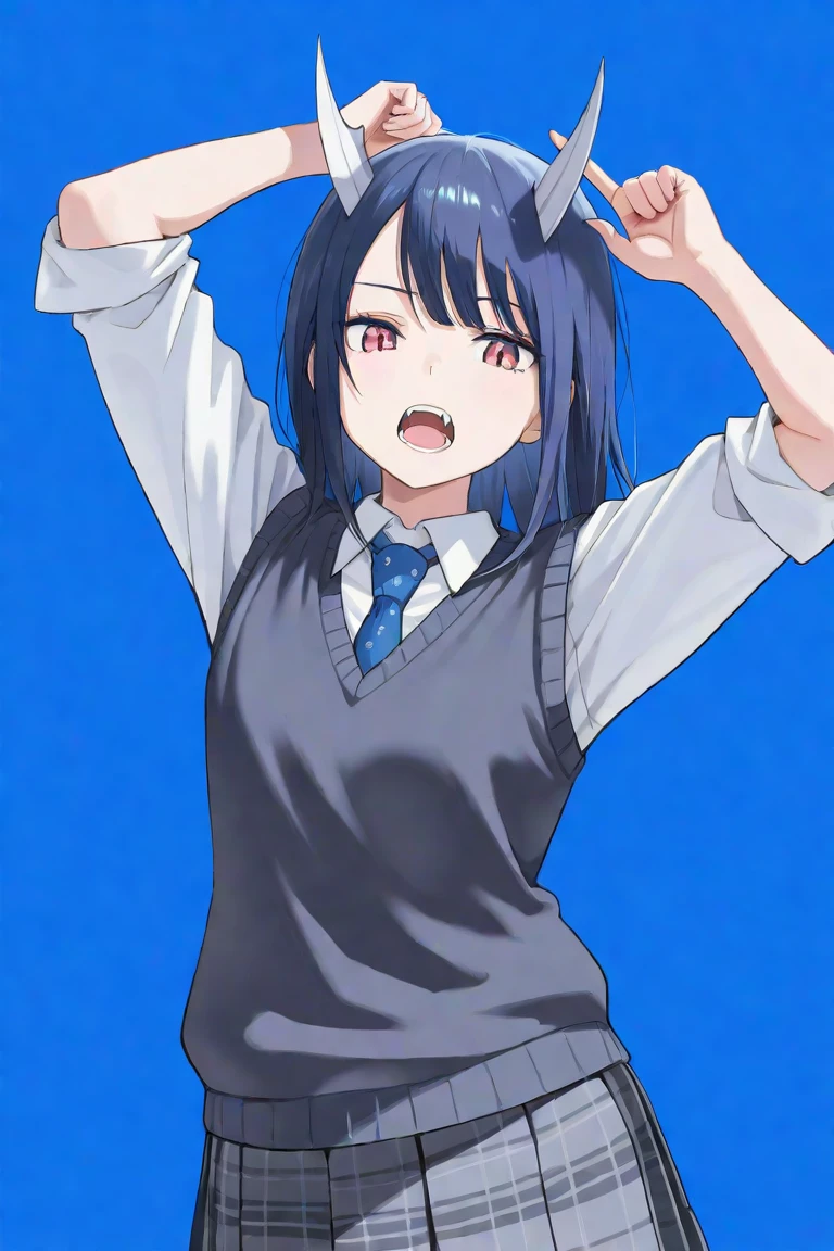 aoki ruri, 1girl, horns, skirt, solo, dragon horns, necktie, medium hair, shirt, blue necktie, dragon girl, dark blue hair, white shirt, pleated skirt, collared shirt, school uniform, sleeves rolled up, fangs, vest, grey skirt, plaid, swept bangs, plaid skirt,