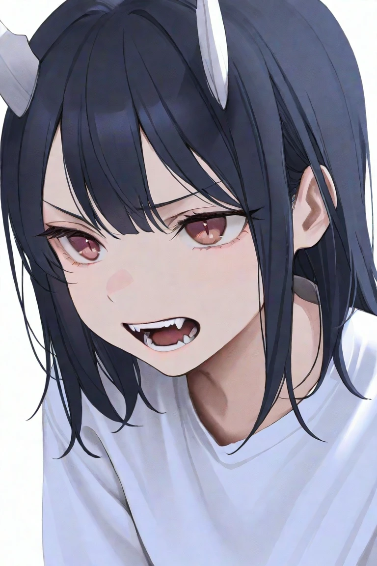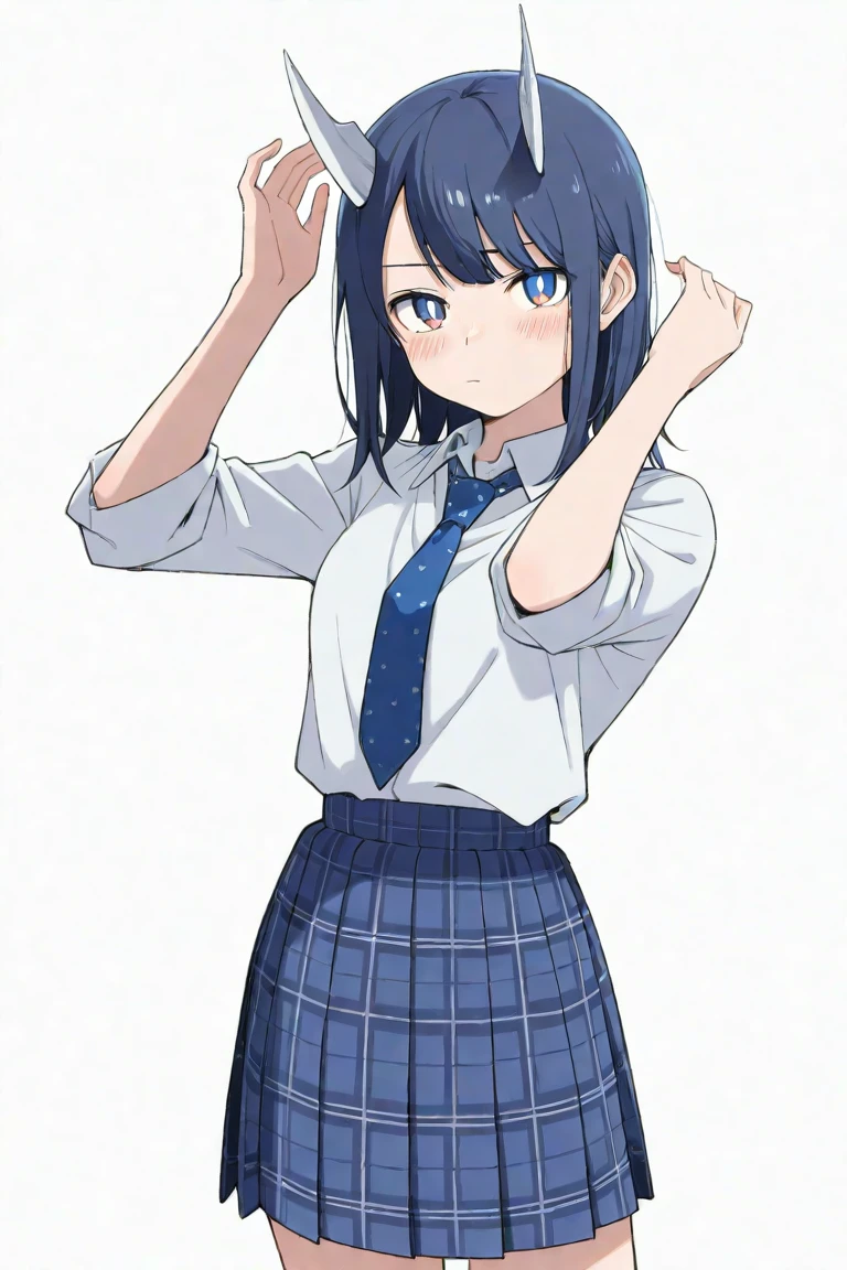 aoki ruri, 1girl, horns, skirt, dark blue hair, solo, medium hair, necktie, shirt, school uniform, dragon horns,