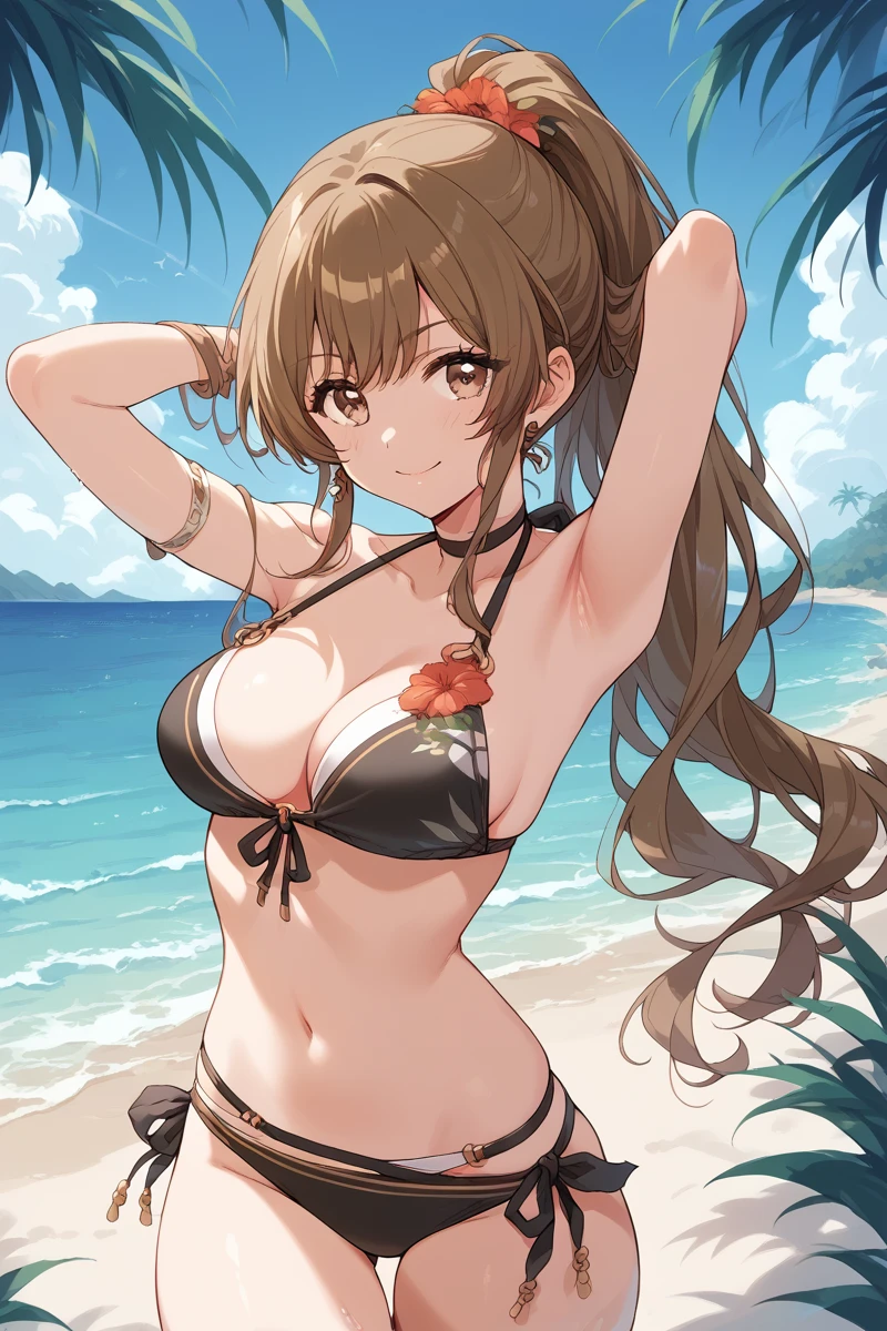 Use Kyoko and 1girl. For a variety of clothes, take as an example prompts from sample images. Brown hair, long hair for hairstyle. Everything works well. Hentai too.