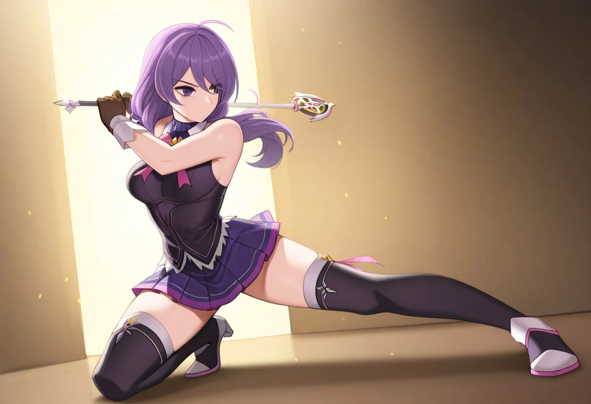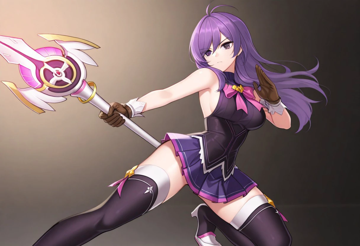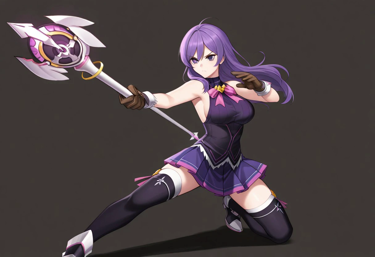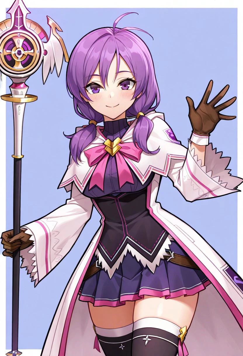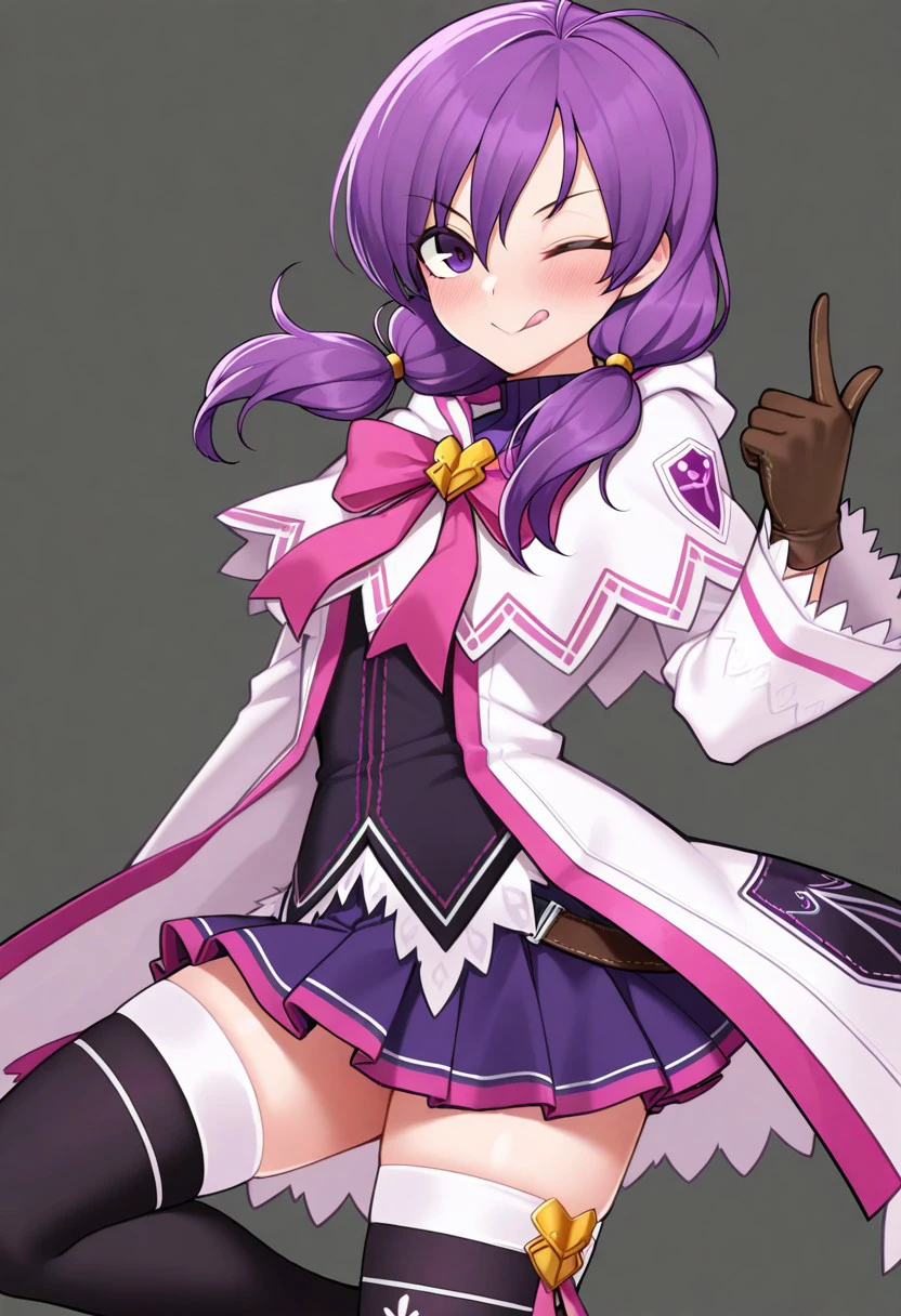 Outfit: brown leather gloves, white and pink coat, pink bow, dark purple shirt, purple and pink miniskirt, pleated skirt, black thighhighs, white and pink shoes