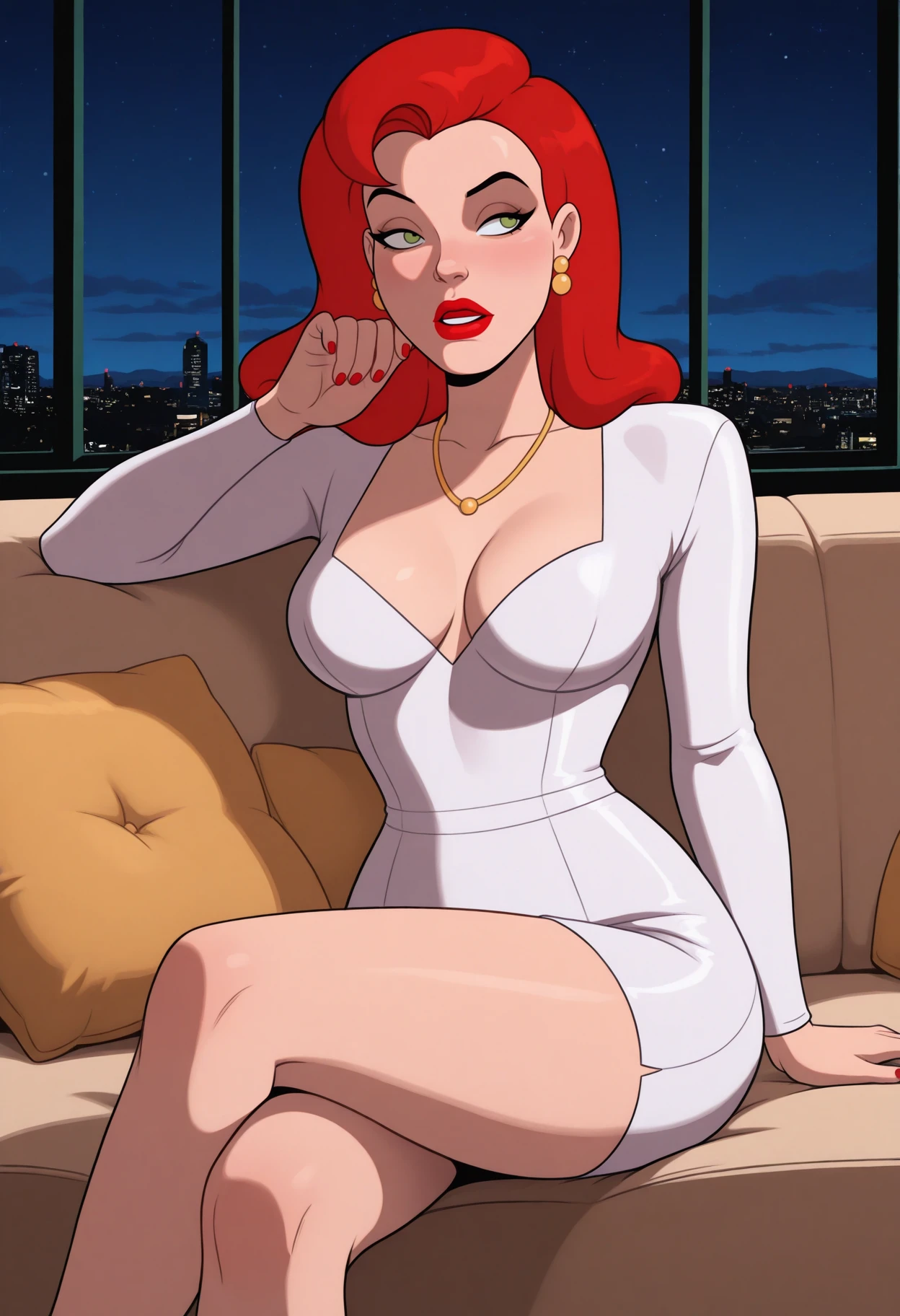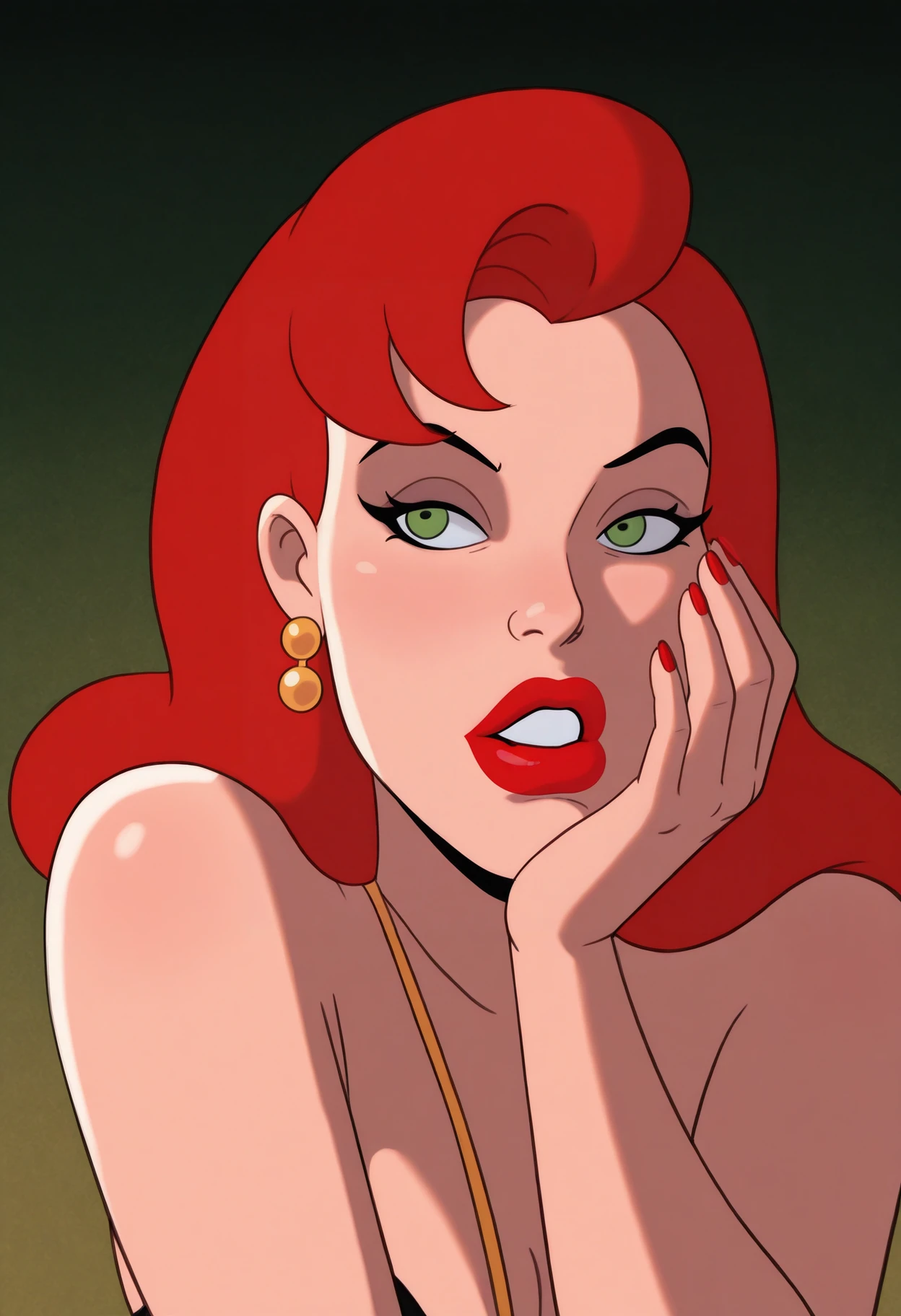 1girl, solo, green eyes, red hair, long hair, breasts, medium breasts, lipstick, red lips, nail polish, red nails,