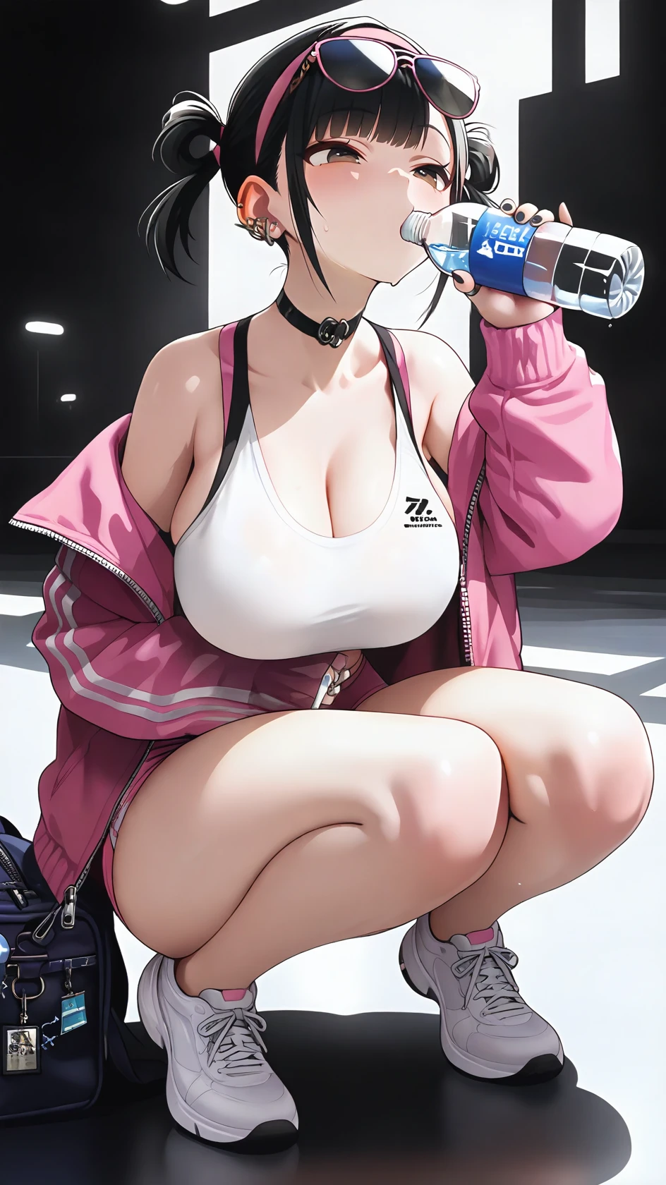 black hair, short hair,, large breasts, twintails, brown eyes, sunglasses,, pink-framed eyewear, buruma, pink shorts, eyewear on head, choker, pink hairband, white sports bra, pink jacket, sneakers, bare legs, ear piercing, bag, jewelry,