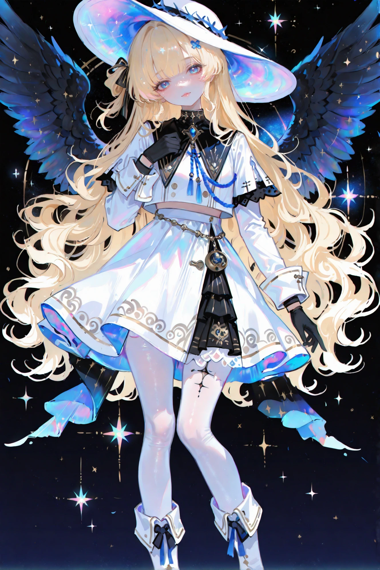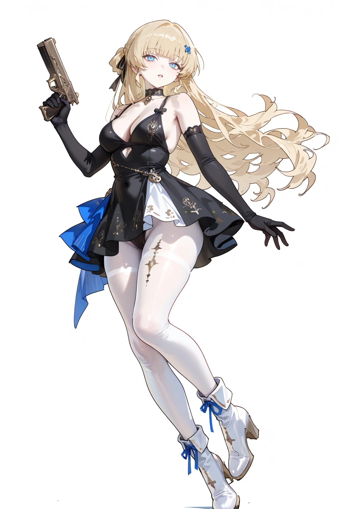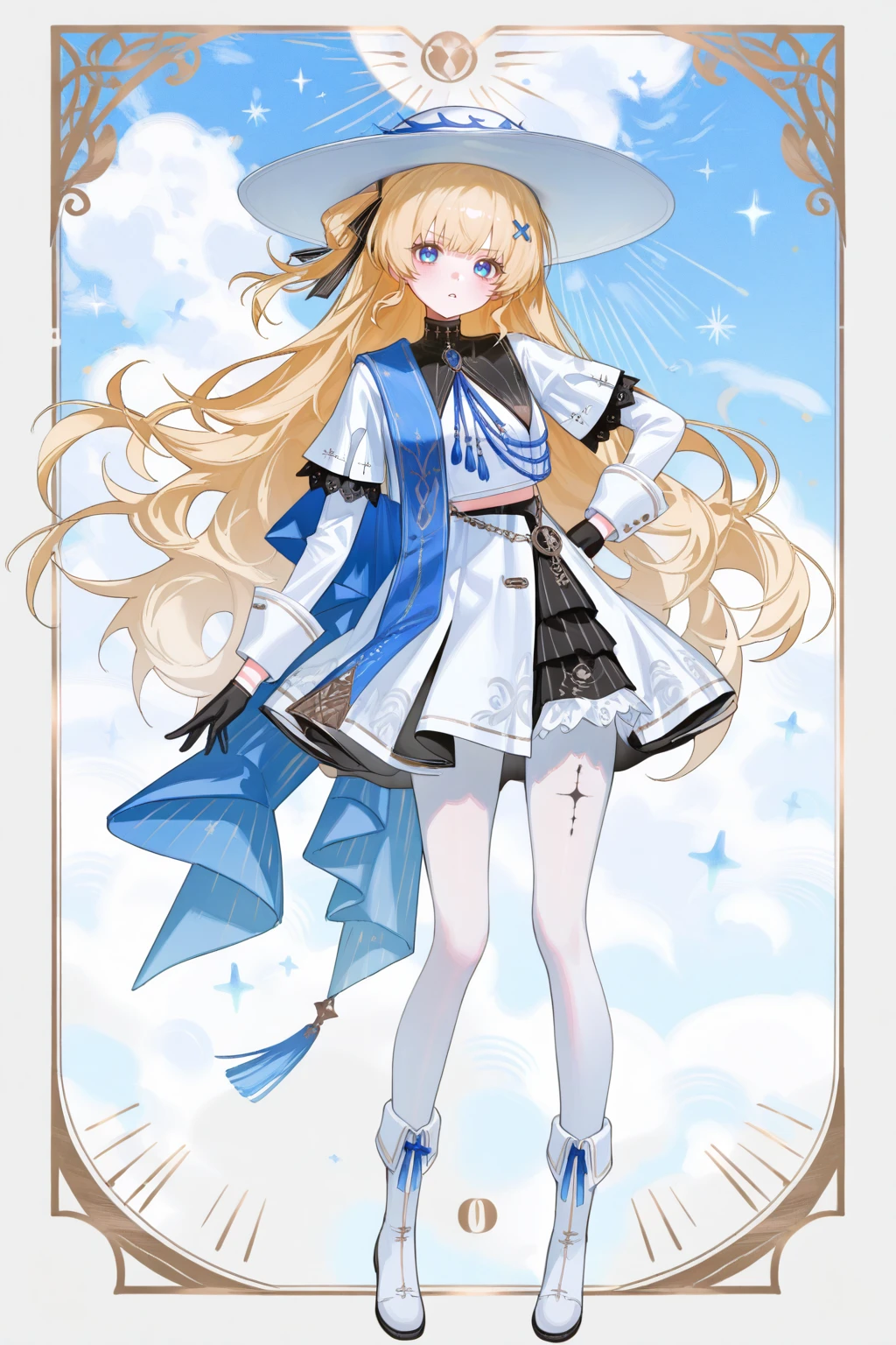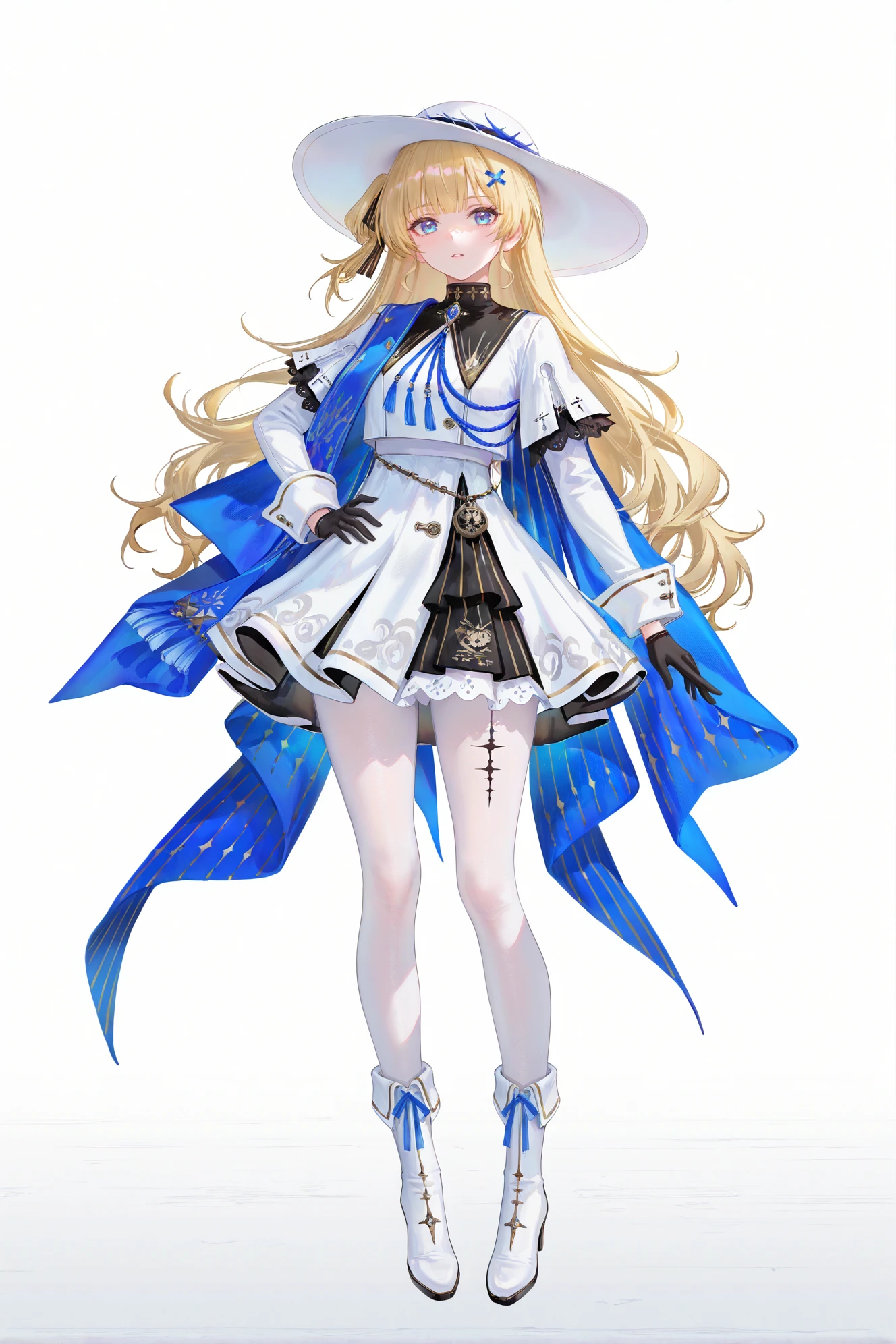 Phoebe \(Wuthering Waves\), clothes: Phoebe def white skirt and whit hat, white see-through pantyhose, 1girl, gloves, long blonde hair, long hair, black gloves, blue eyes, white boots,