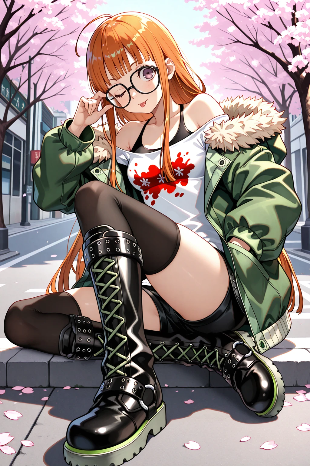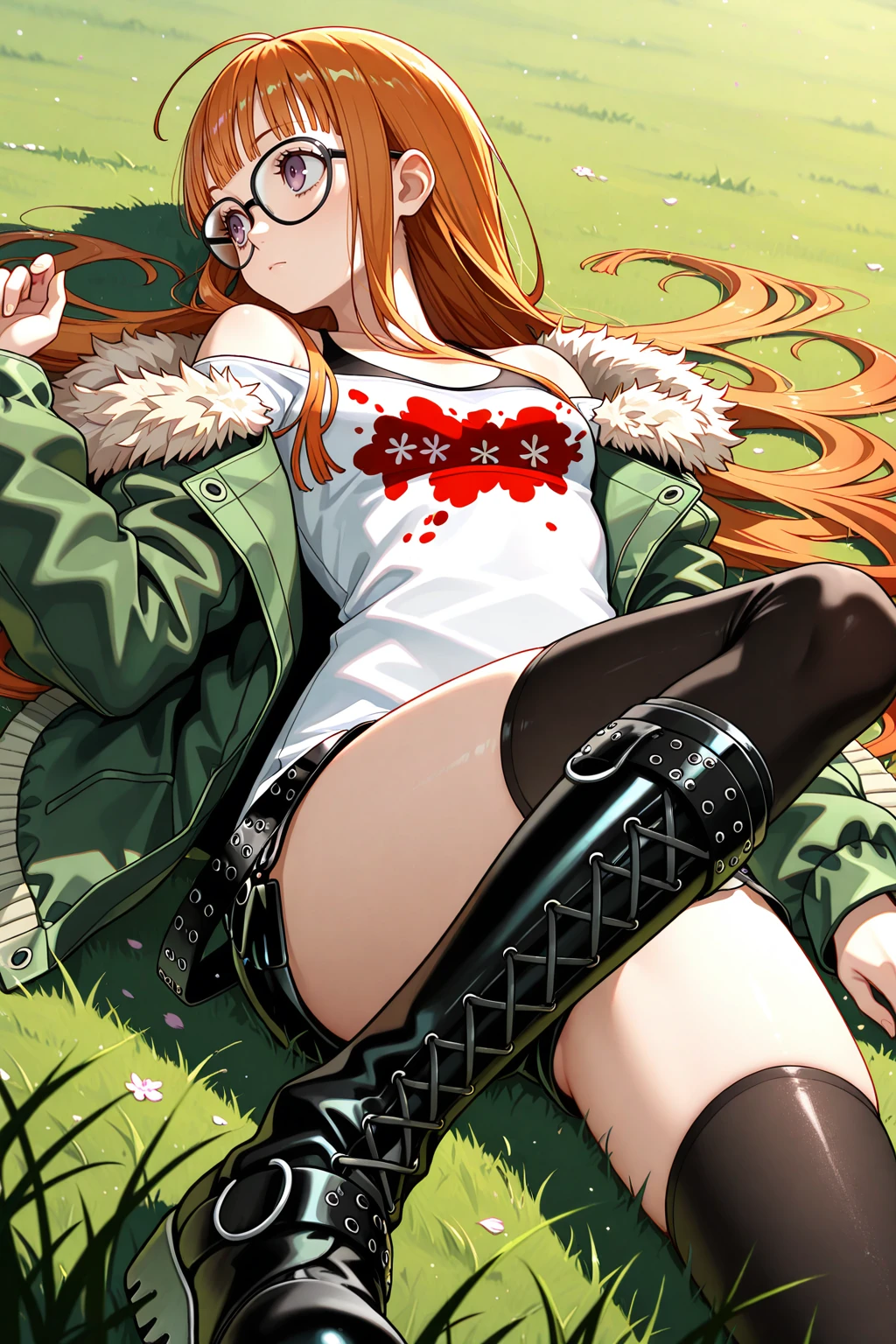 green jacket, fur-trimmed jacket, long sleeves, white shirt, black shorts, short shorts, knee boots, cross-laced footwear, black thighhighs, Description