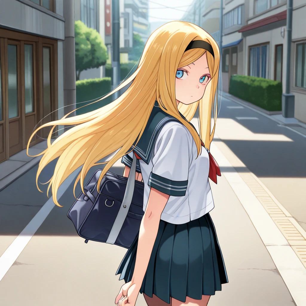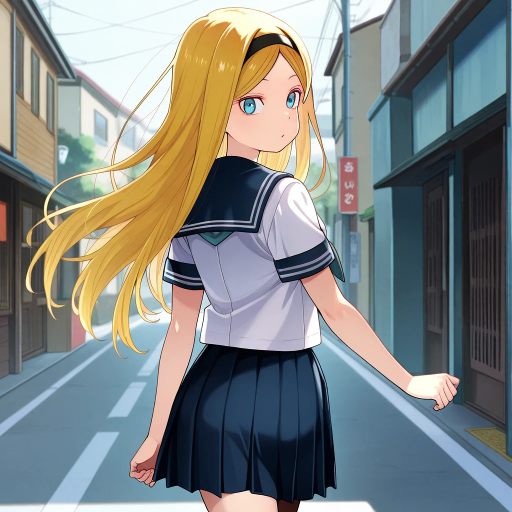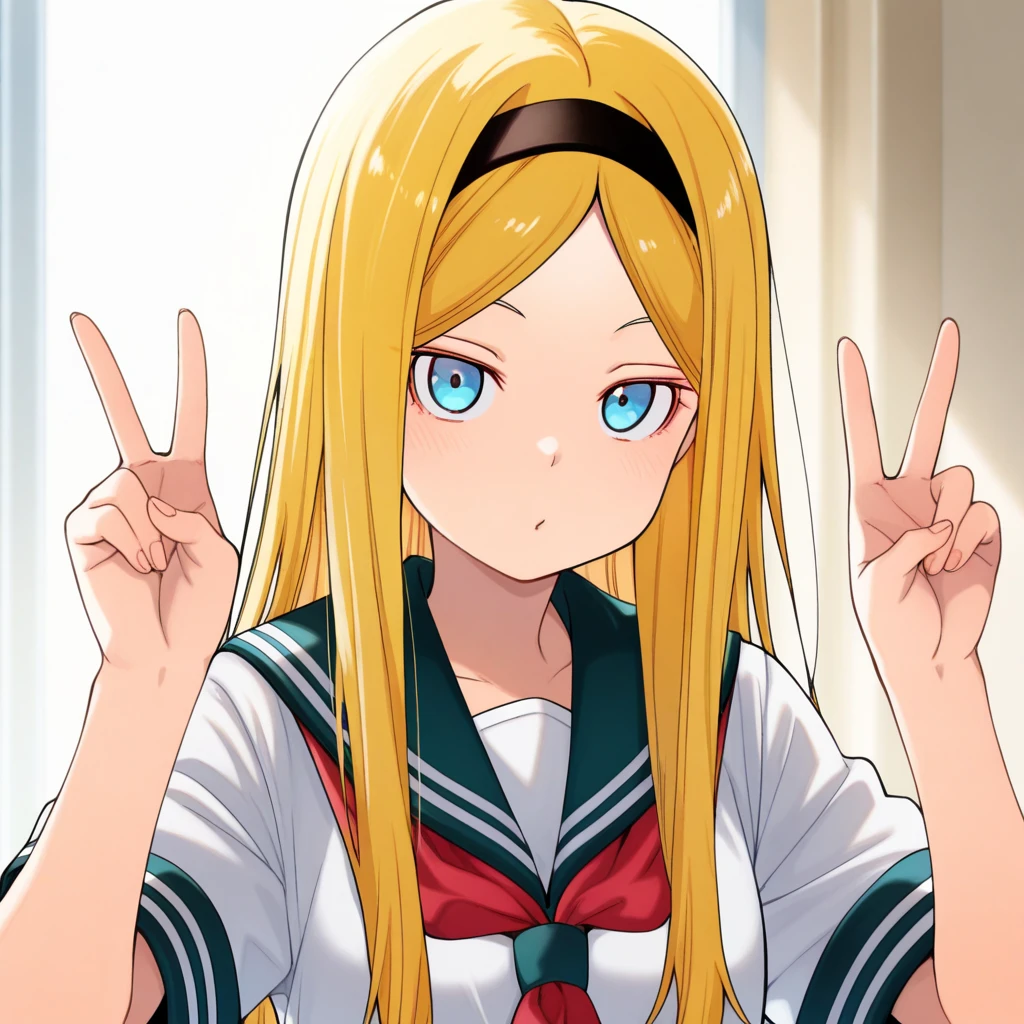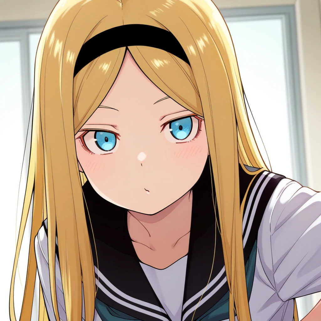 komachikyoko,1girl, solo, 18yo, long hair, parted bangs, long hair, hairband, blue eyes, yellow hair, black hairband, serafuku,
