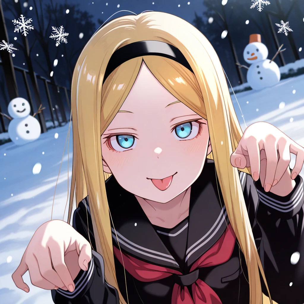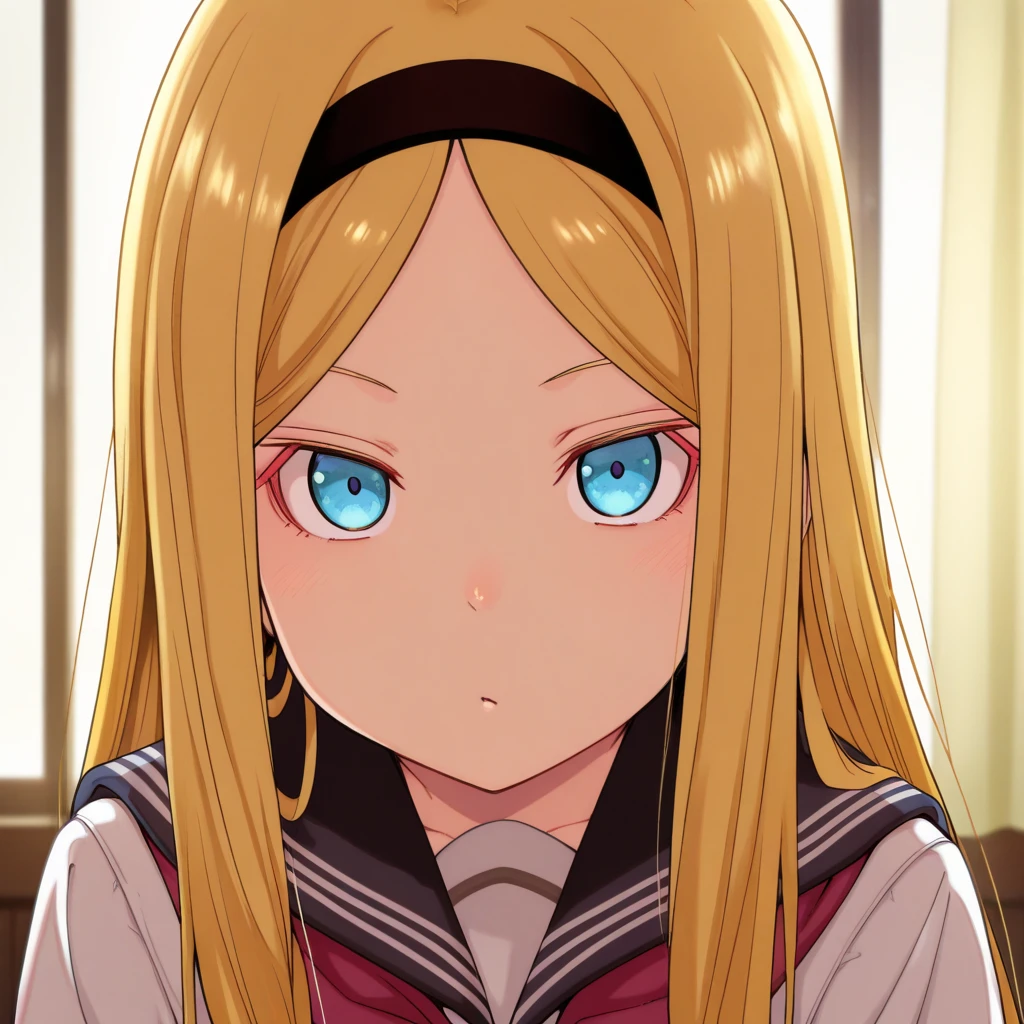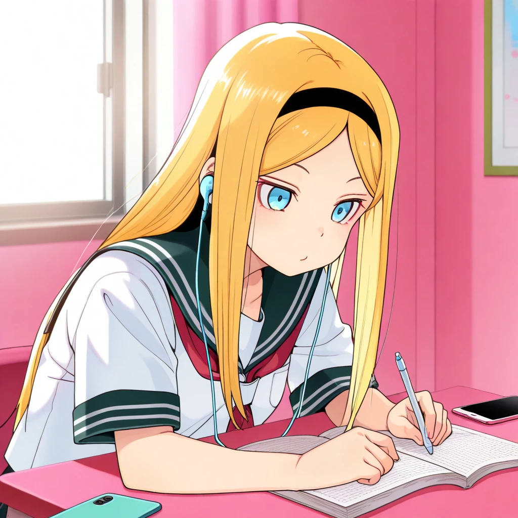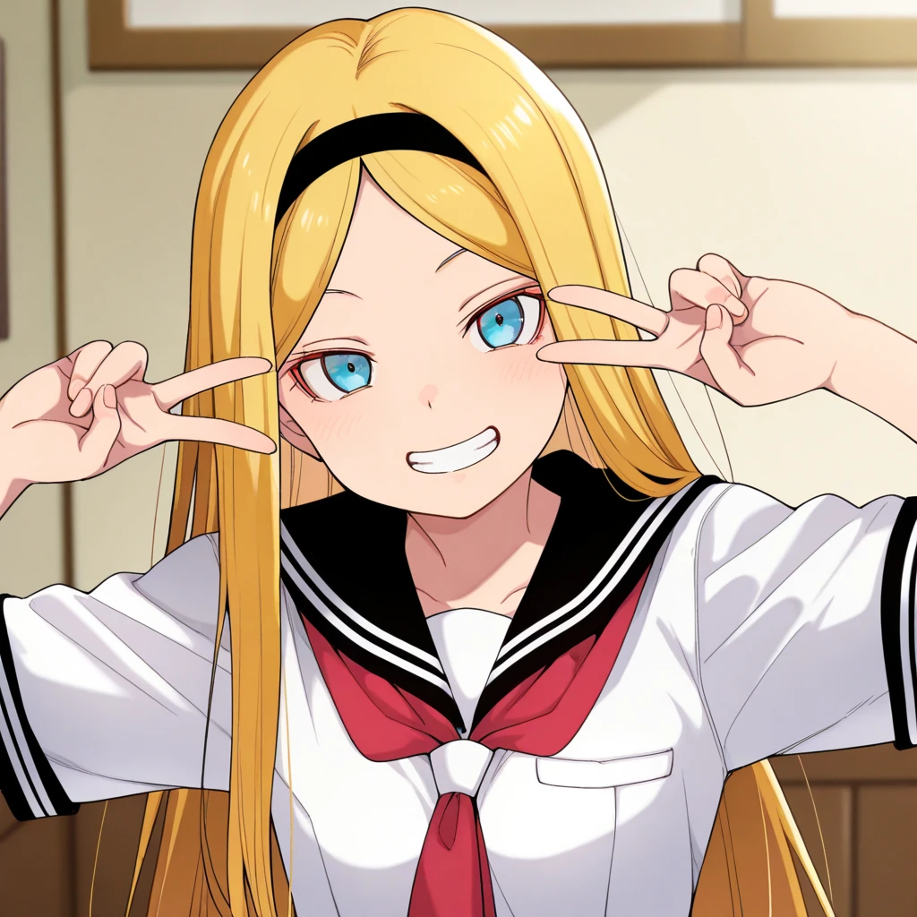 komachikyoko,1girl, solo, 18yo, long hair, parted bangs, long hair, hairband, blue eyes, yellow hair, black hairband, serafuku,