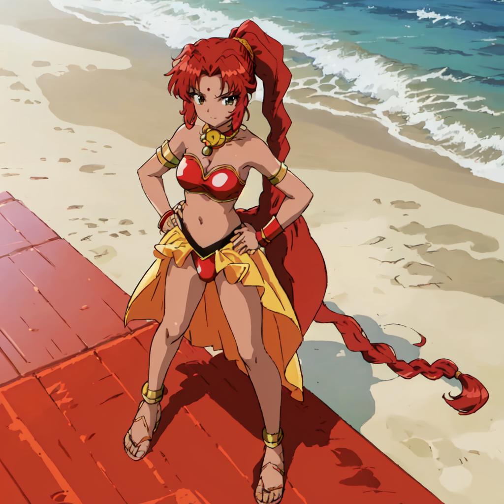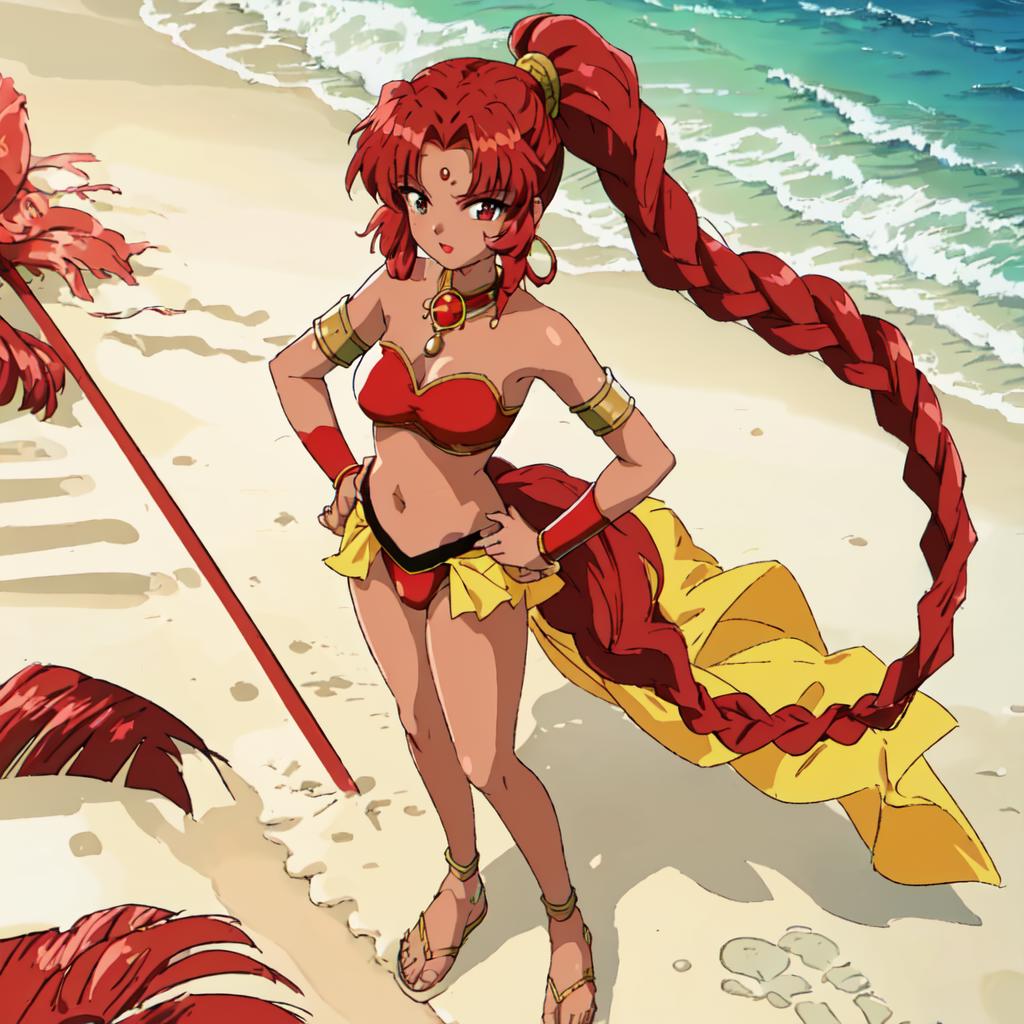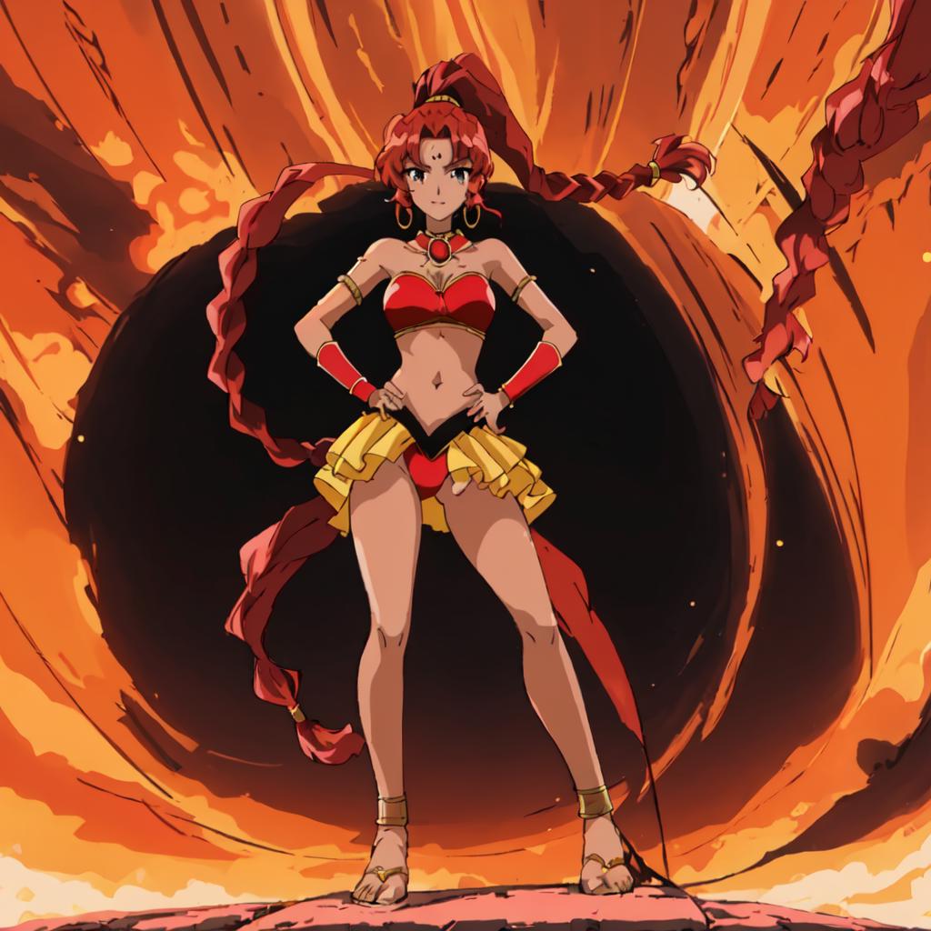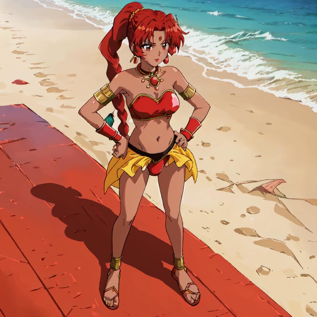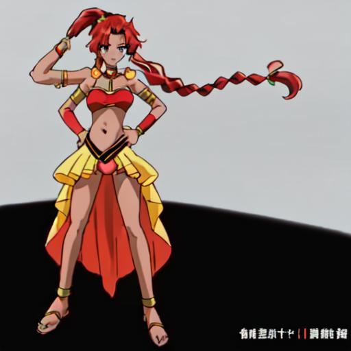 Chizeta, 1girl, solo, navel, jewelry, braid, red hair,choker, dark-skinned female, sandals, high ponytail, armlet, midriff, side ponytail, red panties,pink lips, lipstick