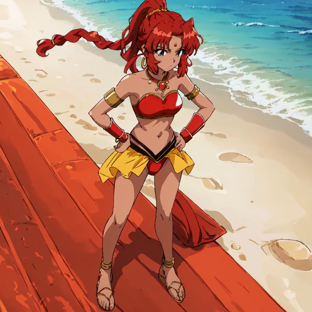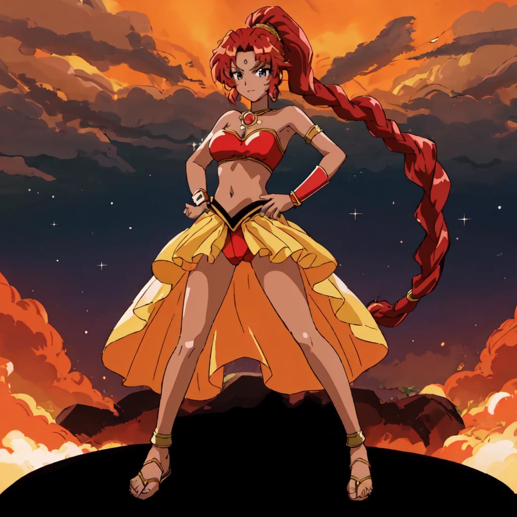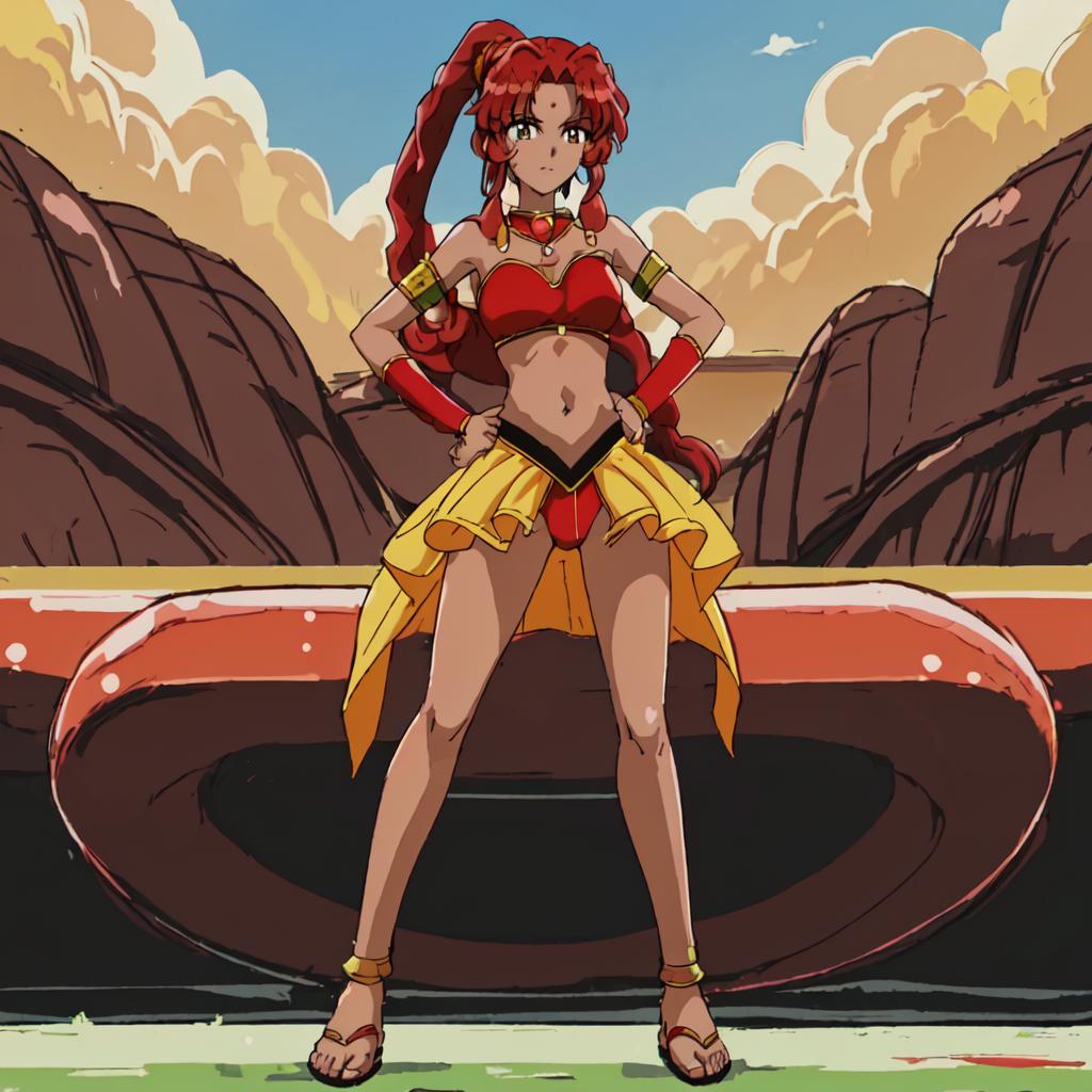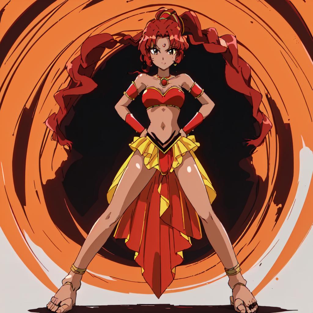 Chizeta, 1girl, solo, navel, jewelry, braid, red hair,choker, dark-skinned female, sandals, high ponytail, armlet, midriff, side ponytail, red panties,pink lips, lipstick
