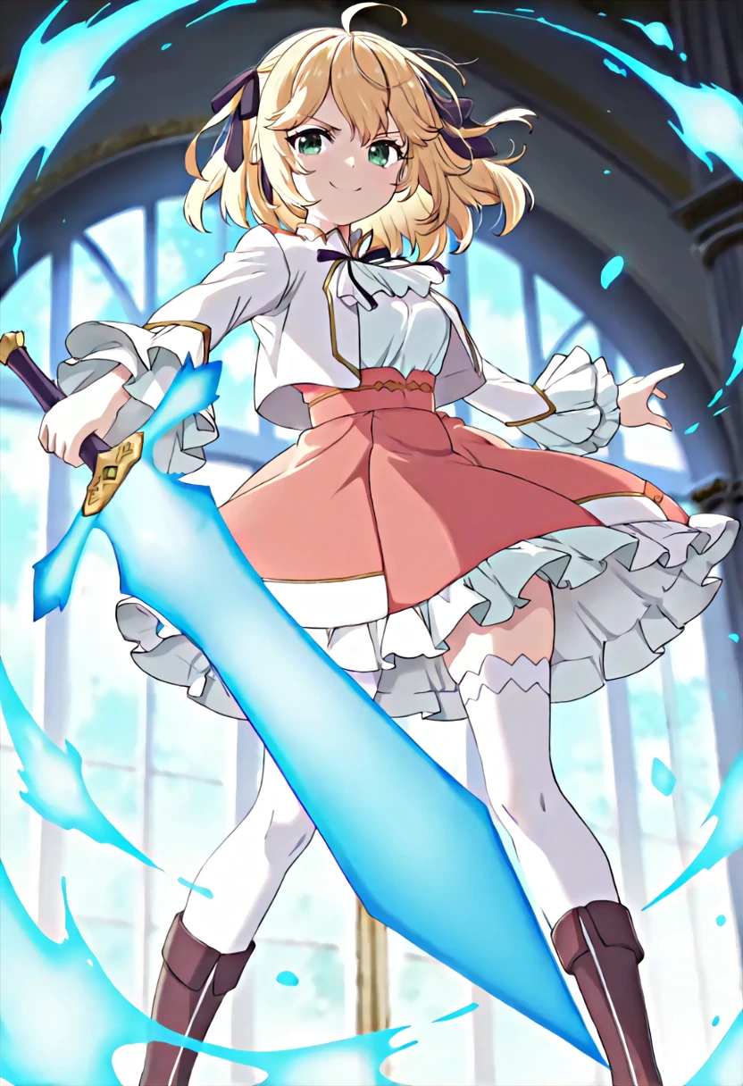 anisphia-default,anisphia wynn palettia,green eyes,blonde hair,medium hair,hair ribbon,white jacket,white shirt,pink skirt,frilled skirt, white thighhighs,brown boots