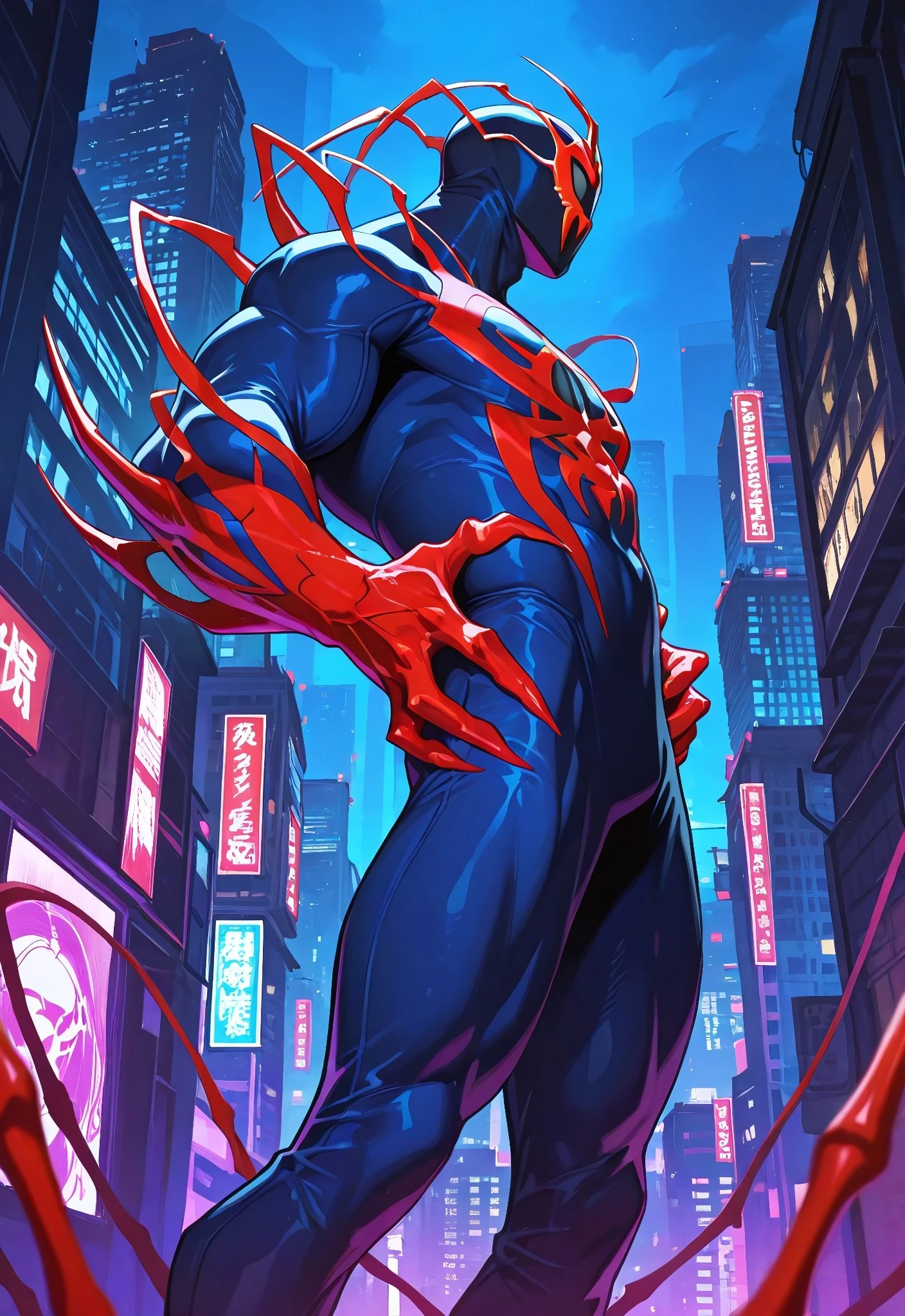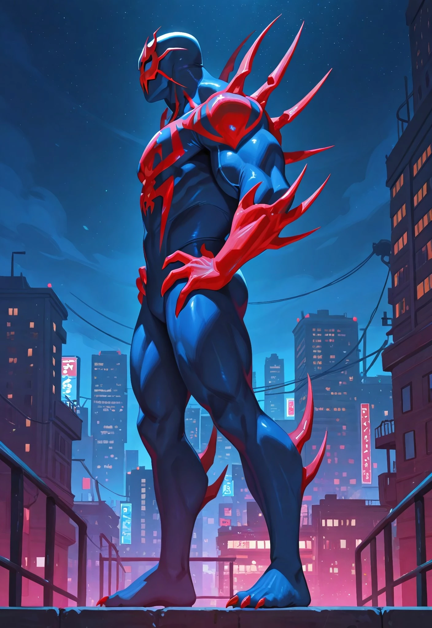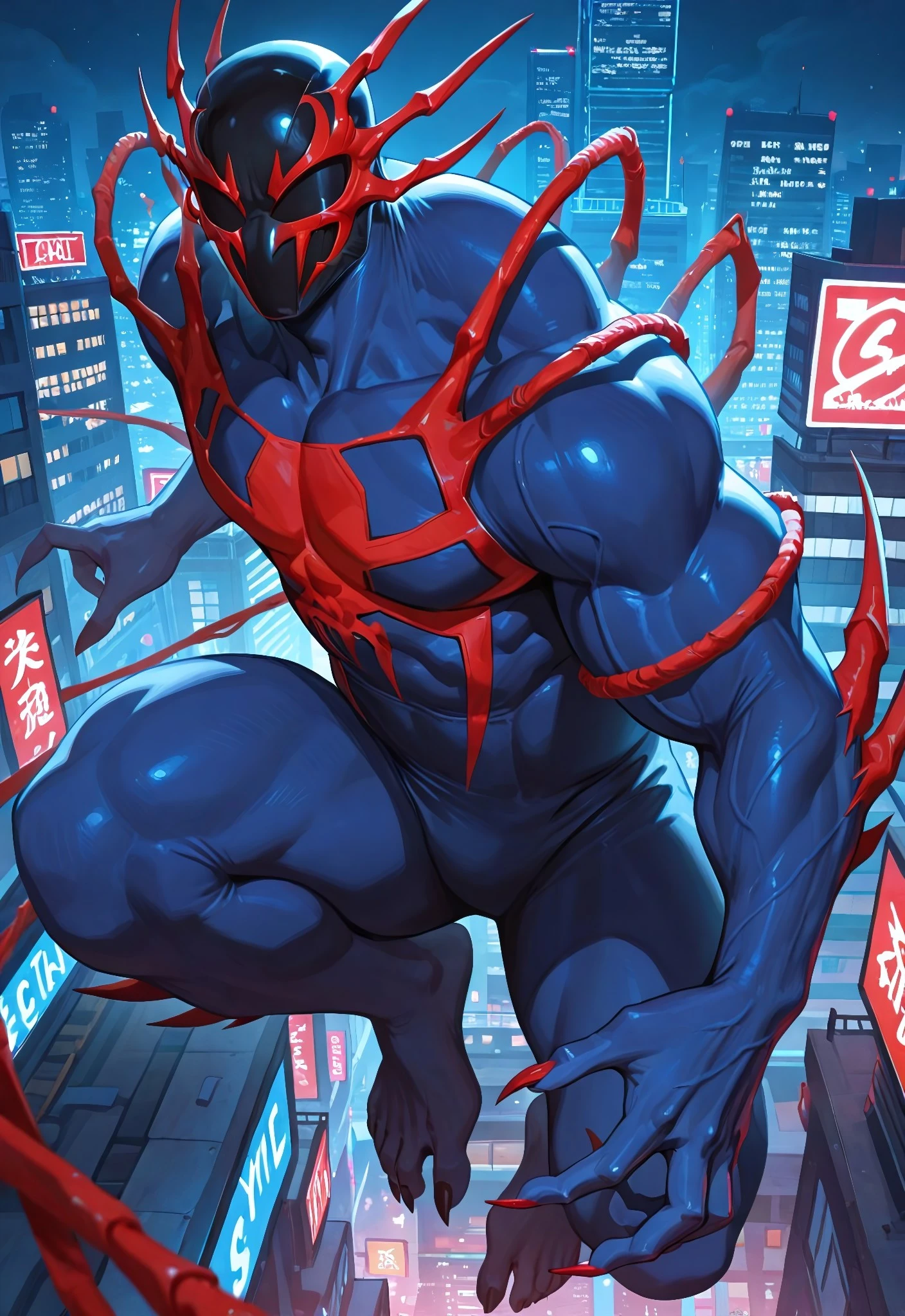 2099spider_symb(comics)XL, body suit, blue suit, red spider_print, muscular, 1boy, solo, mask, claws, feet,Symbiote Spider-Man 2099 Illustrious: