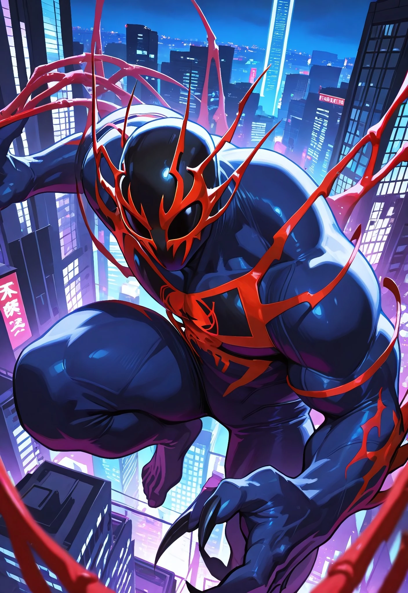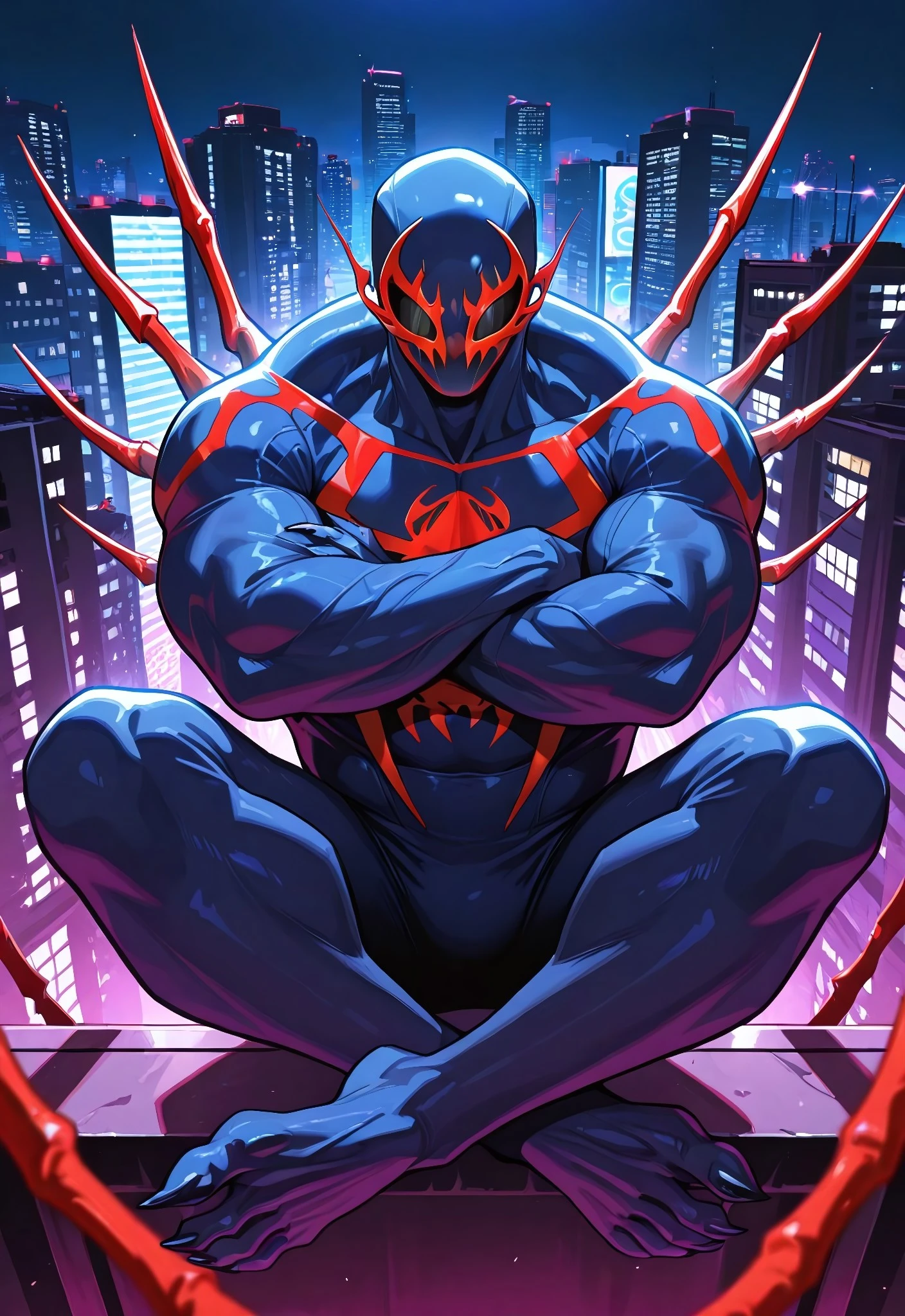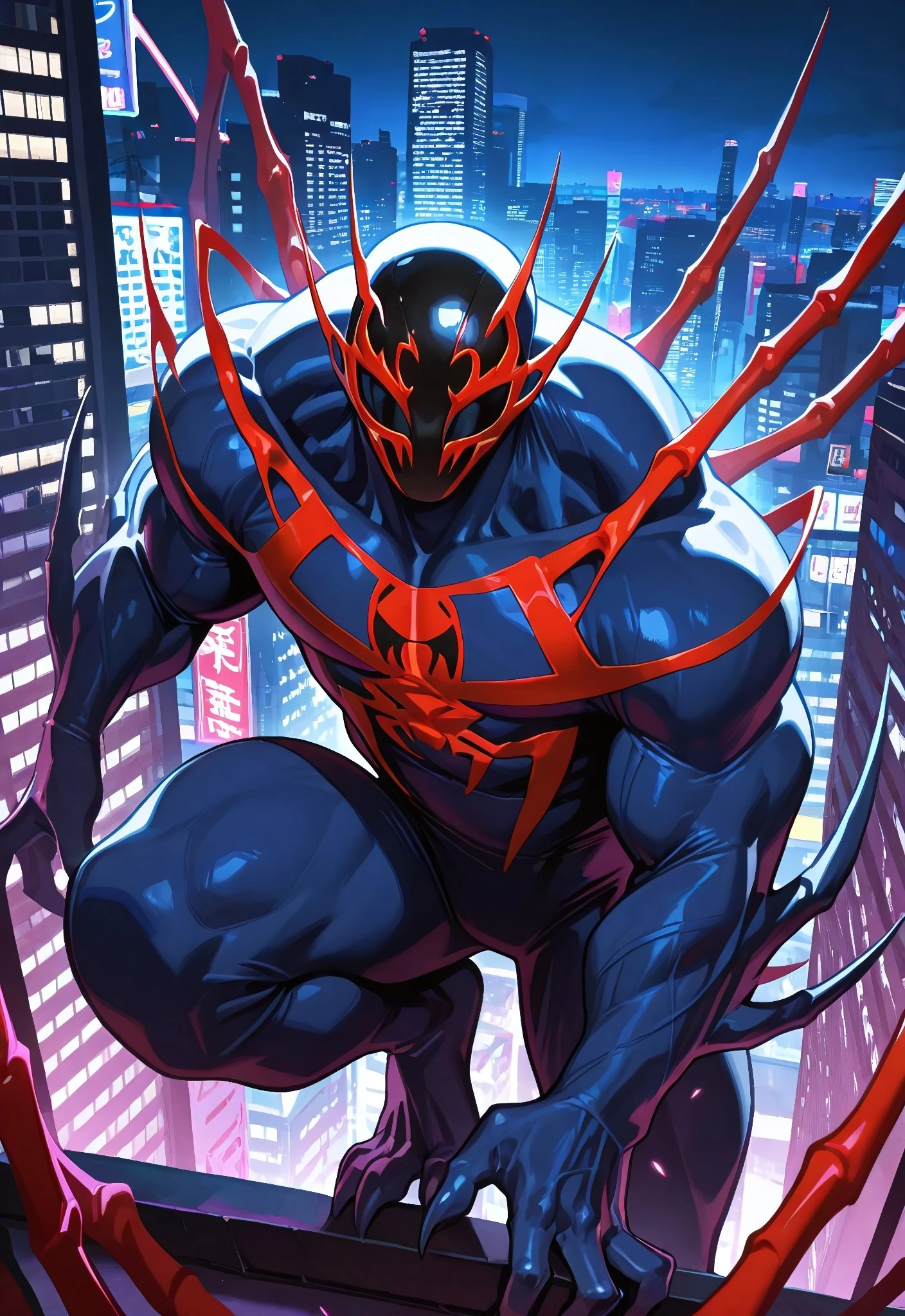 2099spider_symb(comics)XL, body suit, blue suit, red spider_print, muscular, 1boy, solo, mask, claws, feet,Symbiote Spider-Man 2099 Illustrious: