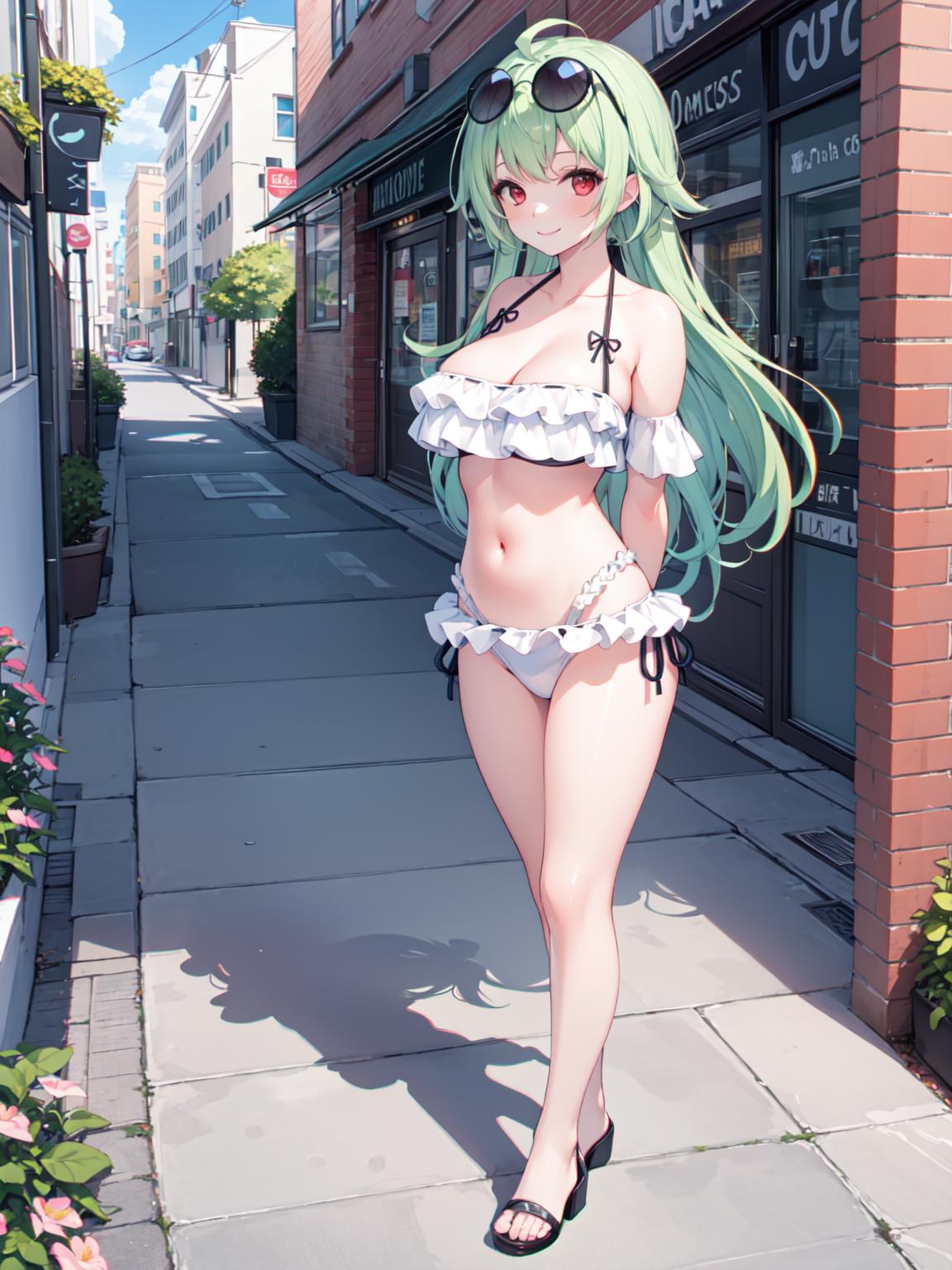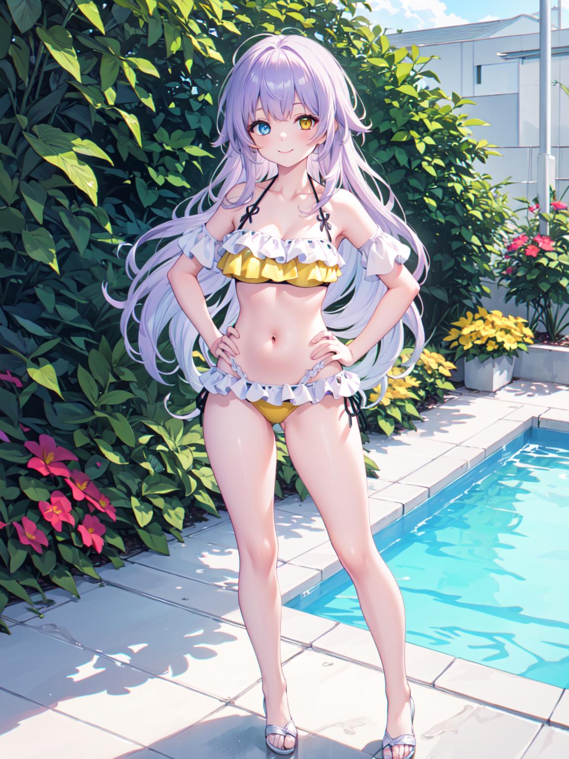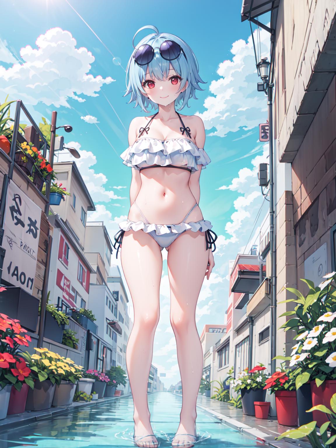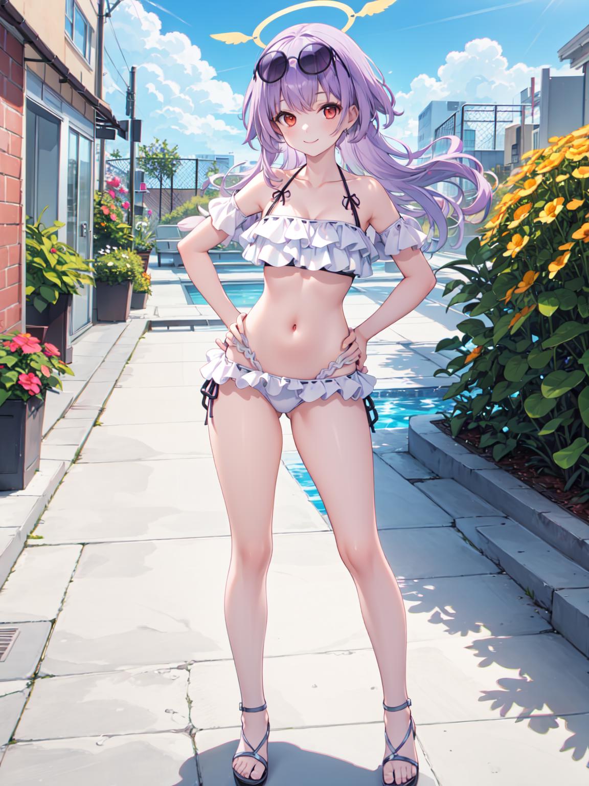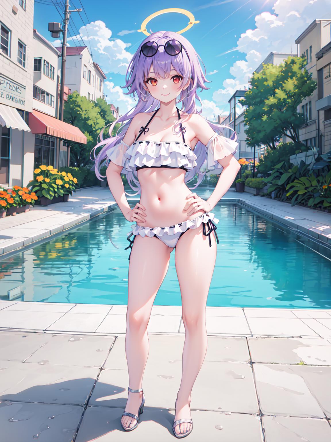 触发词:hifumi bikini 可选提示词:halo, 会出现该角色的光环,或者sunglasses,可以做出太阳镜 推荐权重:0.7,bikini 颜色类可能可以修改底层的颜色。