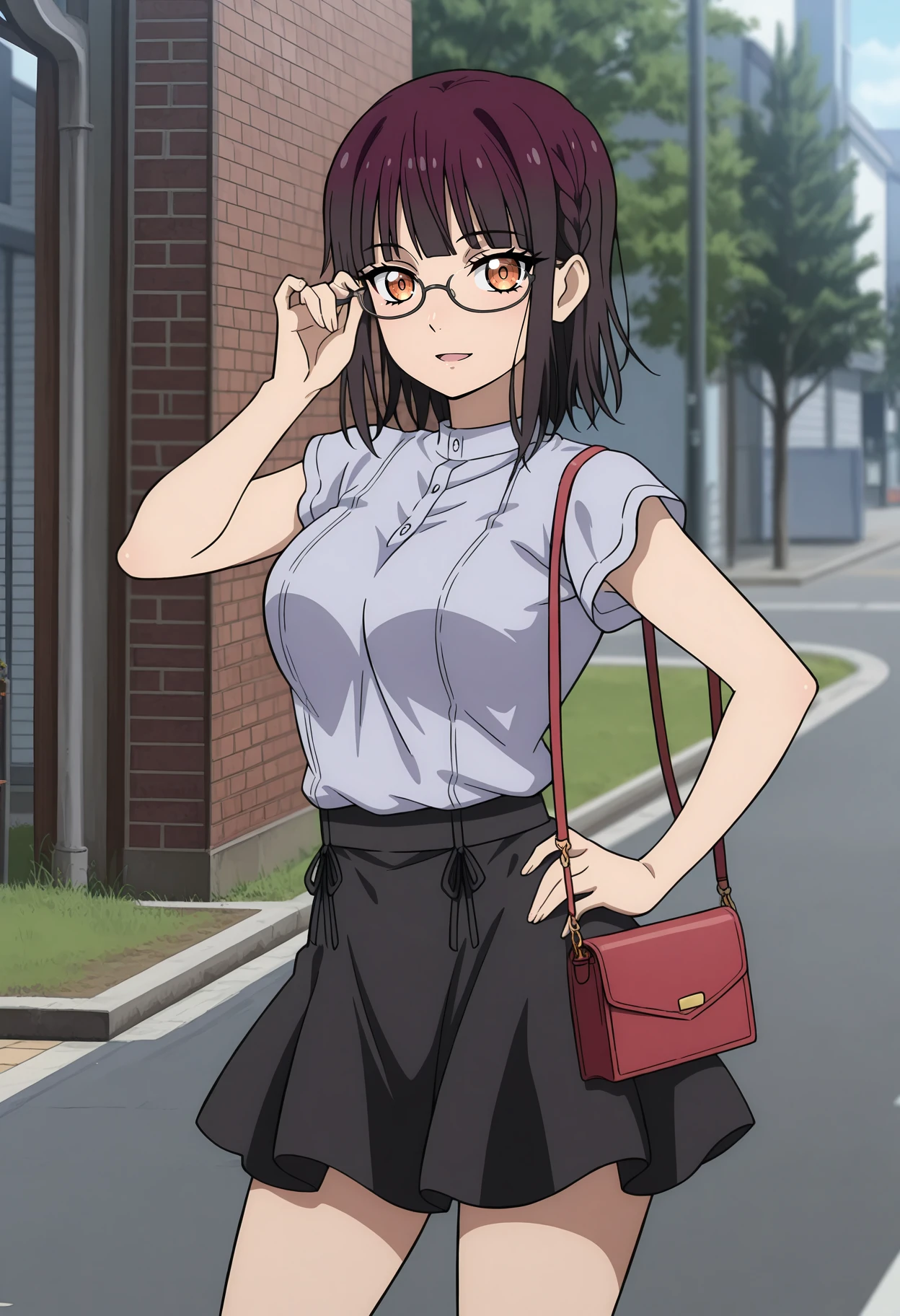 grey shirt, short sleeves, miniskirt, black skirt, red handbag