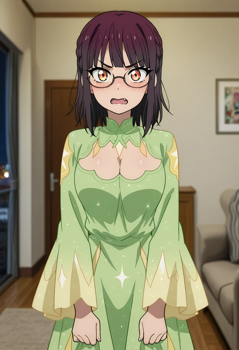 green dress, cleavage cutout, medium breasts, sparkle print, wide sleeves, long dress