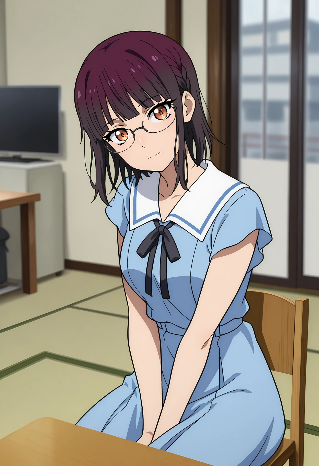 blunt bangs, side braid, medium hair, multicolored hair, purple hair, black hair, multicolored eyes, orange eyes, glasses