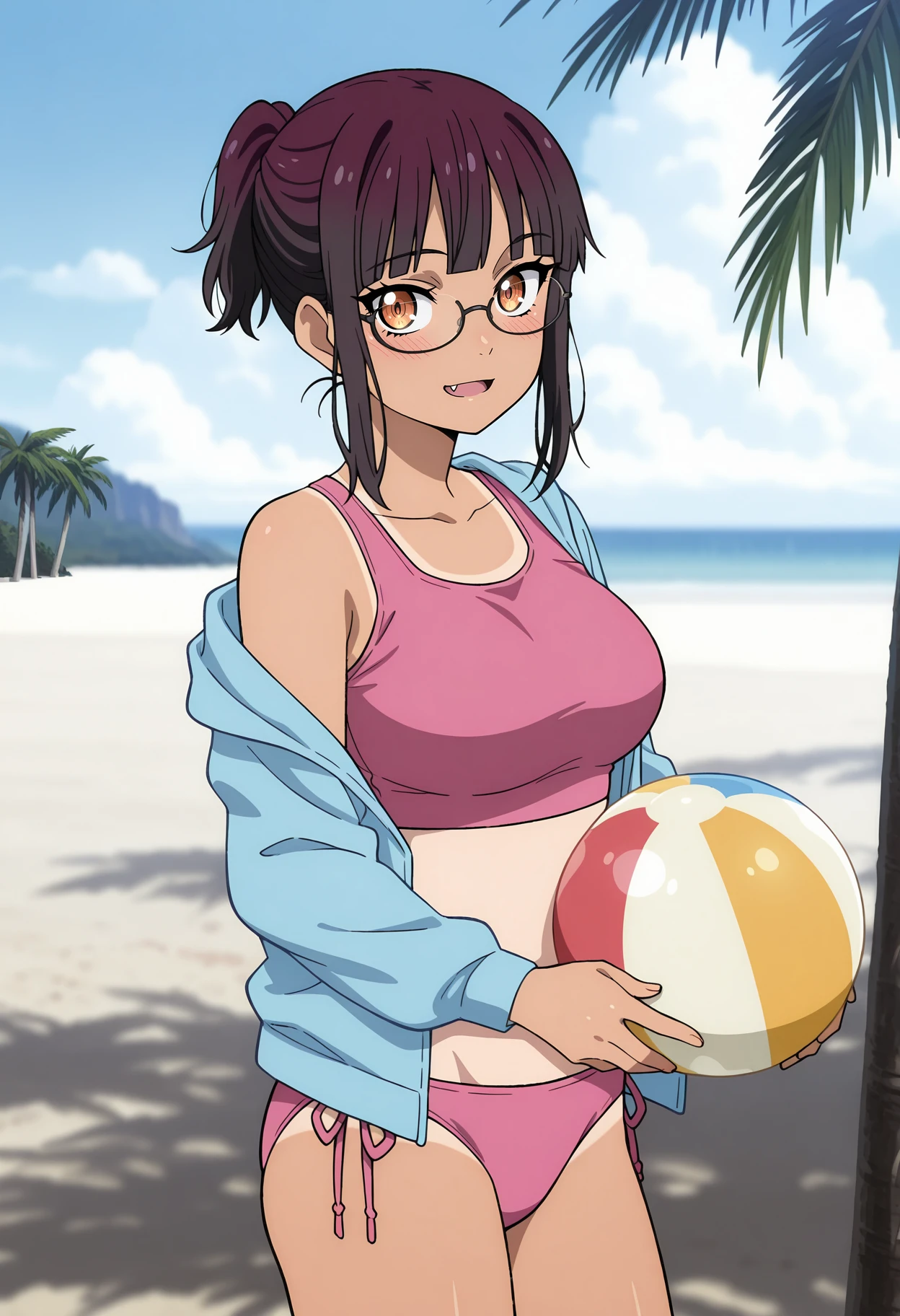 open jacket, blue jacket, tankini, pink bikini, medium breasts, tanlines, side-tie bikini bottom