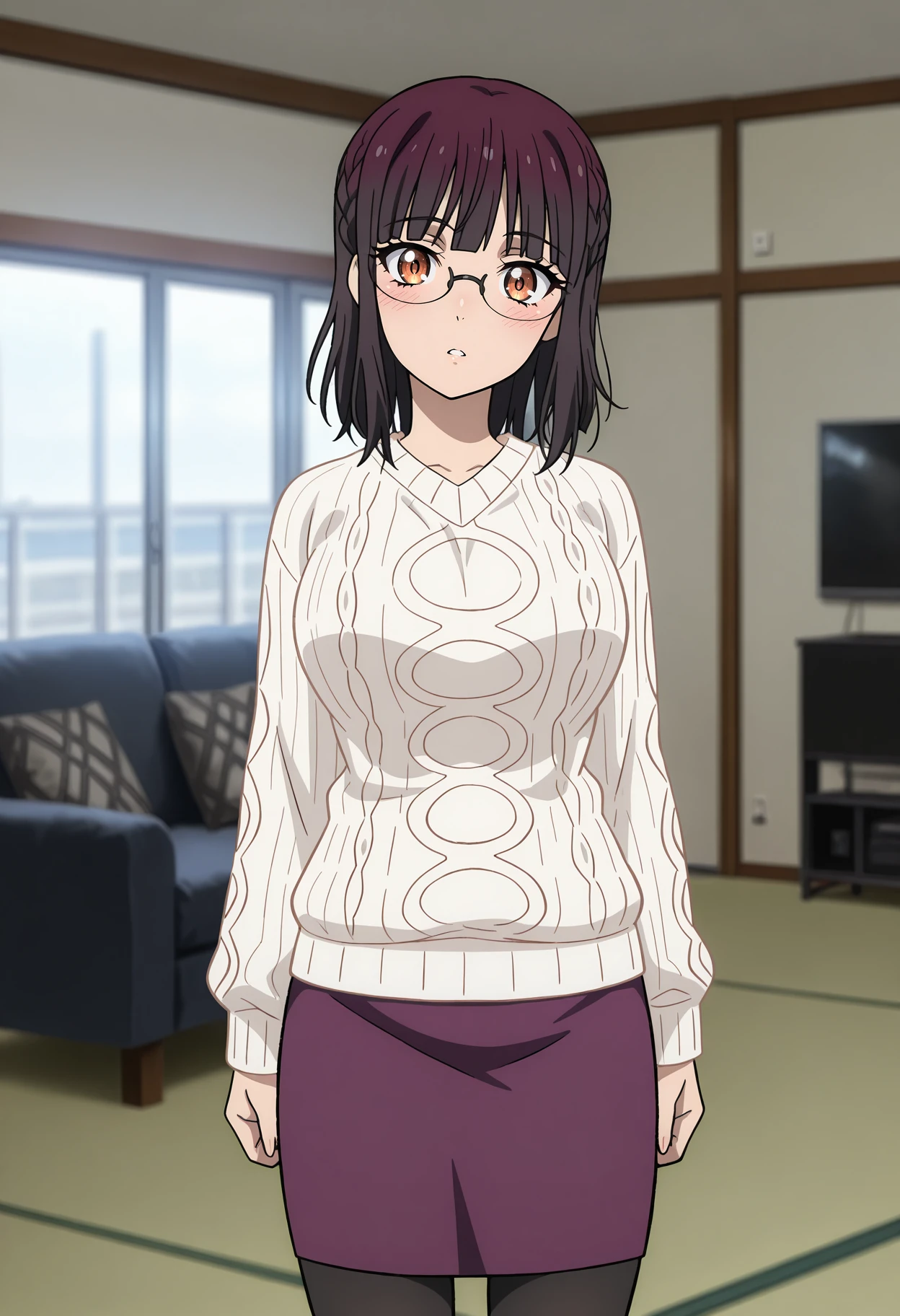 aran sweater, white sweater, pencil skirt, purple skirt, black pantyhose