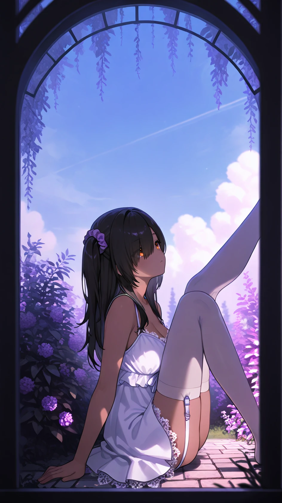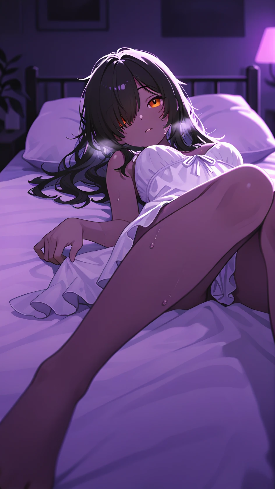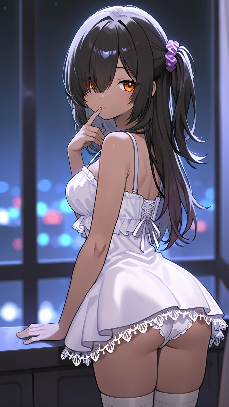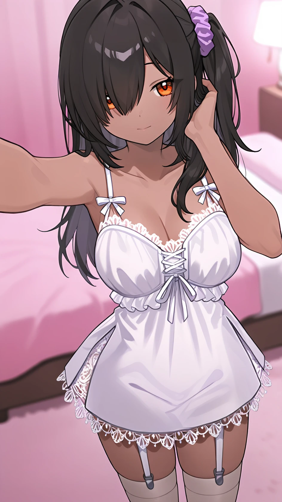 Example prompt : long hair, black hair, orange eyes, hair over one eye, bangs, dark-skinned female, large breasts, one side up, purple scrunchie, black nails,