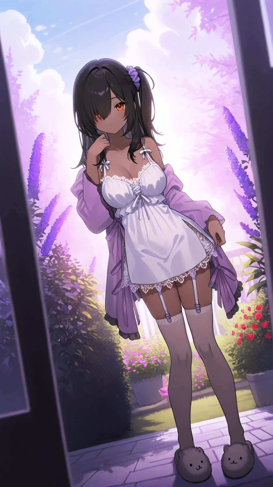 purple jacket, white dress, white thighhighs, slippers, grey slippers, frills, black frills, single garter strap, long sleeves,
