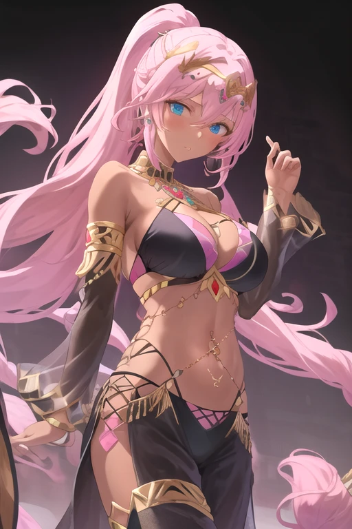 YarenaEchocalypse, 1girl, solo, absurdly long hair, blue eyes, large breasts, hair ornament, thighhighs, navel, cleavage, hair between eyes, jewelry, ponytail, pink hair, black bikini, detached sleeves, pants, dark-skinned female, see-through, circlet, navel piercing, dancer, harem outfit