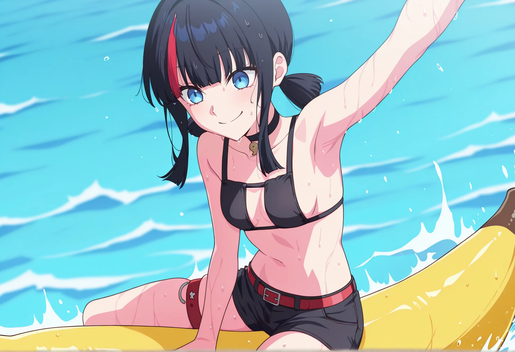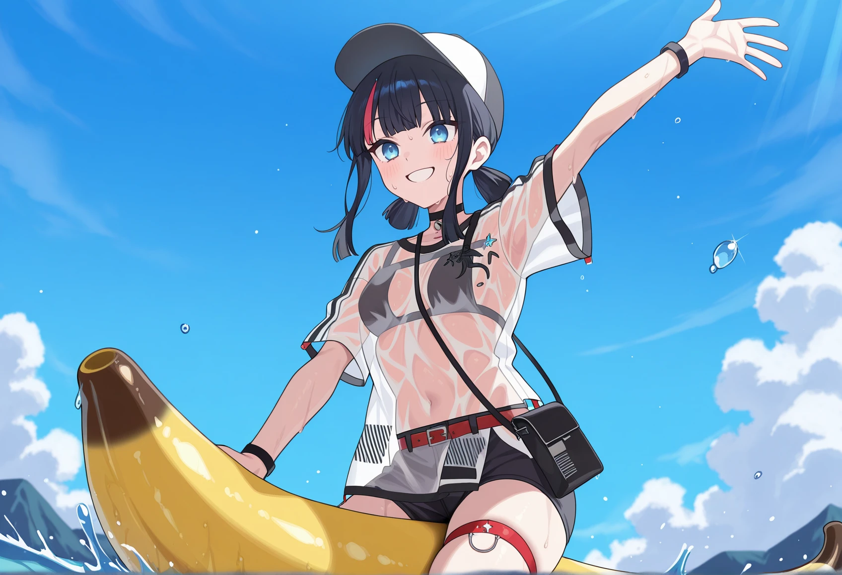 black hair, streaked hair, blue eyes, medium hair, sidelocks, low twintails, choker, see-through t-shirt, black bikini, shorts, belt, Thigh Strap, baseball cap